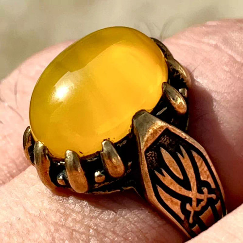 انگشتر عقیق زرد یمنی کهنه اصل رکاب اثر استاد محمد غفاری(ممی تبریز)،کلکسیونی کد ۱۴۰۶٬۵۰۰٬۰۰۰ تومان