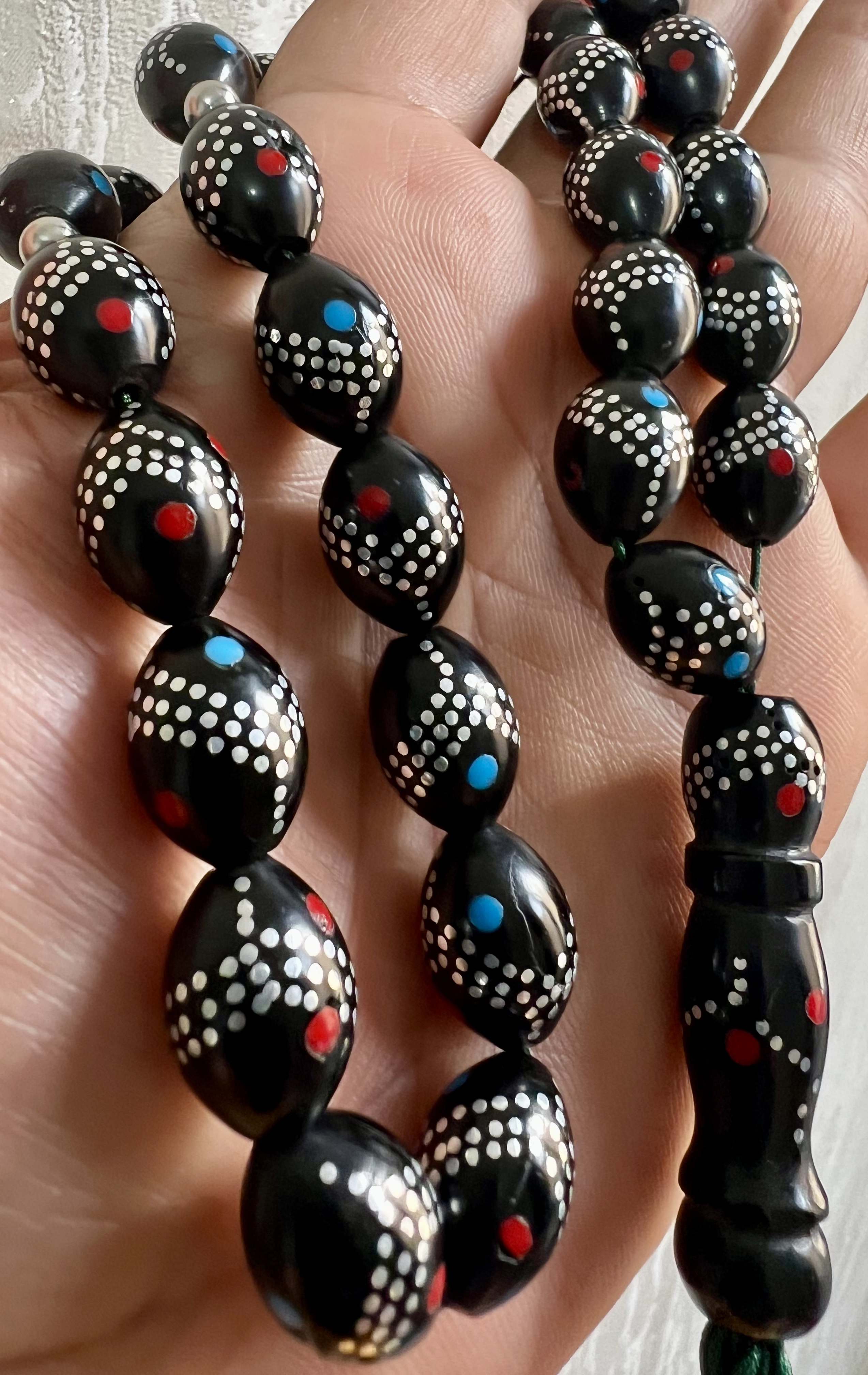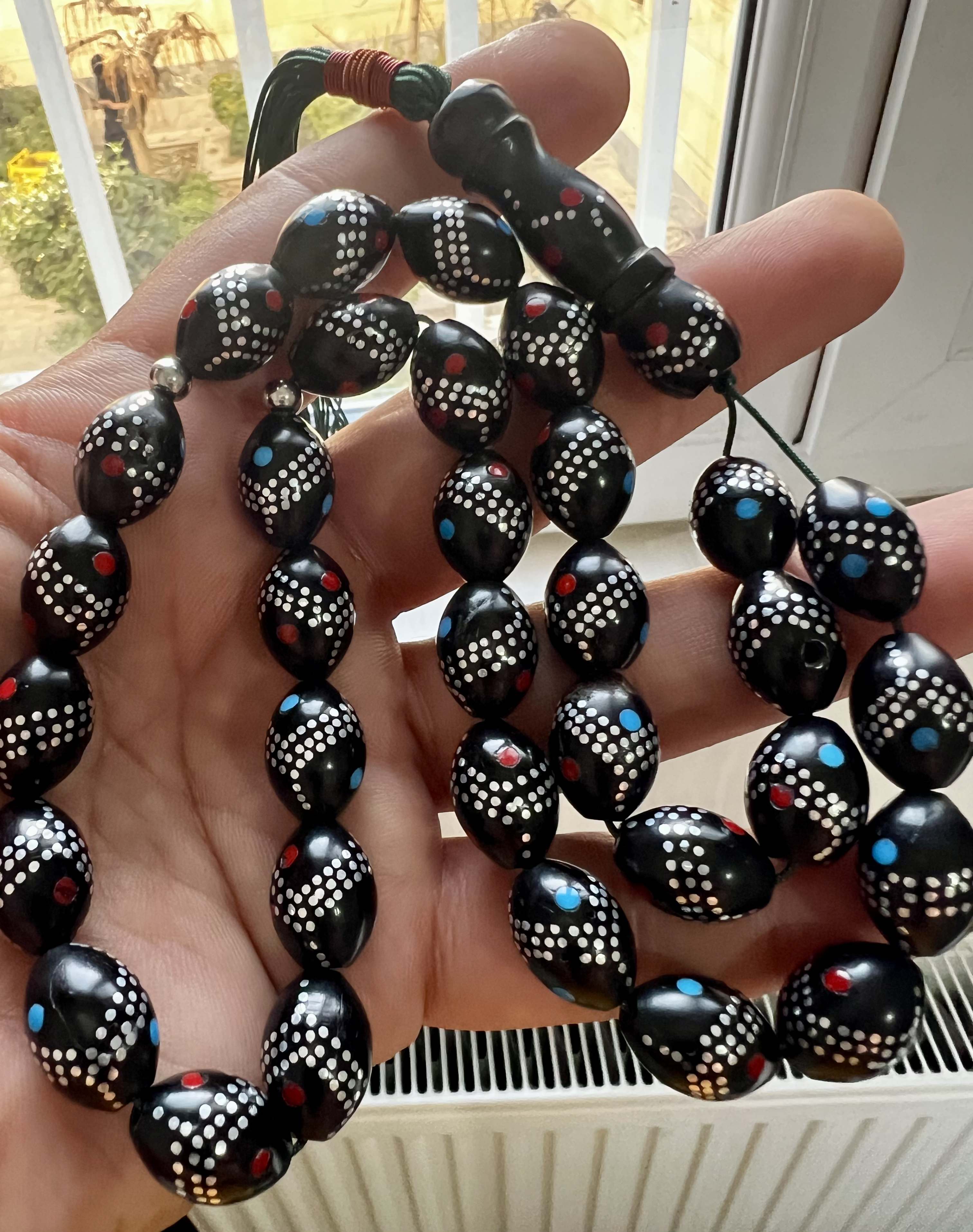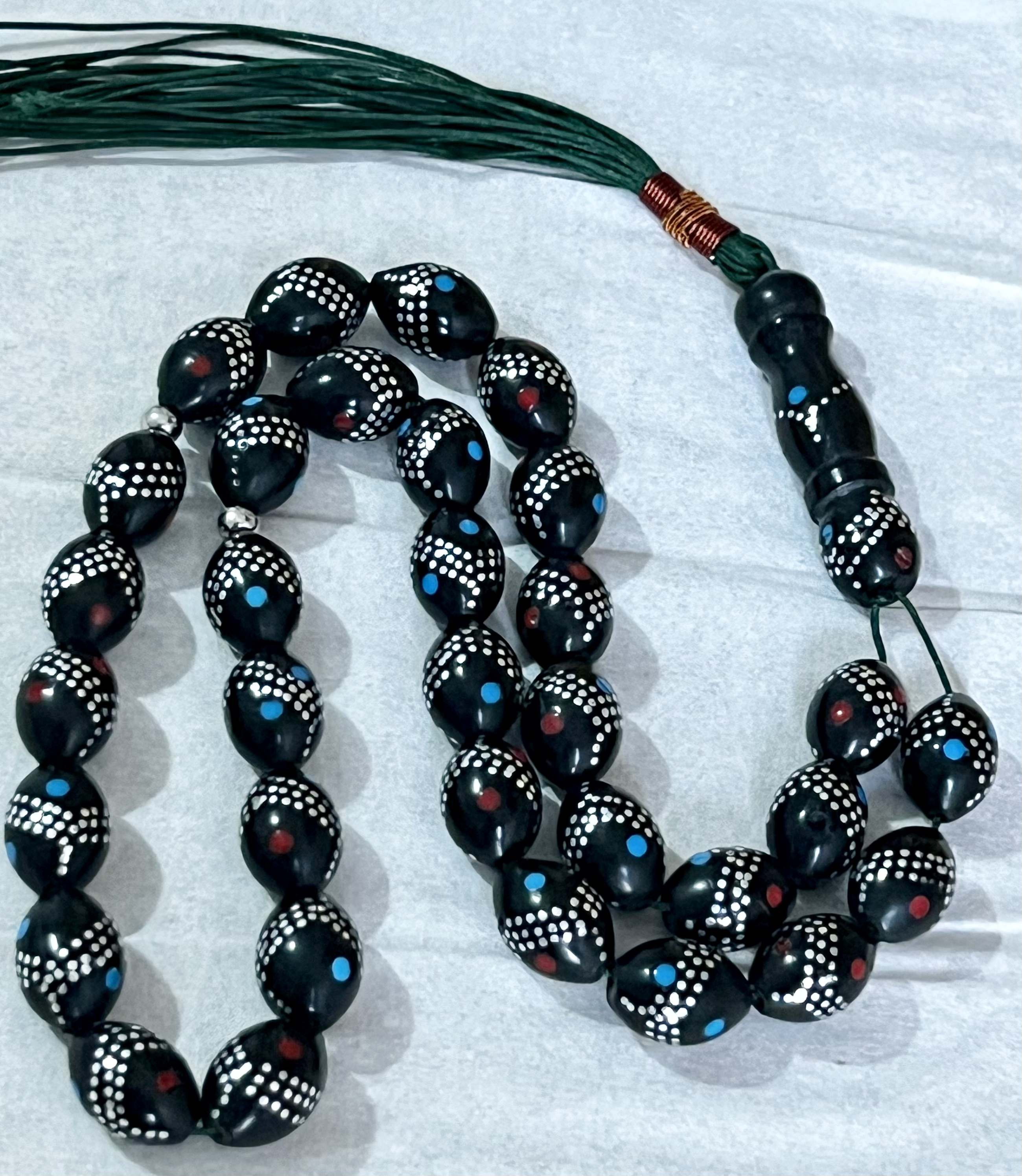 تسبیح یسر کهنه ، نقره کوبی شده و مرصع کاری شده ، بکر و سالم