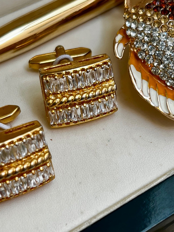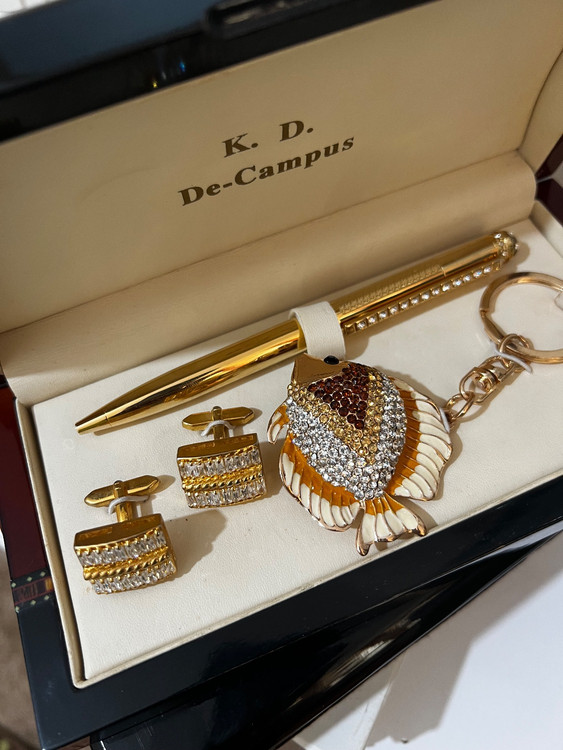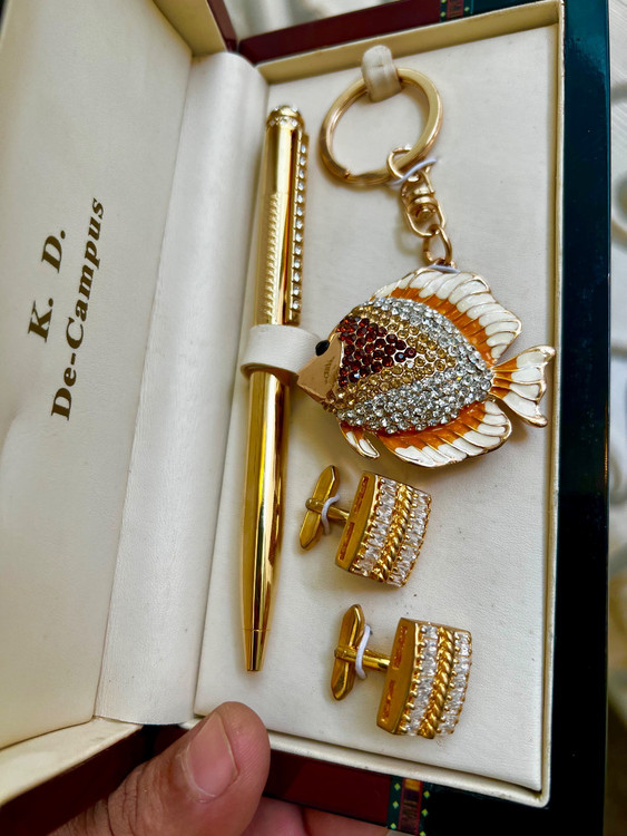 ست کادویی کلکسیونی مردانه استیل طلایی با جعبه منبت کاری شده