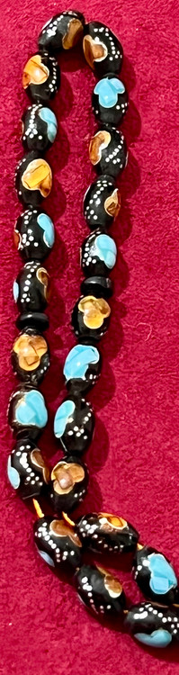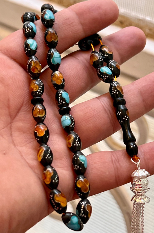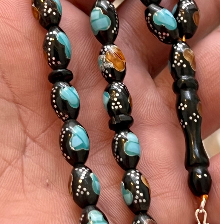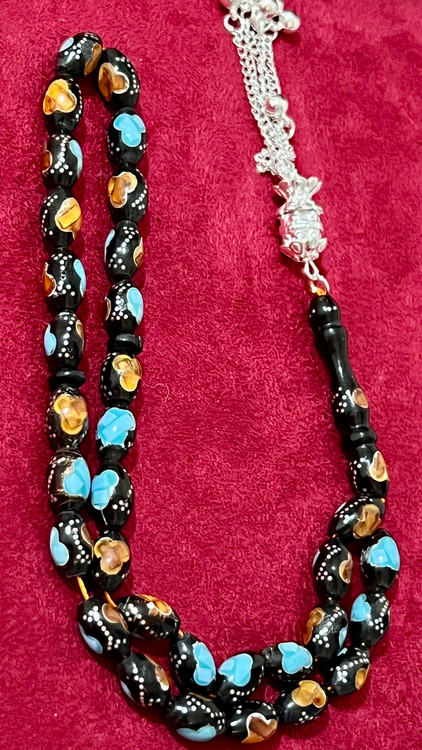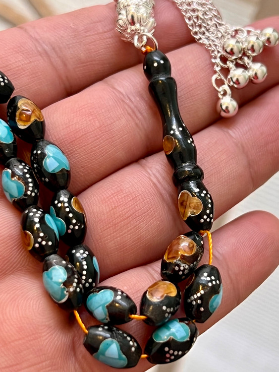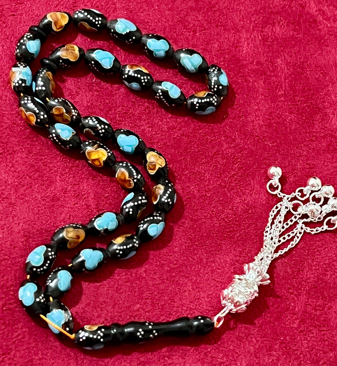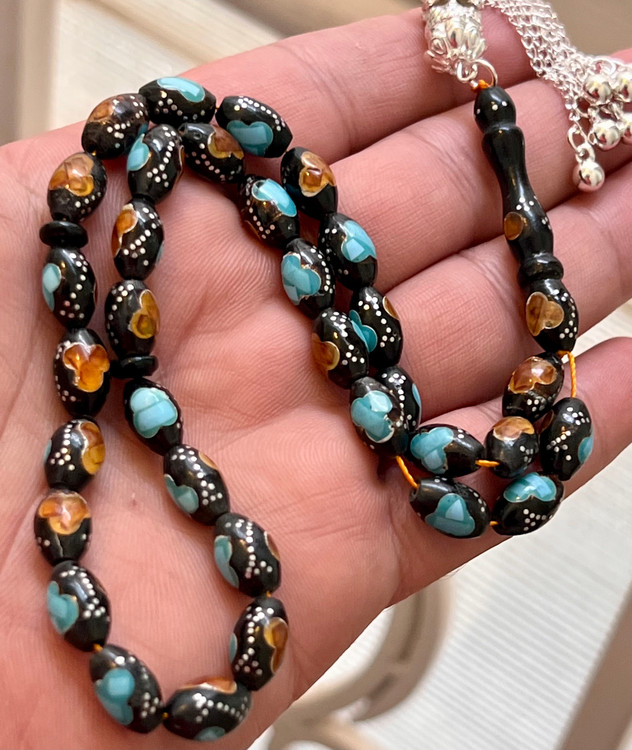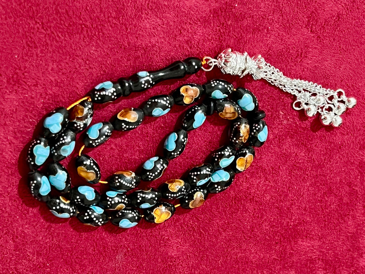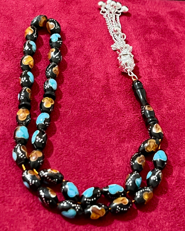 تسبیح یسر حجاز کهنه،کاملا اصل و بودار ،نقره کوب فیروزه و کهربا کوب