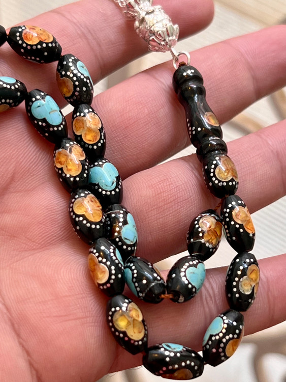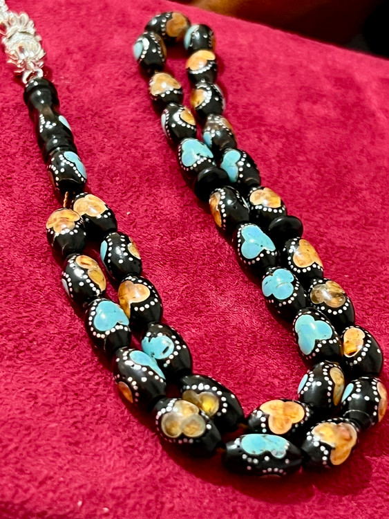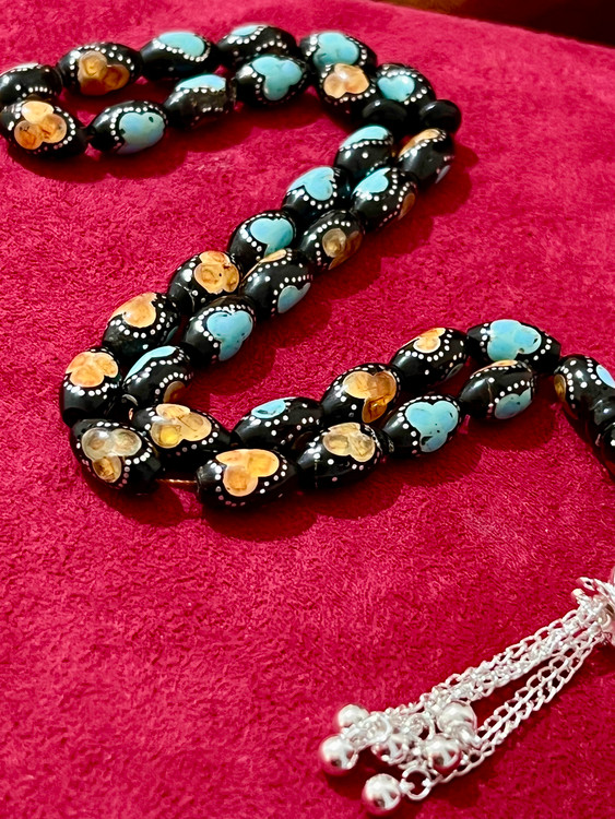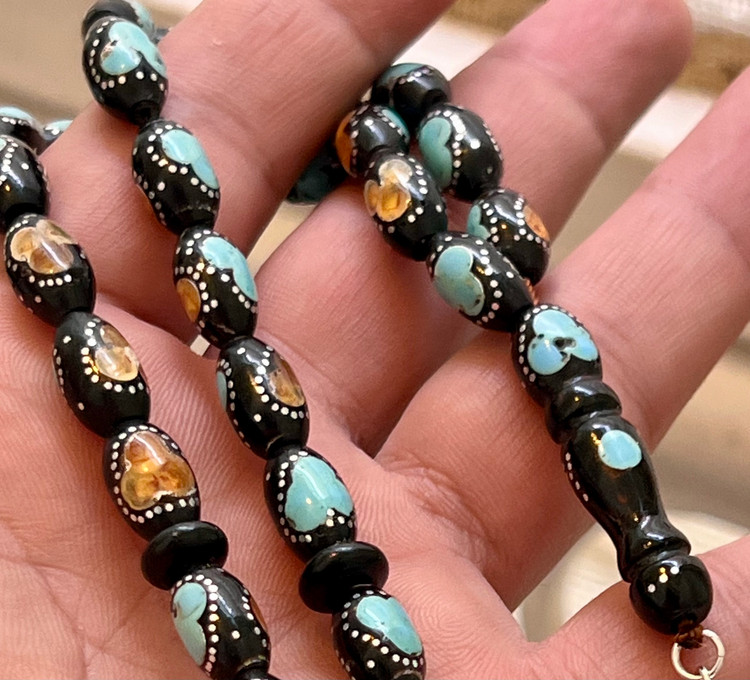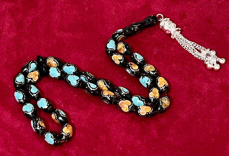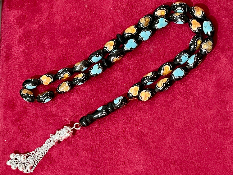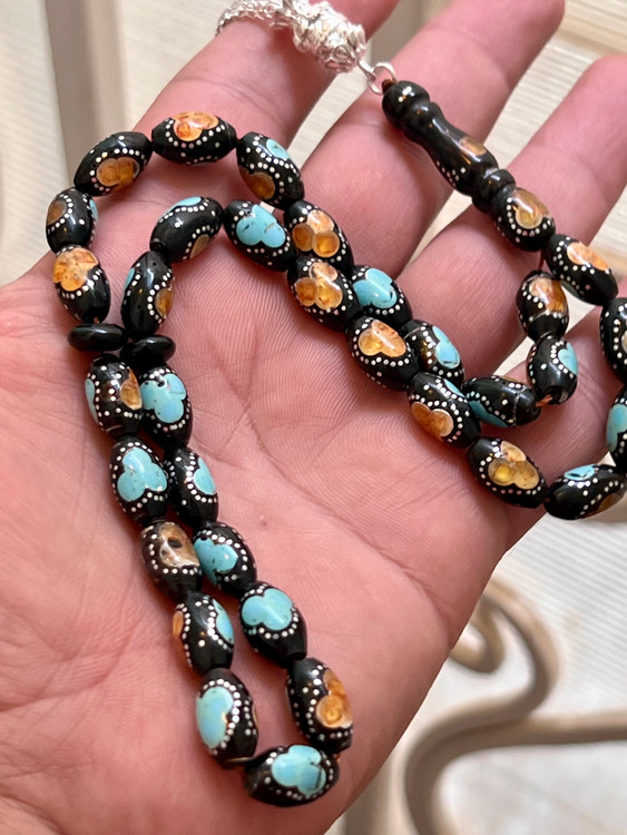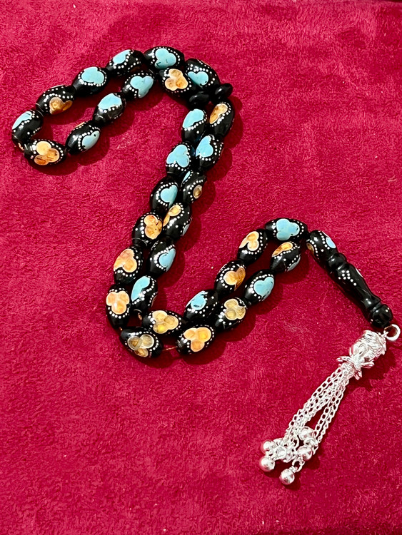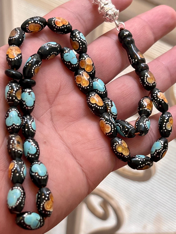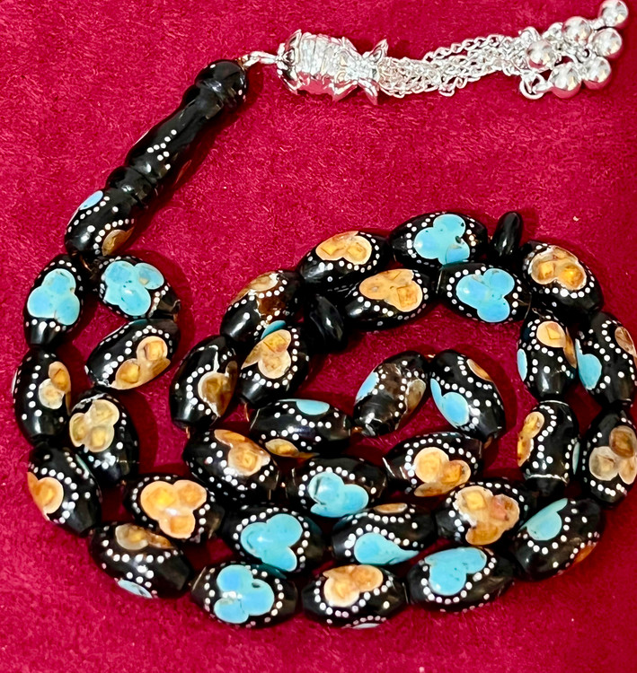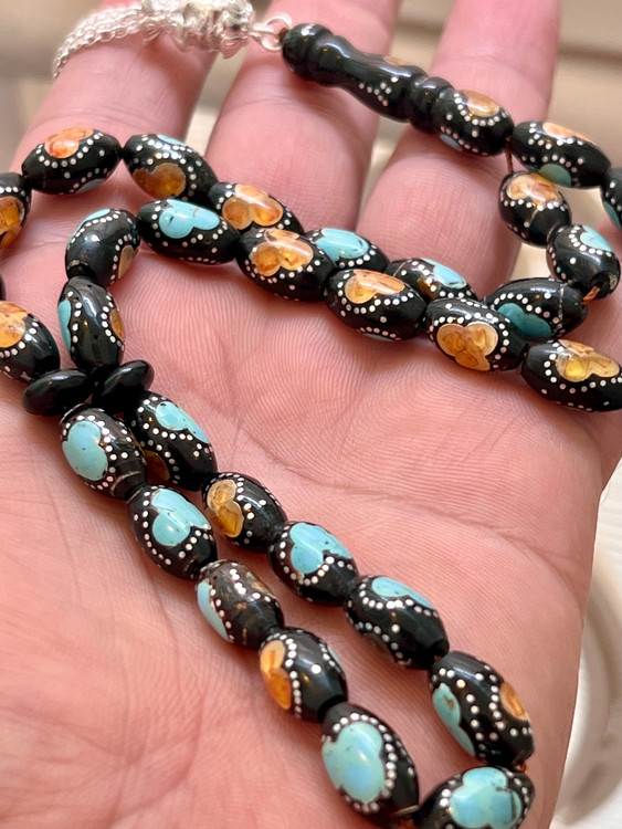 تسبیح یسر حجاز یا مکاوی کهنه، اصل و بودار ، فیروزه ،نقره و کهربا کوب