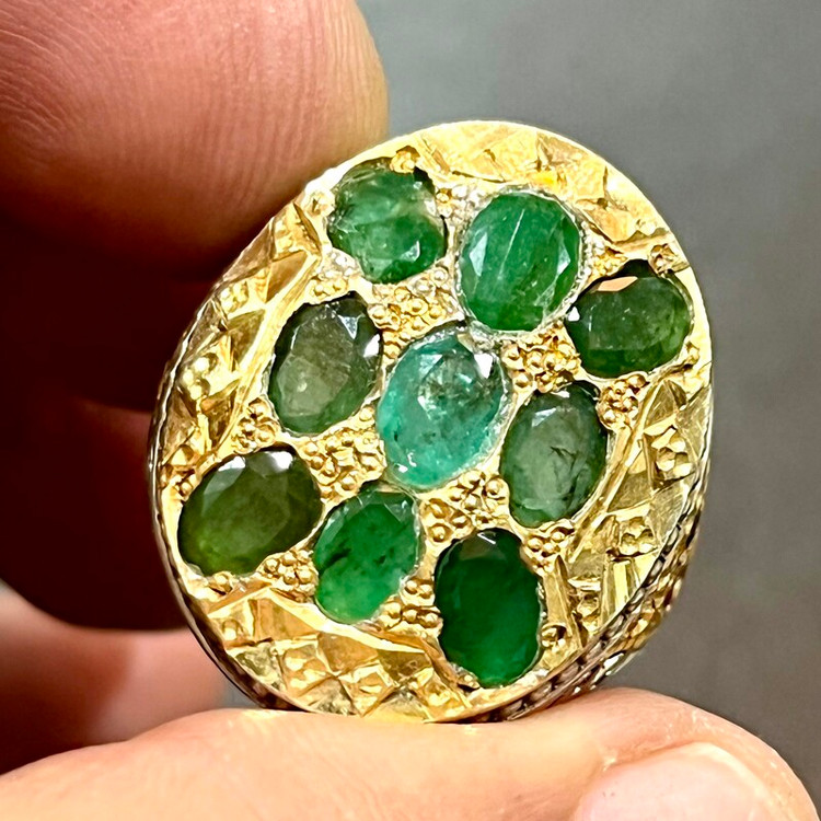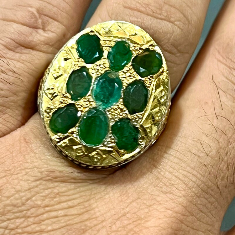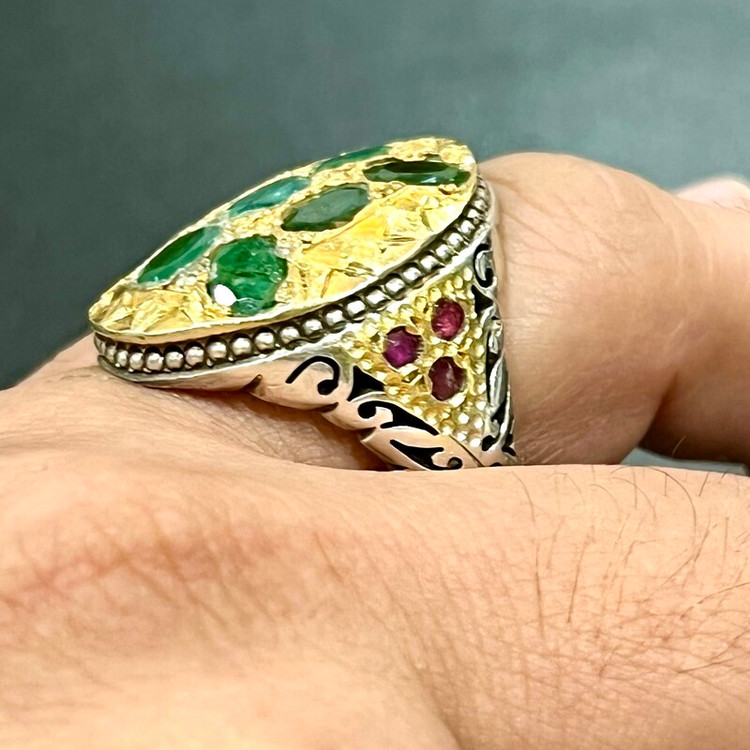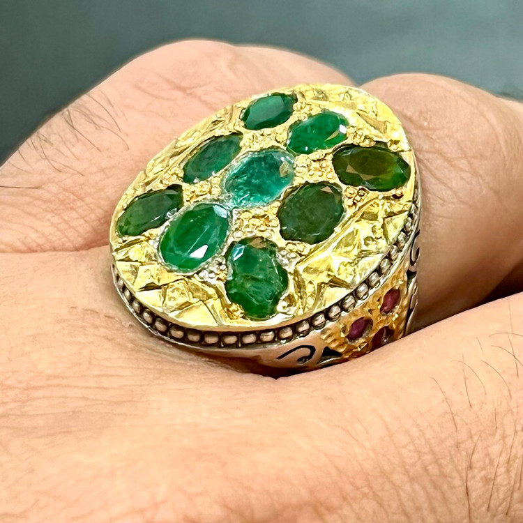 انگشتر زمرد جواهری رکاب سلطنتی دست ساز و خاص نقره ۹۲۵ به وزن ۲۸ گرم ۹ قطعه جواهر زمرد زامبیا معدنی و طبیعی بدون بهسازی رنگ وزن مجموع زمردها حدود ۱۰ قیراط مخراج ۶ عدد یاقوت سرخ آفریقایی رکاب طرح سلطنتی تمام کار دست استاد رجبی فاخر و خاص سایز ۶۵