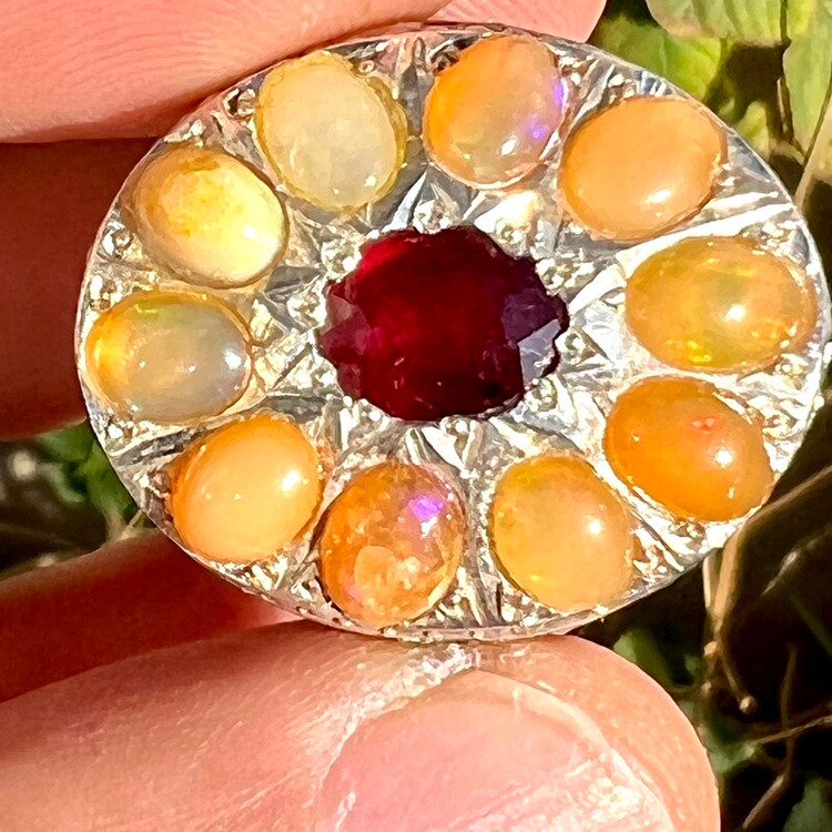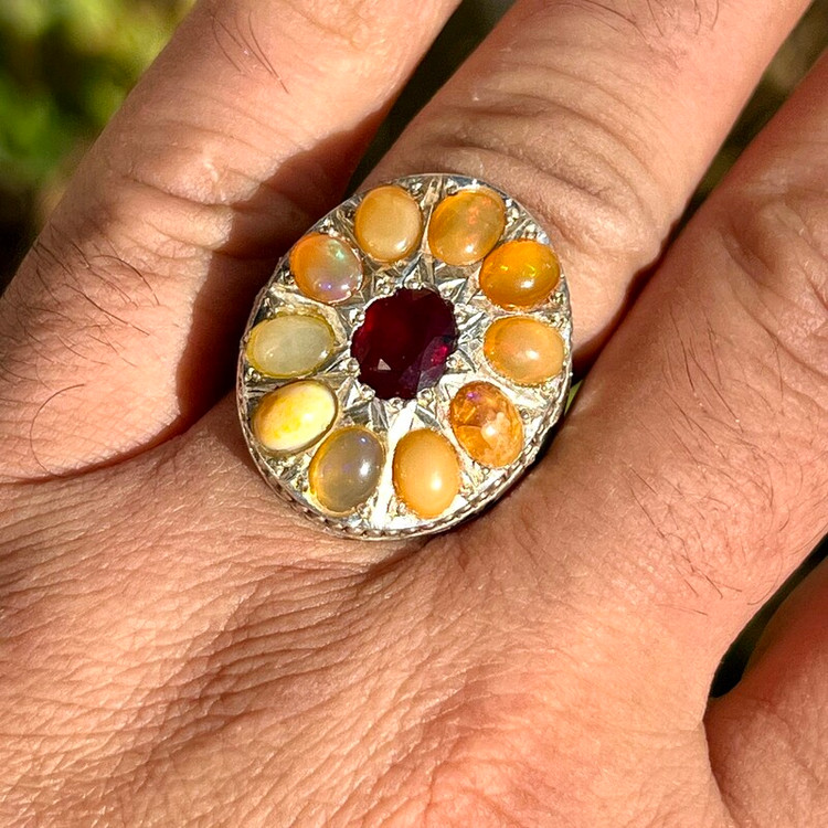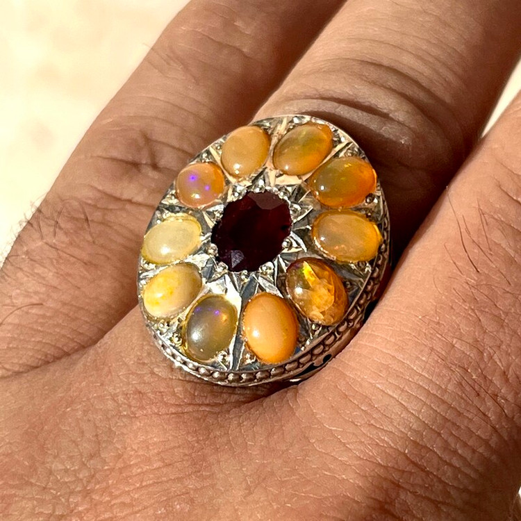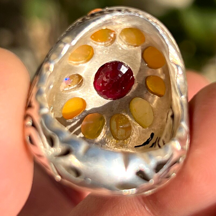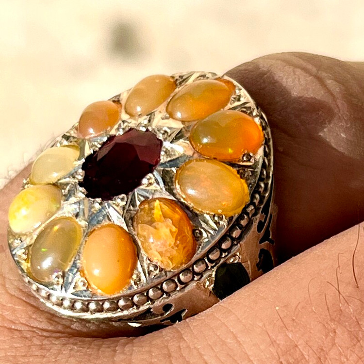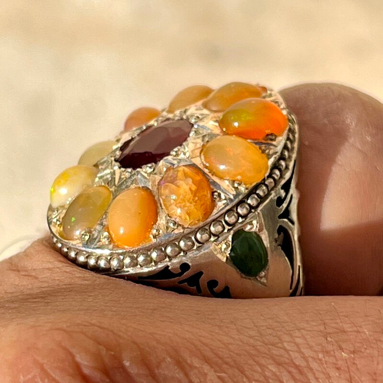 انگشتر جواهری رکاب سلطنتی انگشتر نقره 925 وزن 32 گرم 10 عدد اپال ااتیوپی یک قیراطی یاقوت سرخ آفریقایی 2 قیراطی رکاب کار دست طرح سلطنتی استاد احمد بخشی مخراج 2 عدد زمرد زامبیا روی رکاب سایز 63 -64 جواهری و فاخر