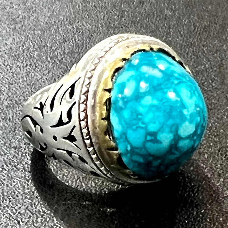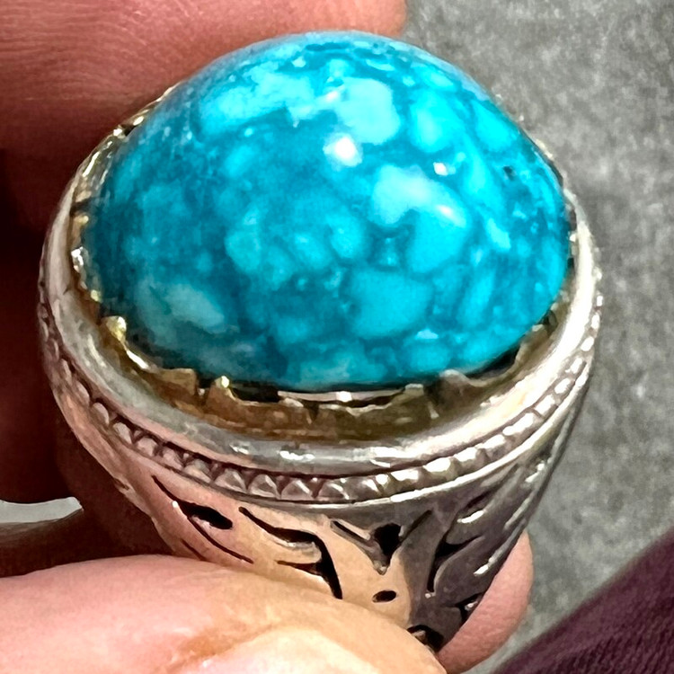 فیروزه درشت و کلکسیونی دامغان انگشتر نقره ۹۲۵ وزن ۳۱ گرم سنگ فیروزه معدنی دامغان کلکسیونی و کم نظیر تراش دامله ابعاد ۲ در ۱/۴ ارتفاع سنگ ۱/۲ سانت رکاب تماما دست ساز با مهر اصالت سازنده سایز ۶۴-۶۵