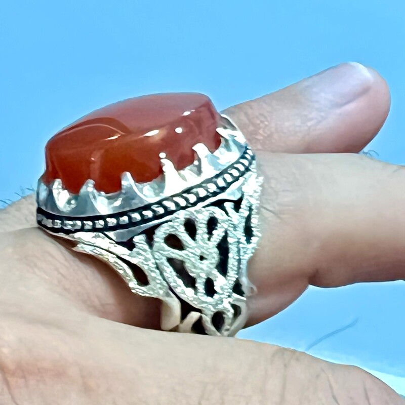 متاسفانه این کالا در حال حاضر موجود نیست. میتوانید از طریق لیست بالای صفحه، از محصولات مشابه این کالا دیدن نمایید.عقیق یمنی درشت و قواره دار انگشتر نقره ۹۲۵ وزن ۲۷ گرم عقیق درشت معدنی یمنی پرتقالی ، تراش یمنی رکاب تماما کار دست انگشتر خاص و فاخر سایز ۶۵