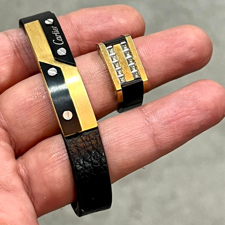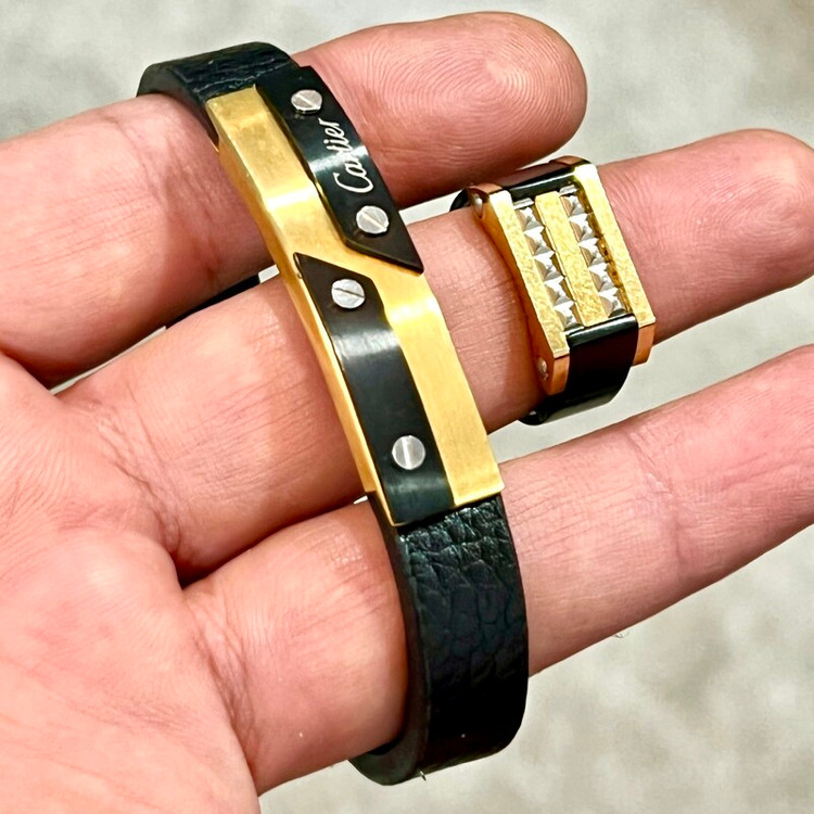 ست انگشتر و دستبند کارتیر چرم و استیل رنگ ثابت