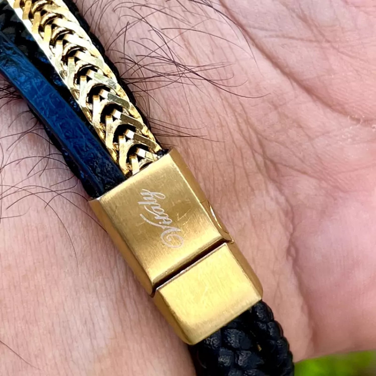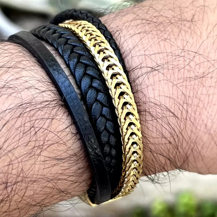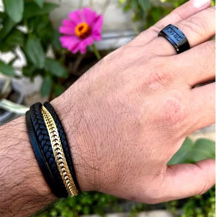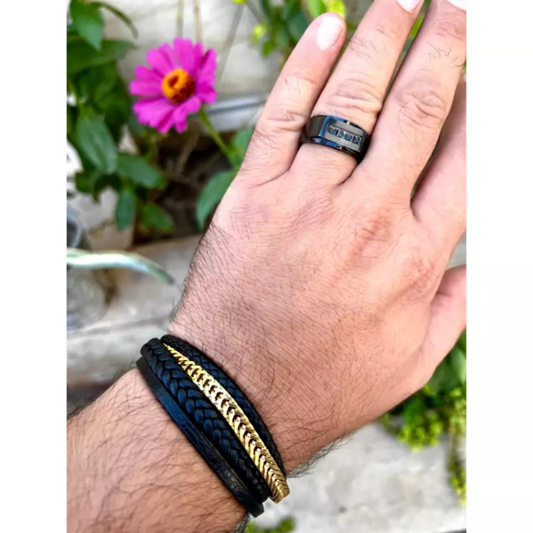 ست استیل مردانه ایتالیایی برند ویتالی رنگ ثابت دستبند چرم - استیل برند ویتالی طول دستبند 20 سانت انگشتر استیل مشکی ویتالی سایز 63