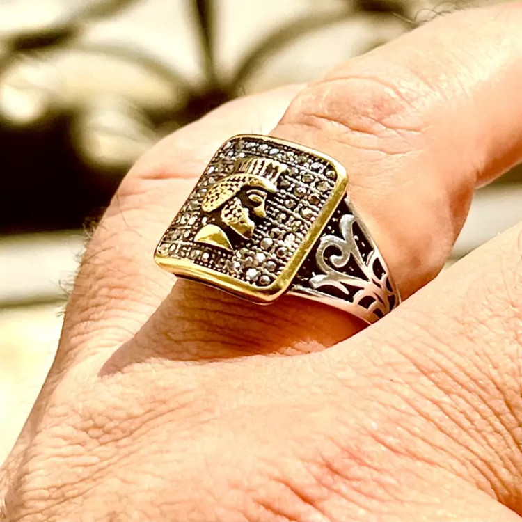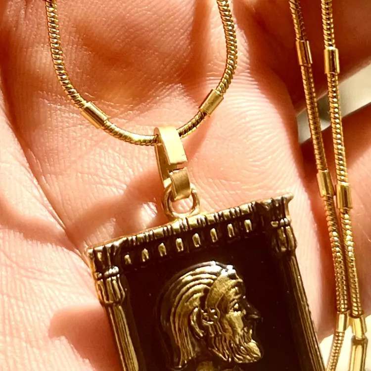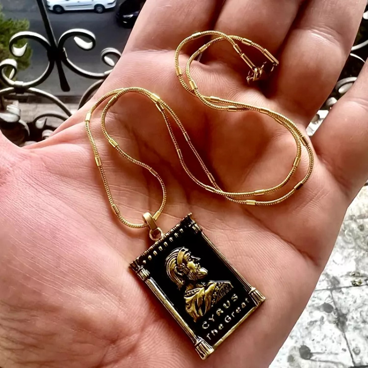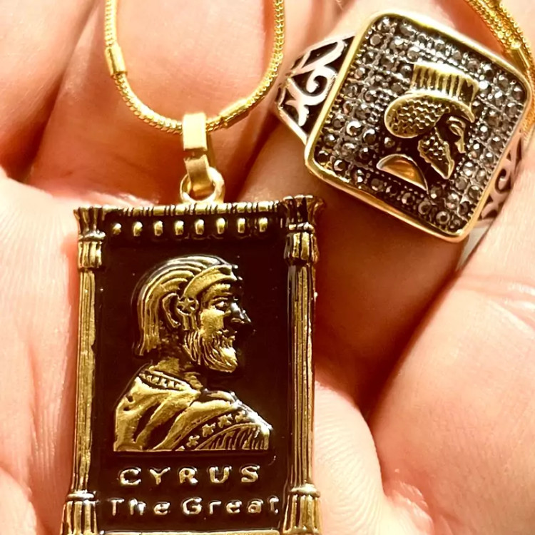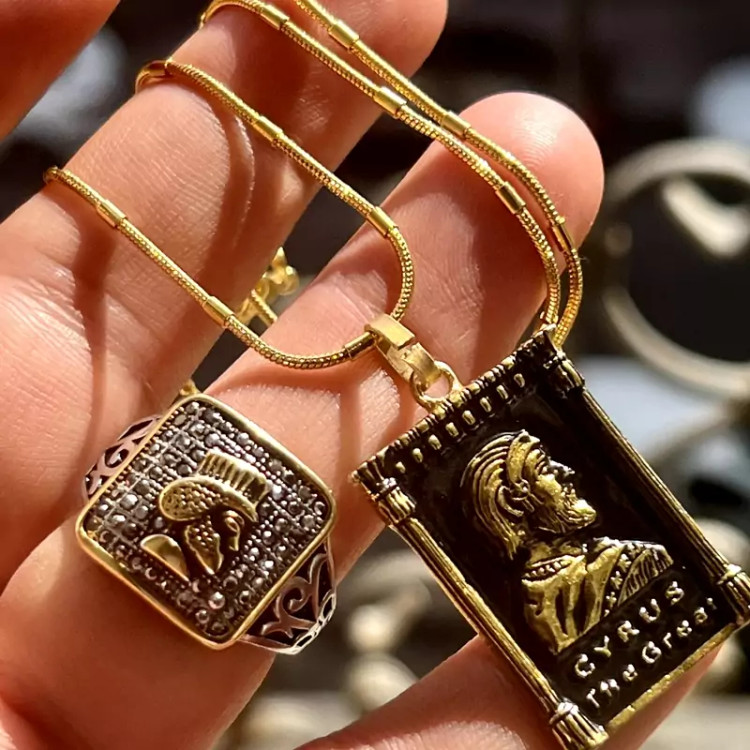 ست زیبای شاهان هخامنشی زنجیر و پلاک و انگشتر استیل رنگ کاملا ثابت ست مردانه زنجیر استیل طلایی 50 سانتی طرح خاص پلاک استیل طلایی رخ کوروش بزرگ بصورت برجسته و سیاه قلم انگشتر استیل مردانه رخ برجسته داریوش بزرگ سایز 64