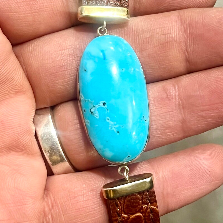 فیروزه ۴ سانتی کرمان دستبند چرمی با سنگ فیروزه درشت فیروزه عجمی معدنی اصیل کرمان ۴ در ۱/۷ سانت مغز فیروزه وزن ۴۰ گرم بند چرم اعلا قسمتهای فلزی استیل طلایی رنگ ثابت به شرط فیروزه معدنی کرمان تقدیم میشود بند قابل تنظیم برای هر سایزی اسپرت