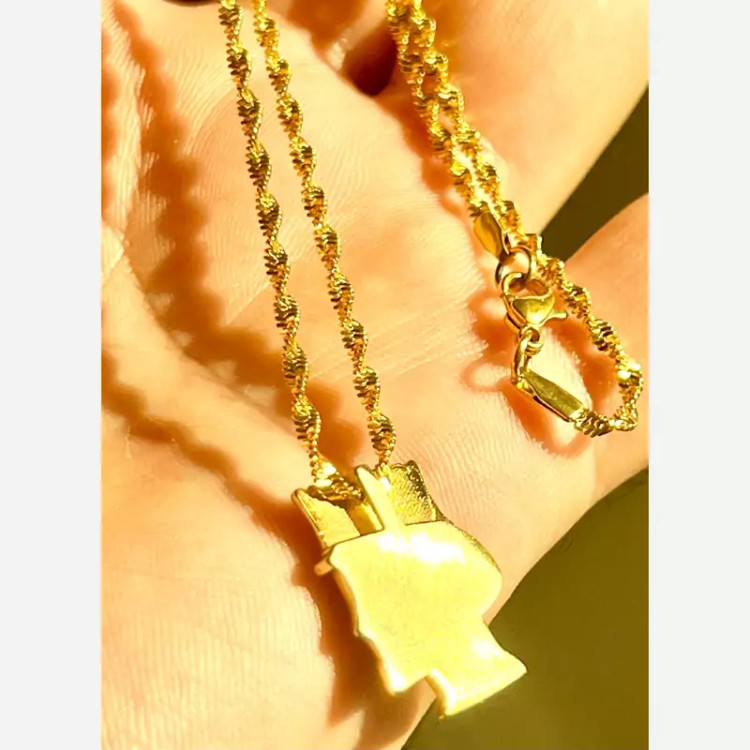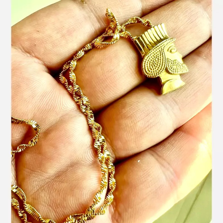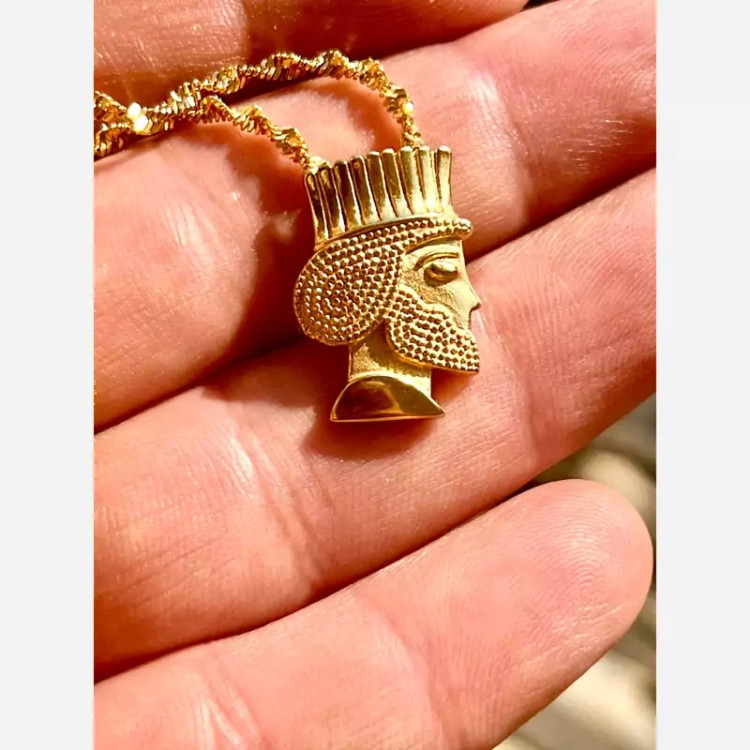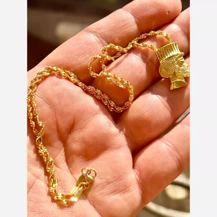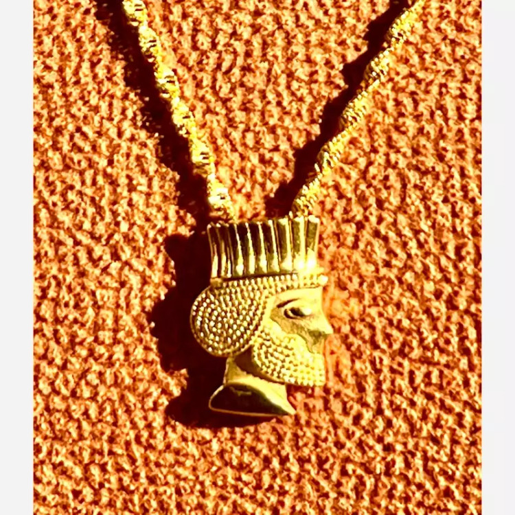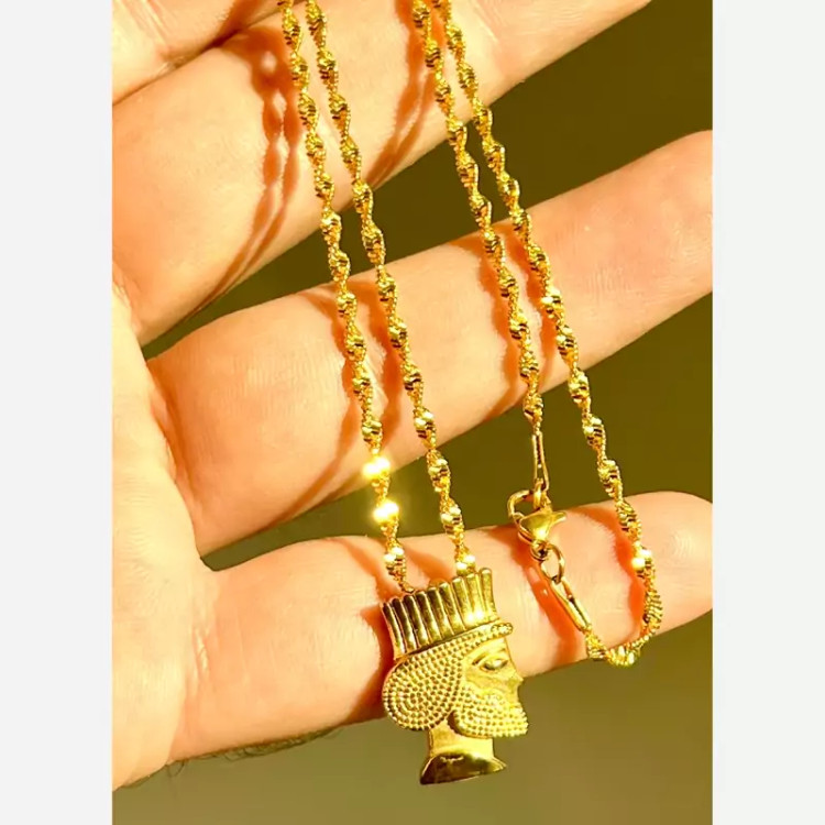 زنجیر و پلاک استیل طلایی ژوپینگ با آبکاری طلا اسپرت و خاص وزن کل حدود 10 گرم زنجیر استیل طلایی ژوپینگ طرح پیچ خورده با آب کاری طلا طول زنجیر 45 سانت پلاک سردیس داریوش بزرگ استیل طلایی با آب کاری طلا رنگ کاملا ثابت
