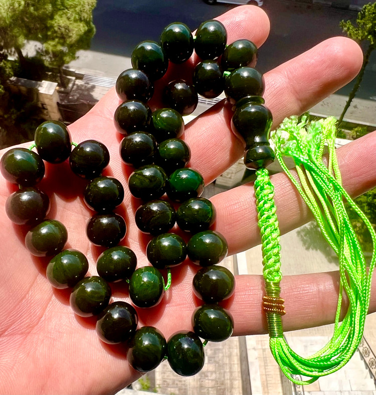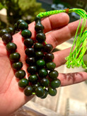 تسبیح کهربای سبز لجنی از شمش سری اول قدمت ۱۵ ساله کد ۱۴۳