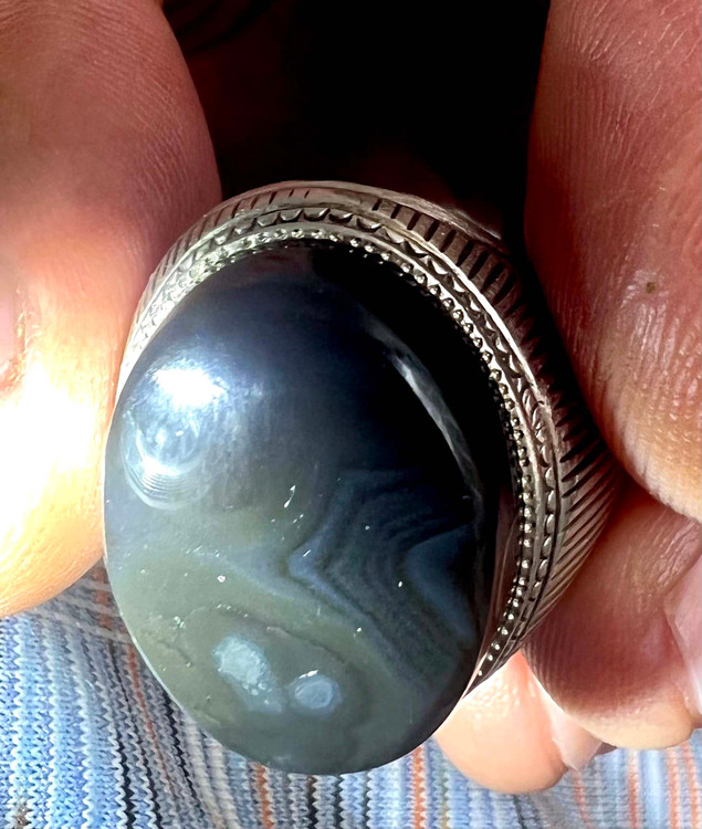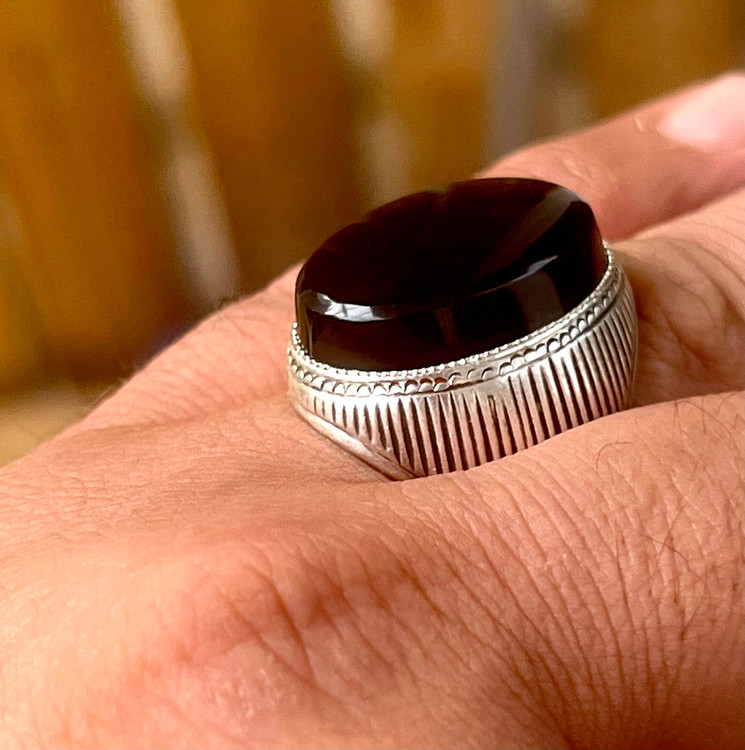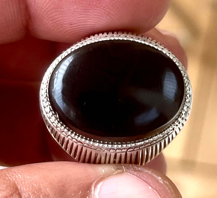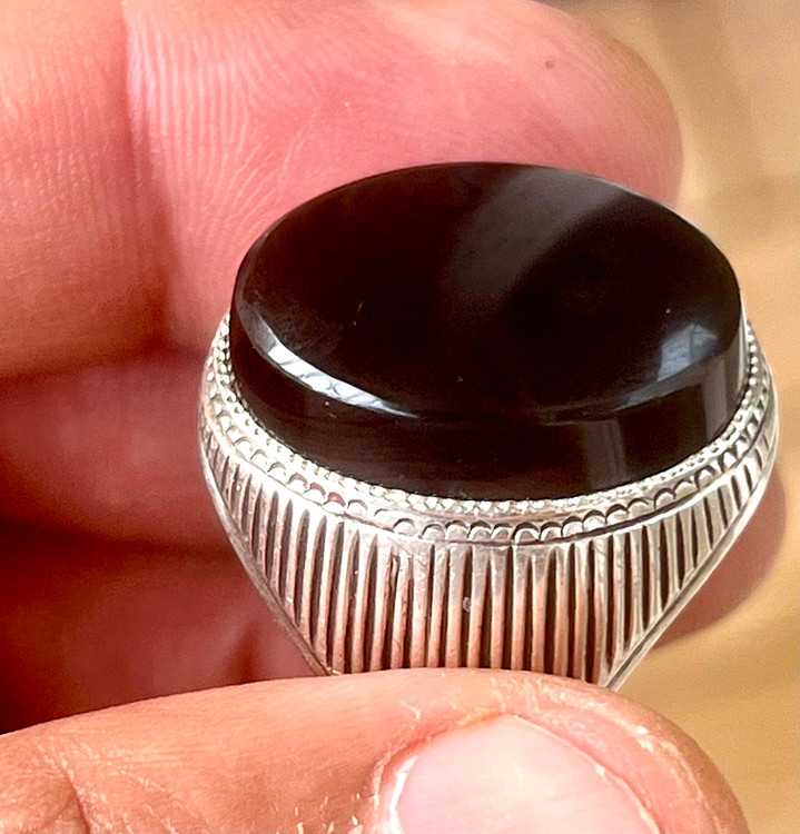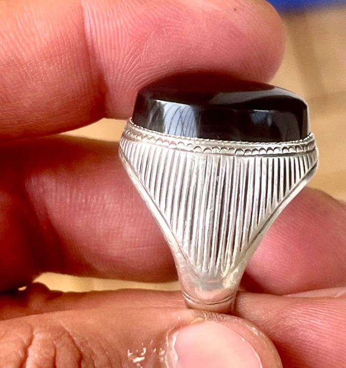 انگشتر عقیق سیاه معدنی با رگه های سلیمانی رکاب دستی کهنه کد ۱۸۳