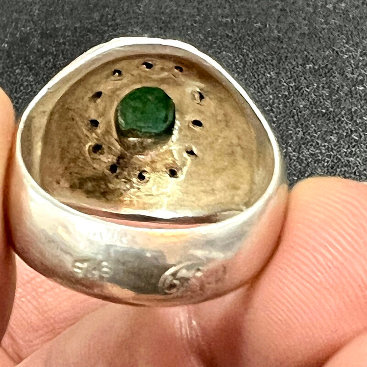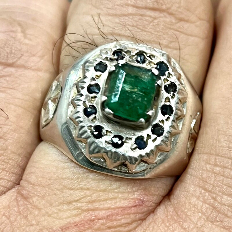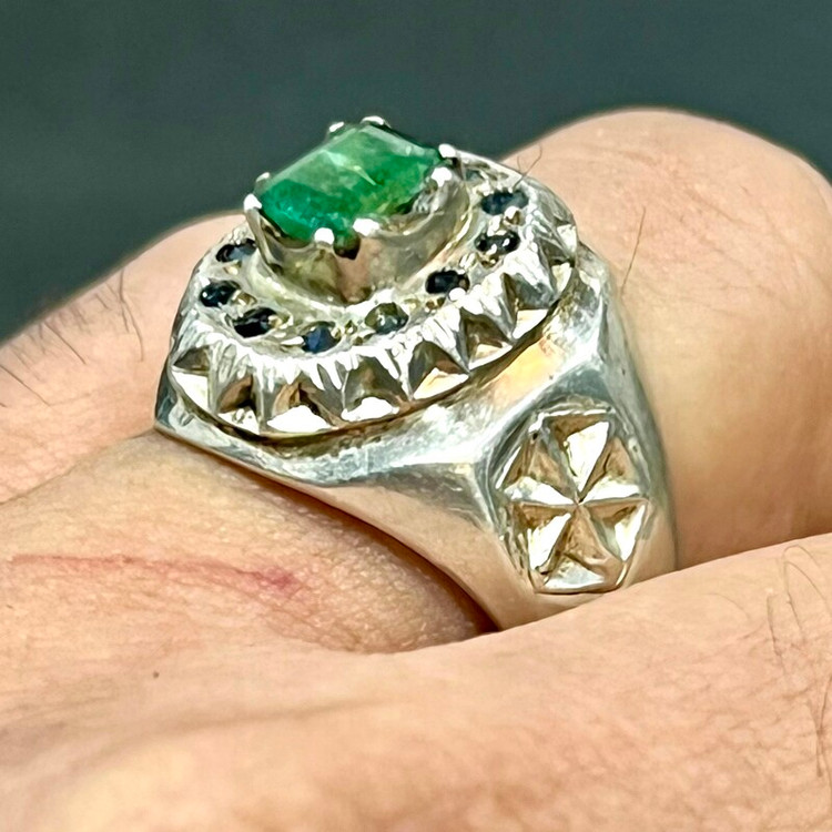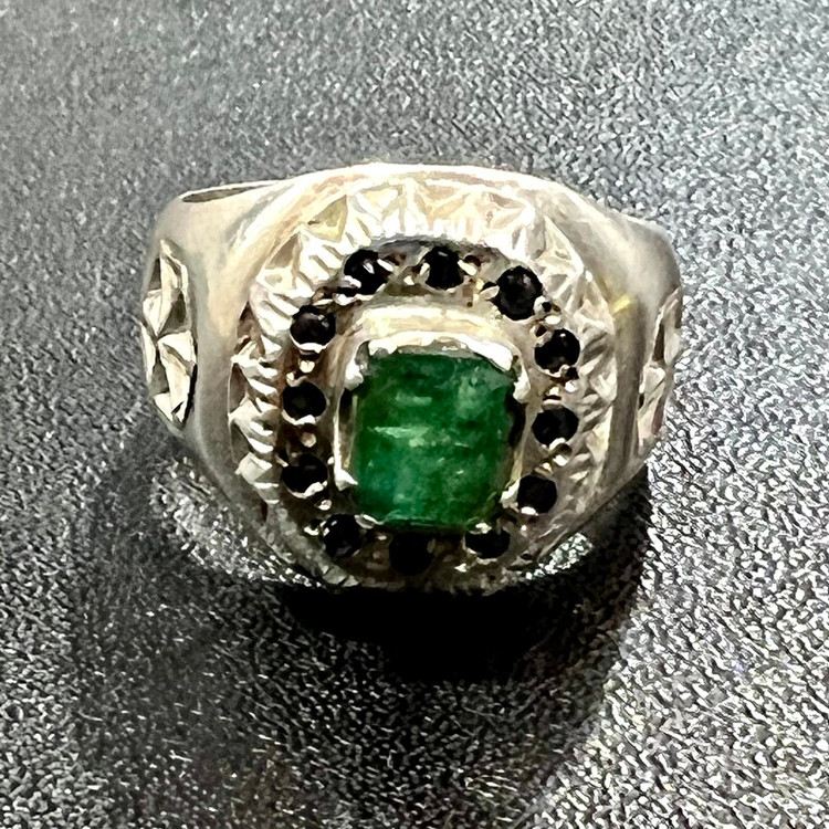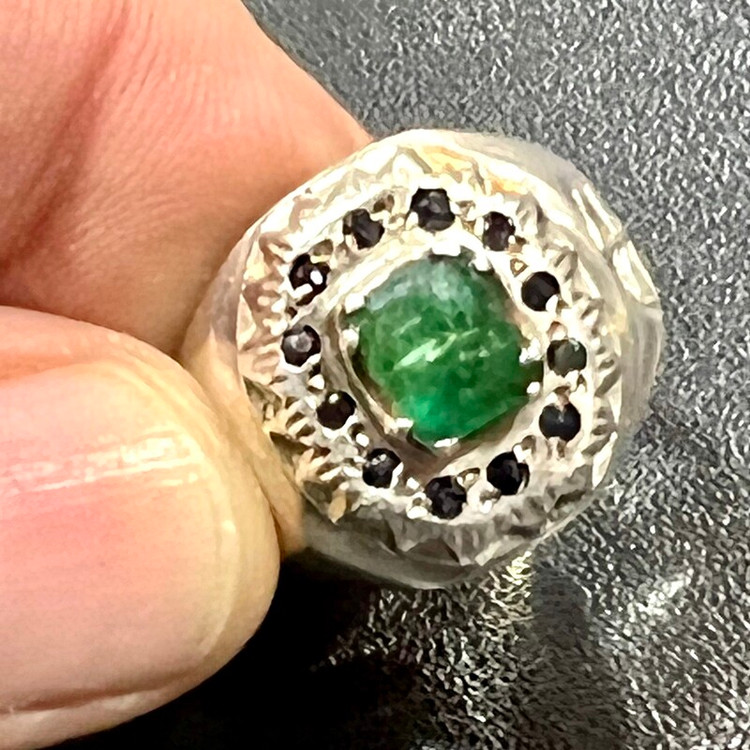 زمرد زامبیای معدنی خوشرنگ انگشتر نقره ۹۲۵ وزن ۱۷ گرم گوهر زمرد معدنی زامبیا به وزن ۱/۵ قیراط رکاب تماما کار دست استاد امیری کار فاخر و قدیمی سایز ۶۴ -۶۵