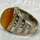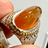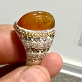 عقیق یمنی زرد تیغ آب کلکسیونی انگشتر نقره ۹۲۵ وزن ۲۵ گرم عقیق معدنی یمنی اصیل زرد عسلی فوق آبدار تراش عبدالرزاقی کار فاخر و کلکسیونی رکاب تماما کار دست استاد سروش آینه کاری و گوارسه زنی خاص سایز ۶۵
