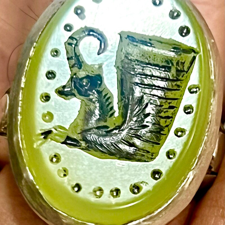 عقیق سبز کاهویی خوشرنگ ابعاد ۲/۵ در ۱/۸ سنگ معدنی خوشرنگ نشان جدید و مربوط به حدود ۴۰ سال قبل میباشد ولی بسیار دقیق و فنی حک شده نشان ریتون