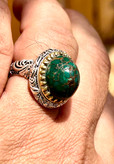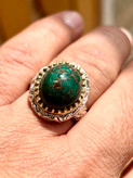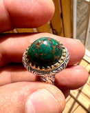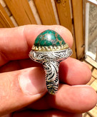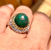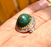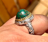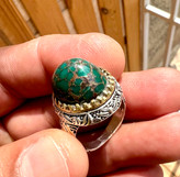 انگشتر فیروزه نیشابوری سبز رگه طلایی معدنی و کاملا اصل با رکاب قلم برجسته خاص کد ۲۷۶