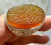 عقیق جز یمنی اعلا درشت و خوشرنگ قواره درشت به ابعاد ۳ در ۸ / ۱ سانتیمتر خط قدیمی سید عباس ضابطی با امضای پشت عقیق دعای متبرک ناد علی