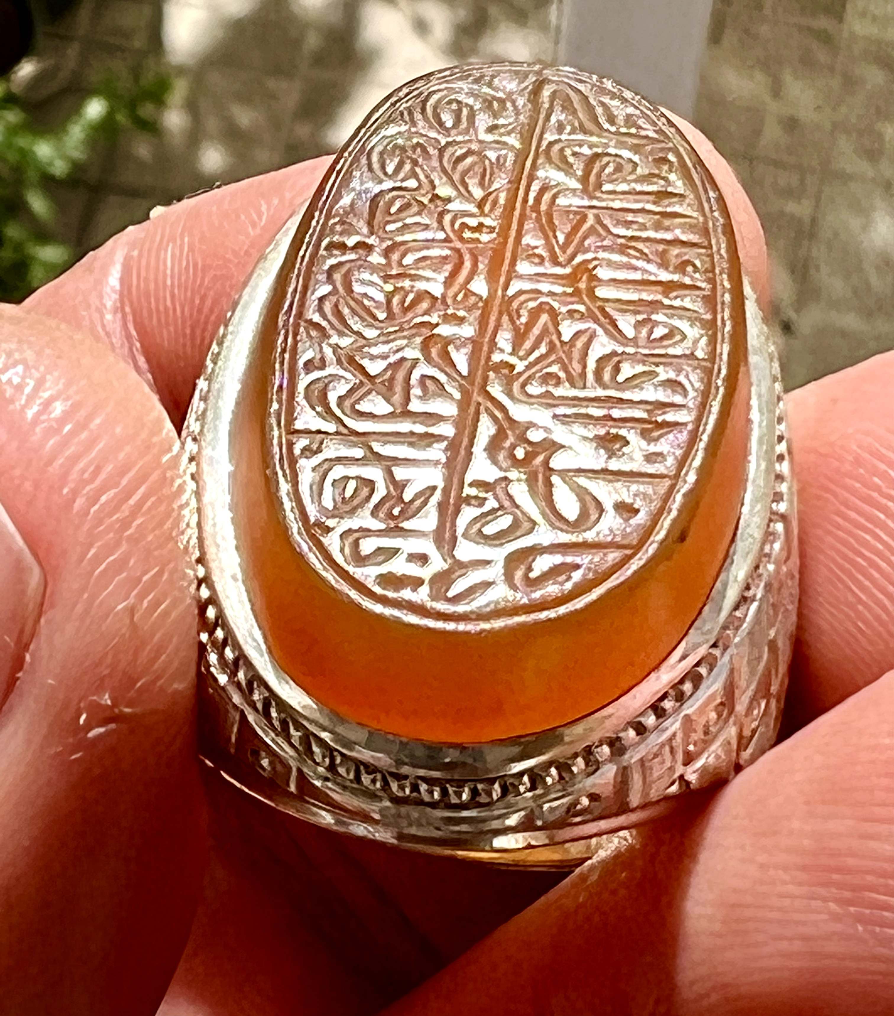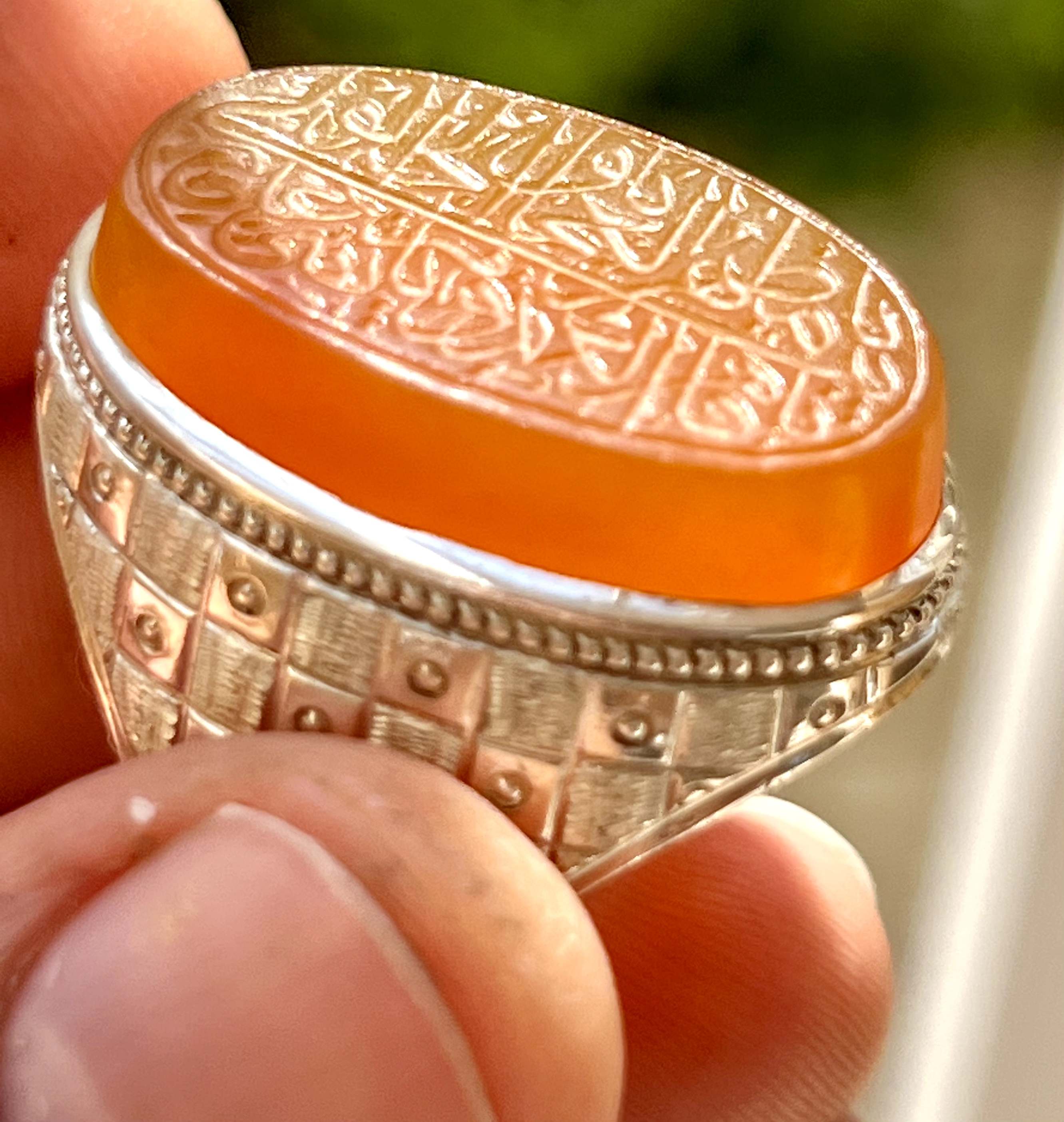 عقیق جز یمنی اعلا درشت و خوشرنگ قواره درشت به ابعاد ۳ در ۸ / ۱ سانتیمتر خط قدیمی سید عباس ضابطی با امضای پشت عقیق دعای متبرک ناد علی