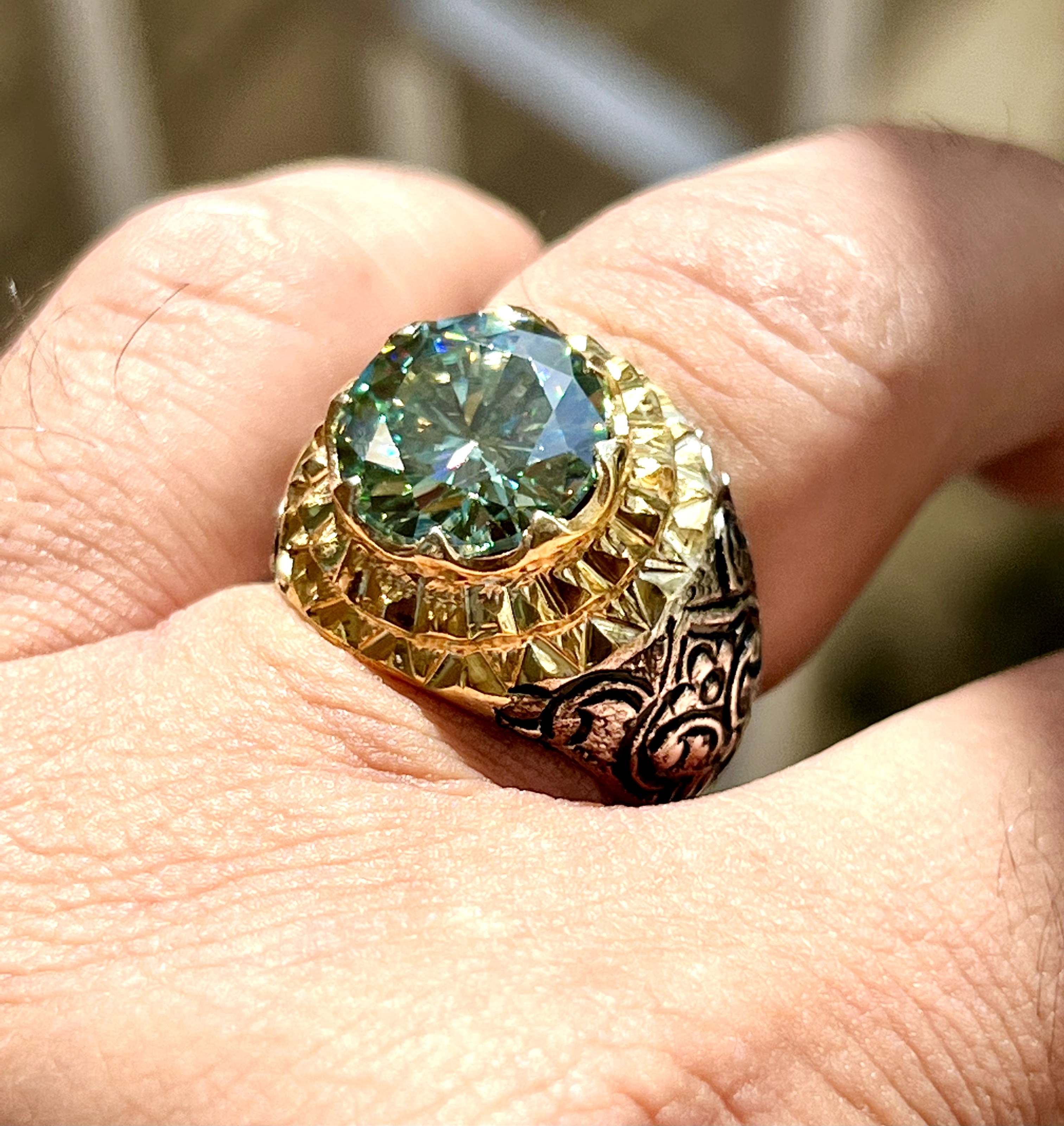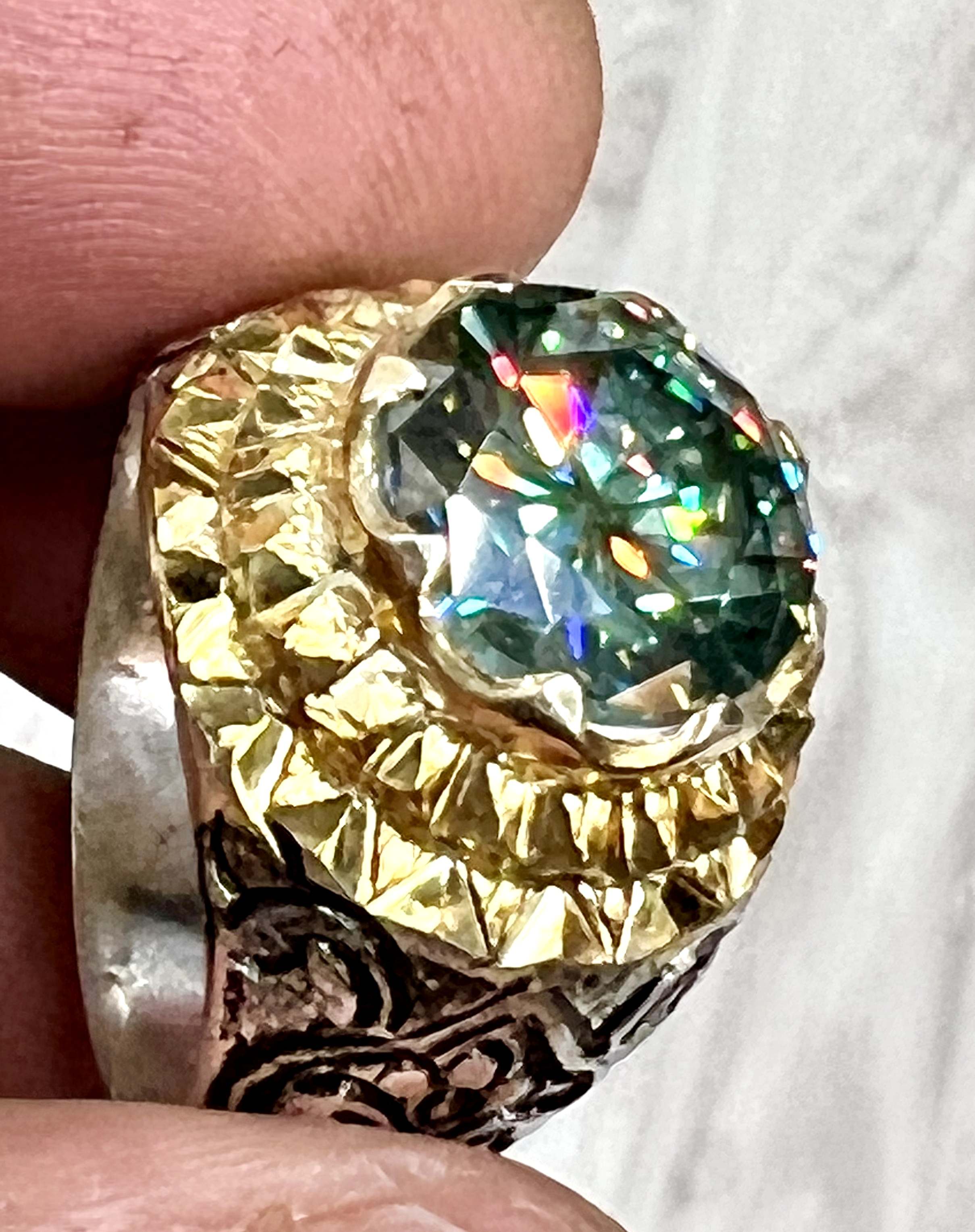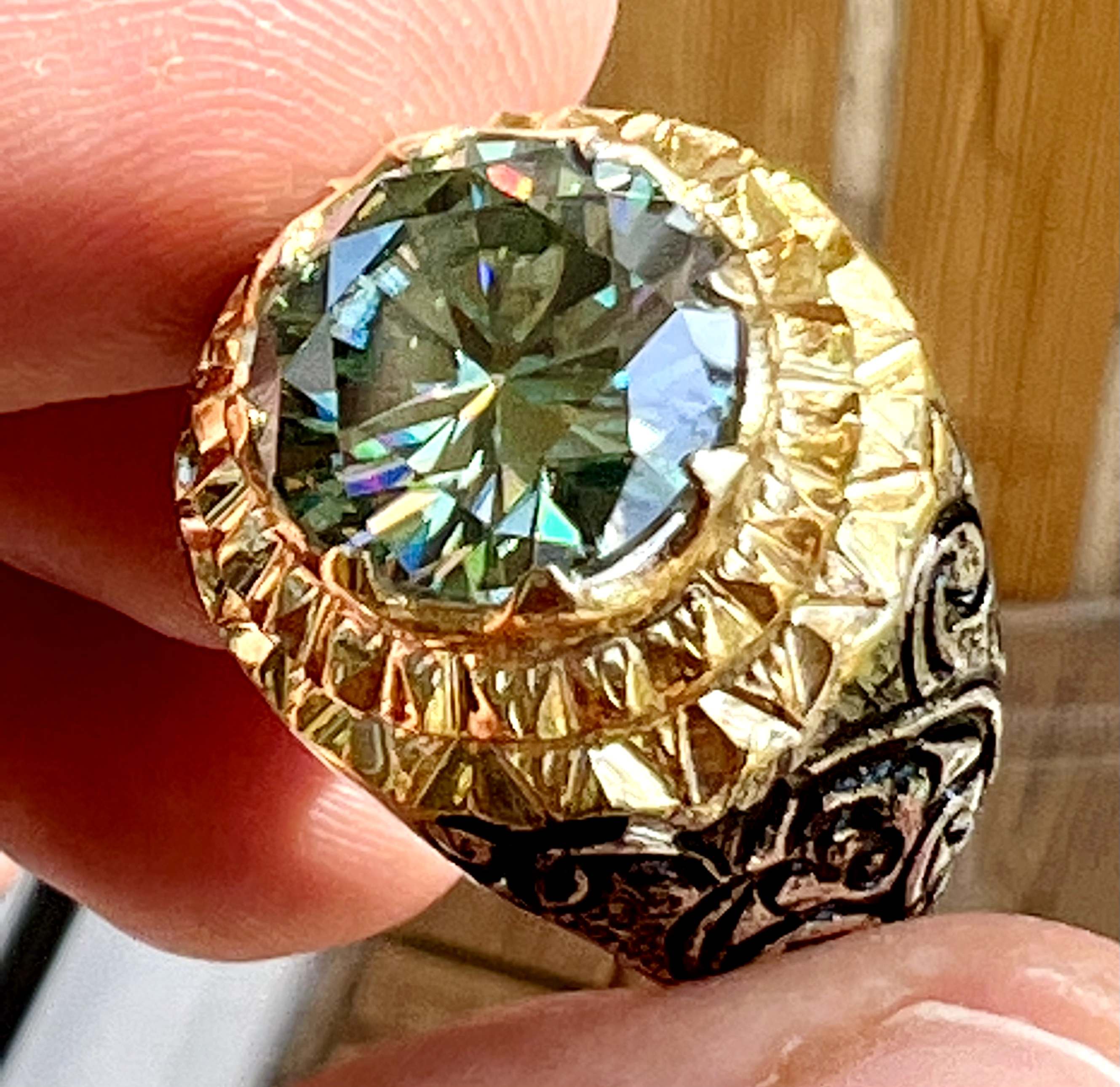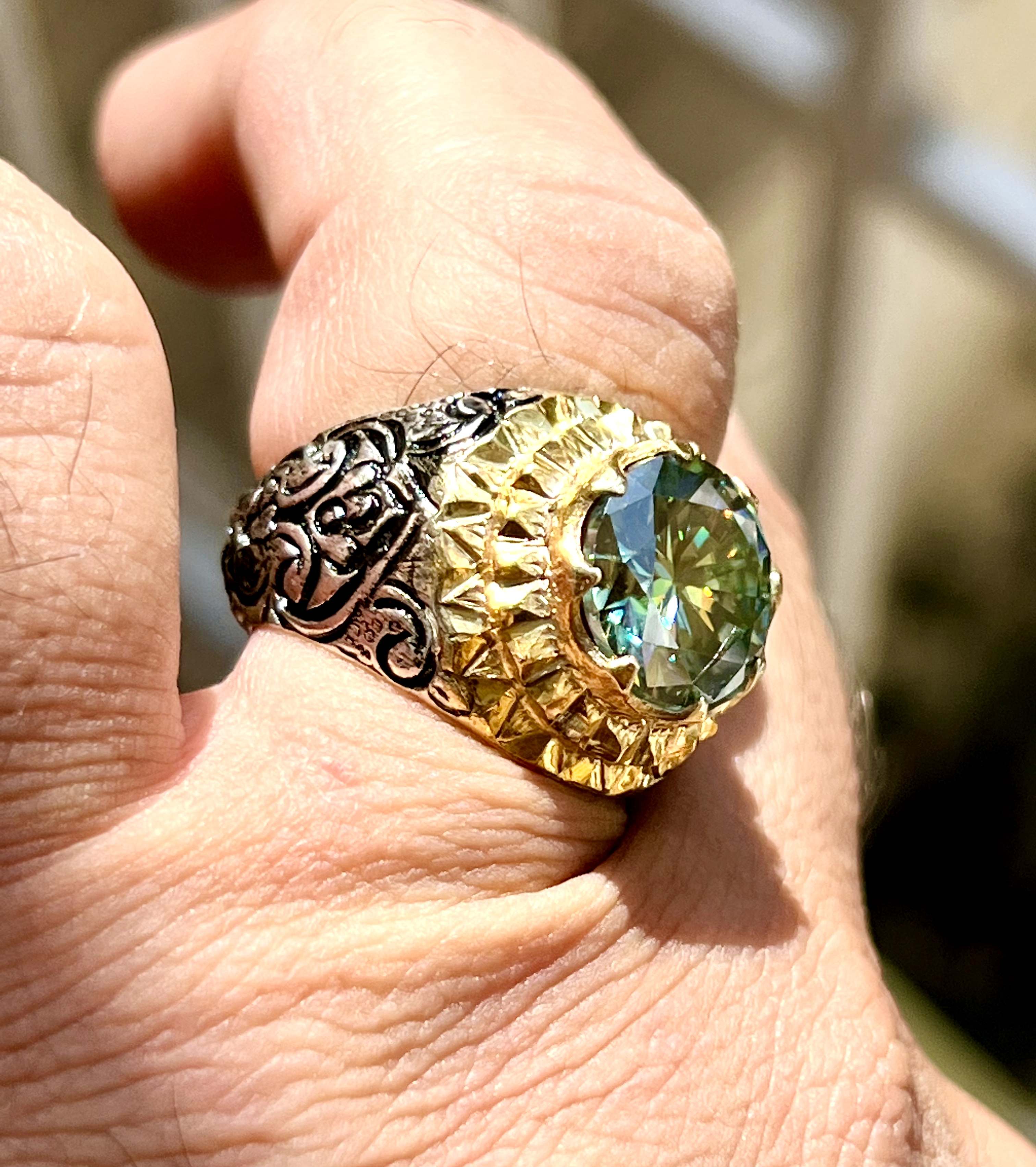 انگشتر موزونایت یا الماس روسی سبز اصل با تلالو بی نظیر رکاب دستی قلم زنی اینه کاری کد ۳۴۹