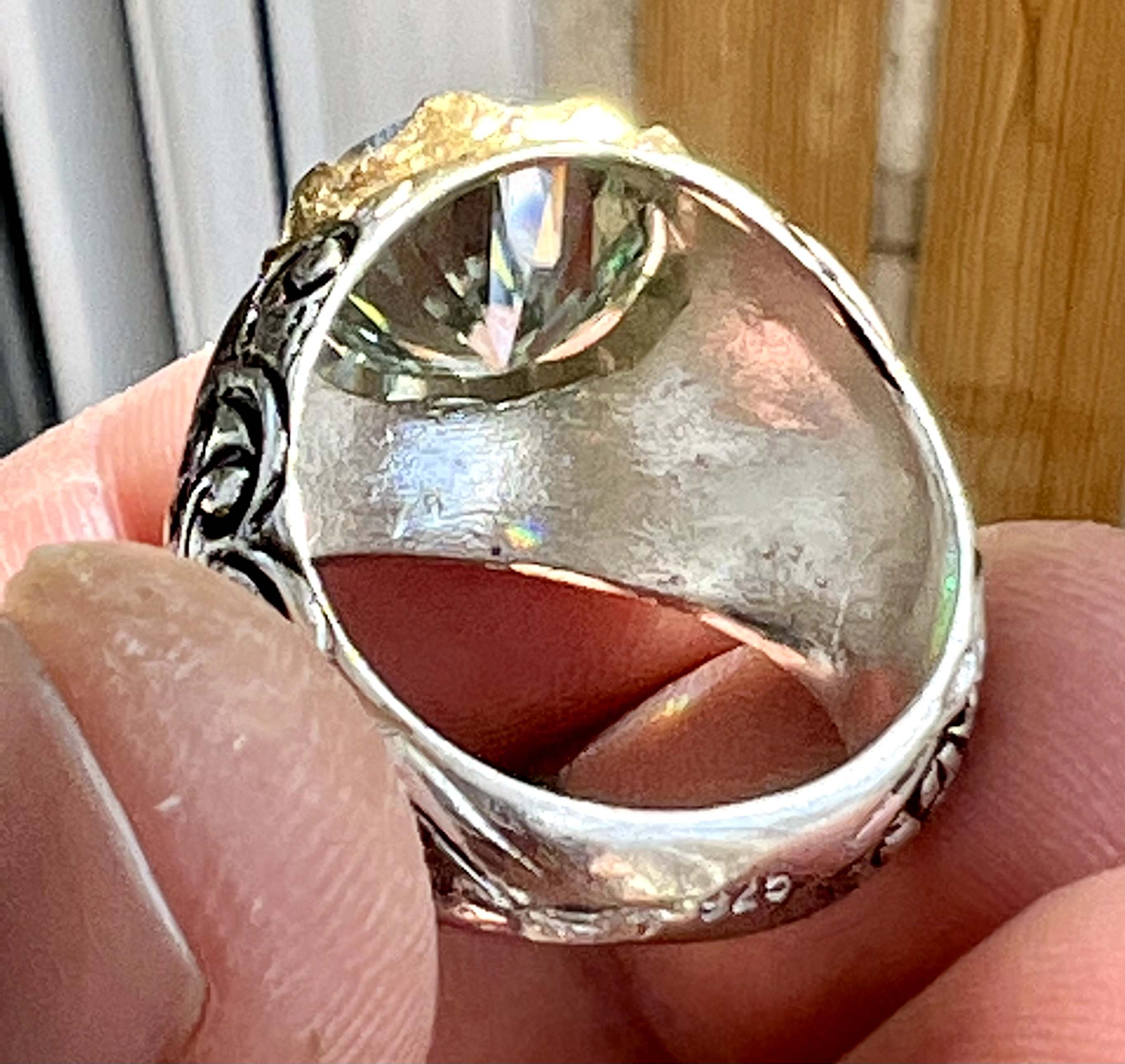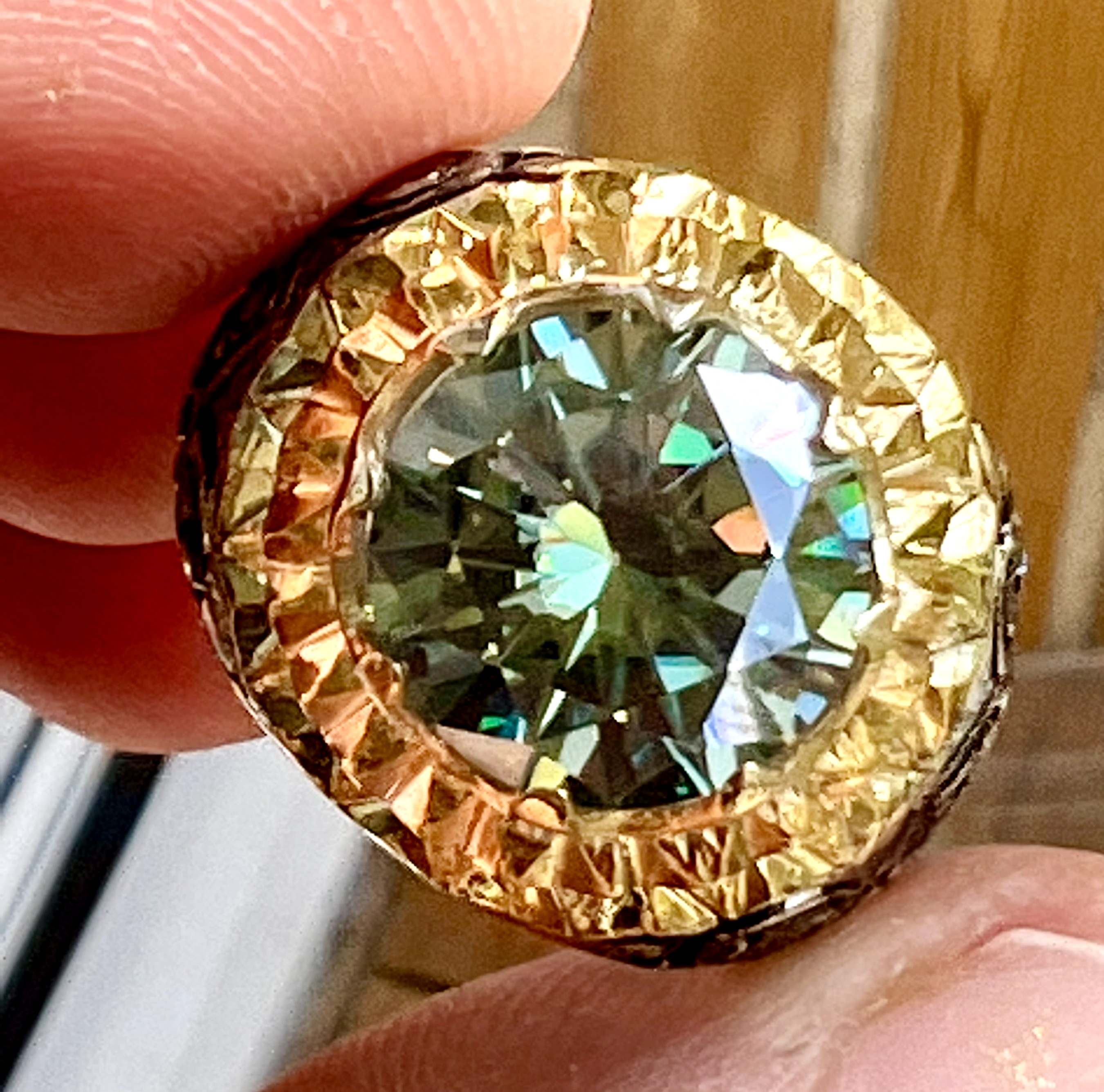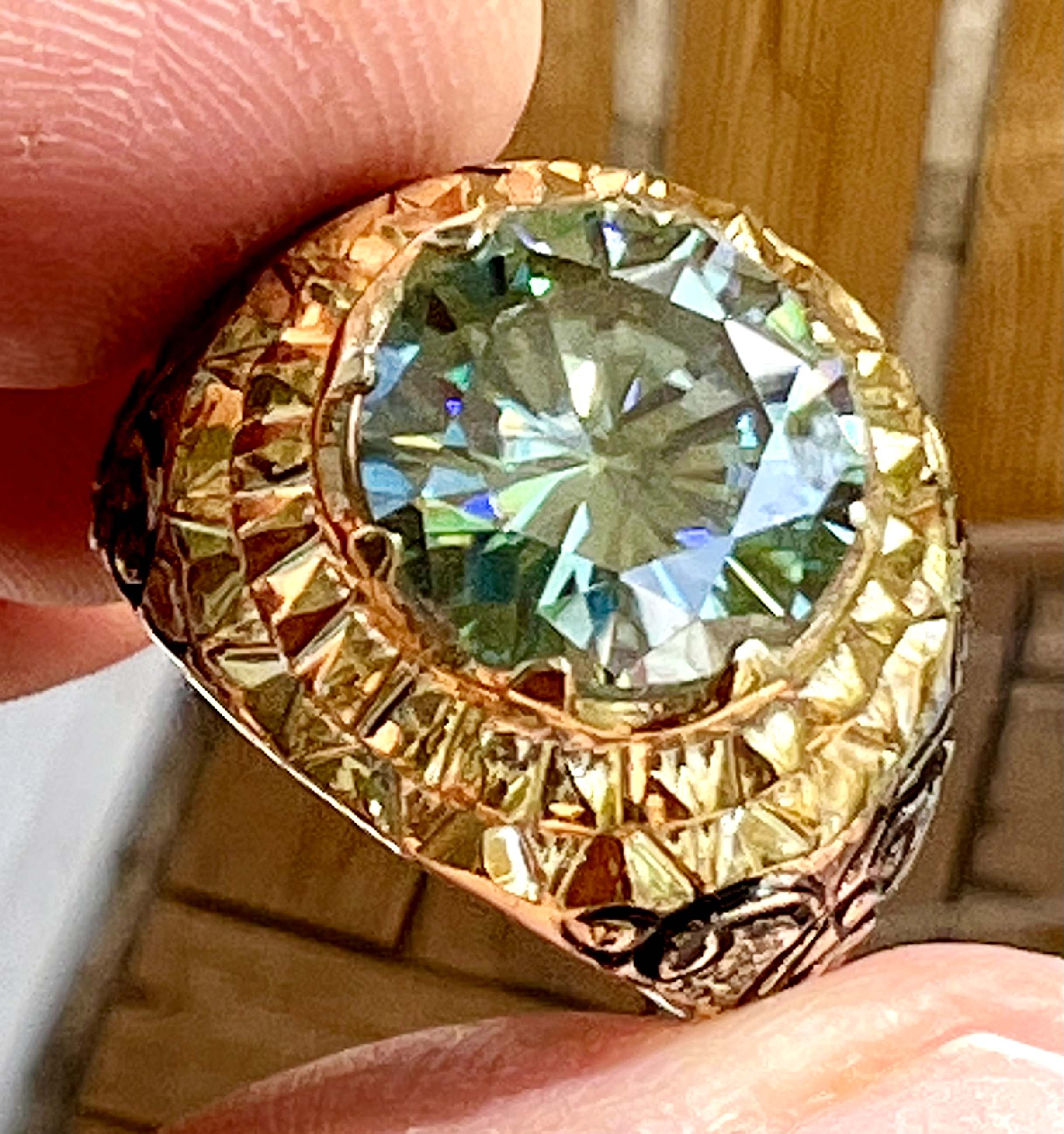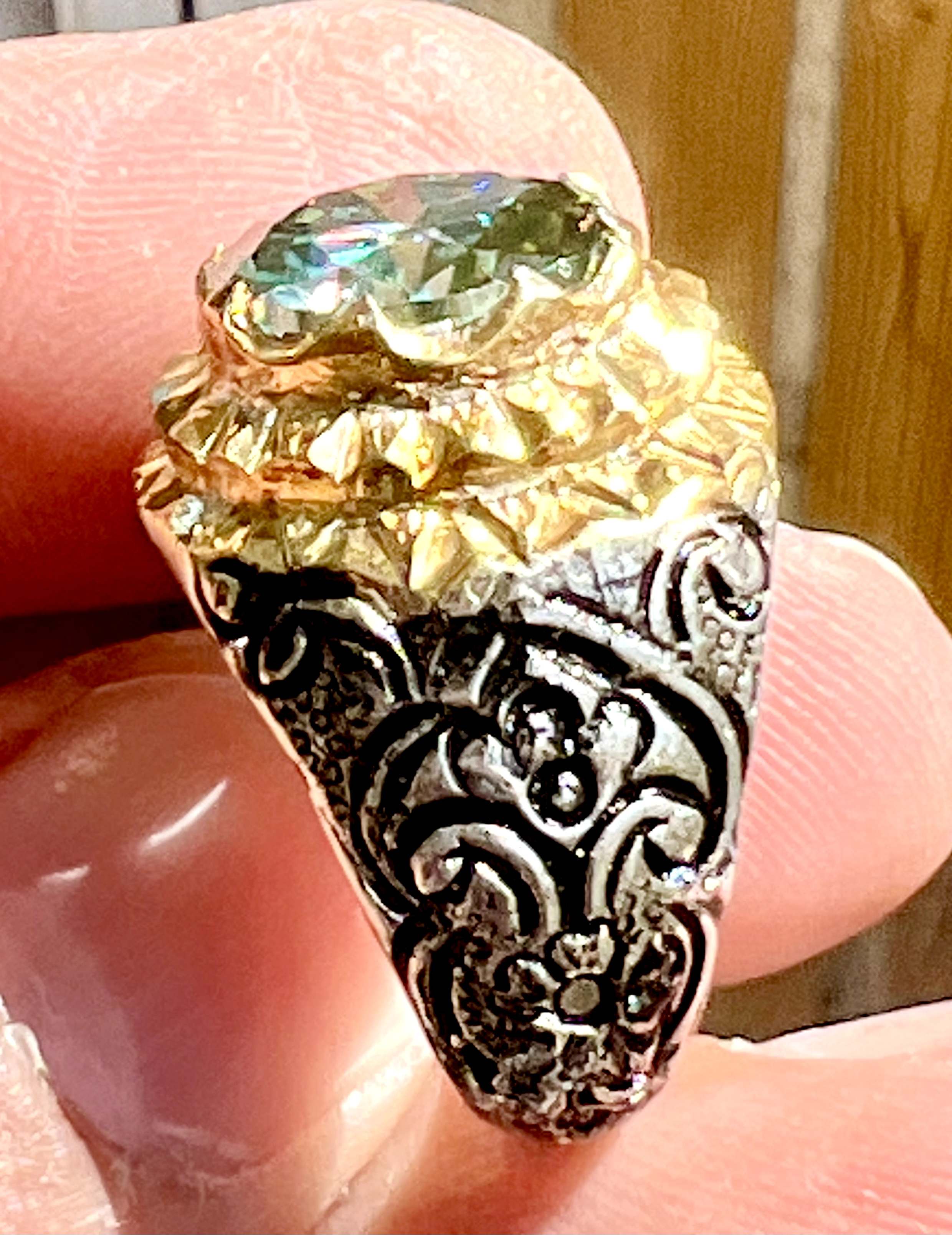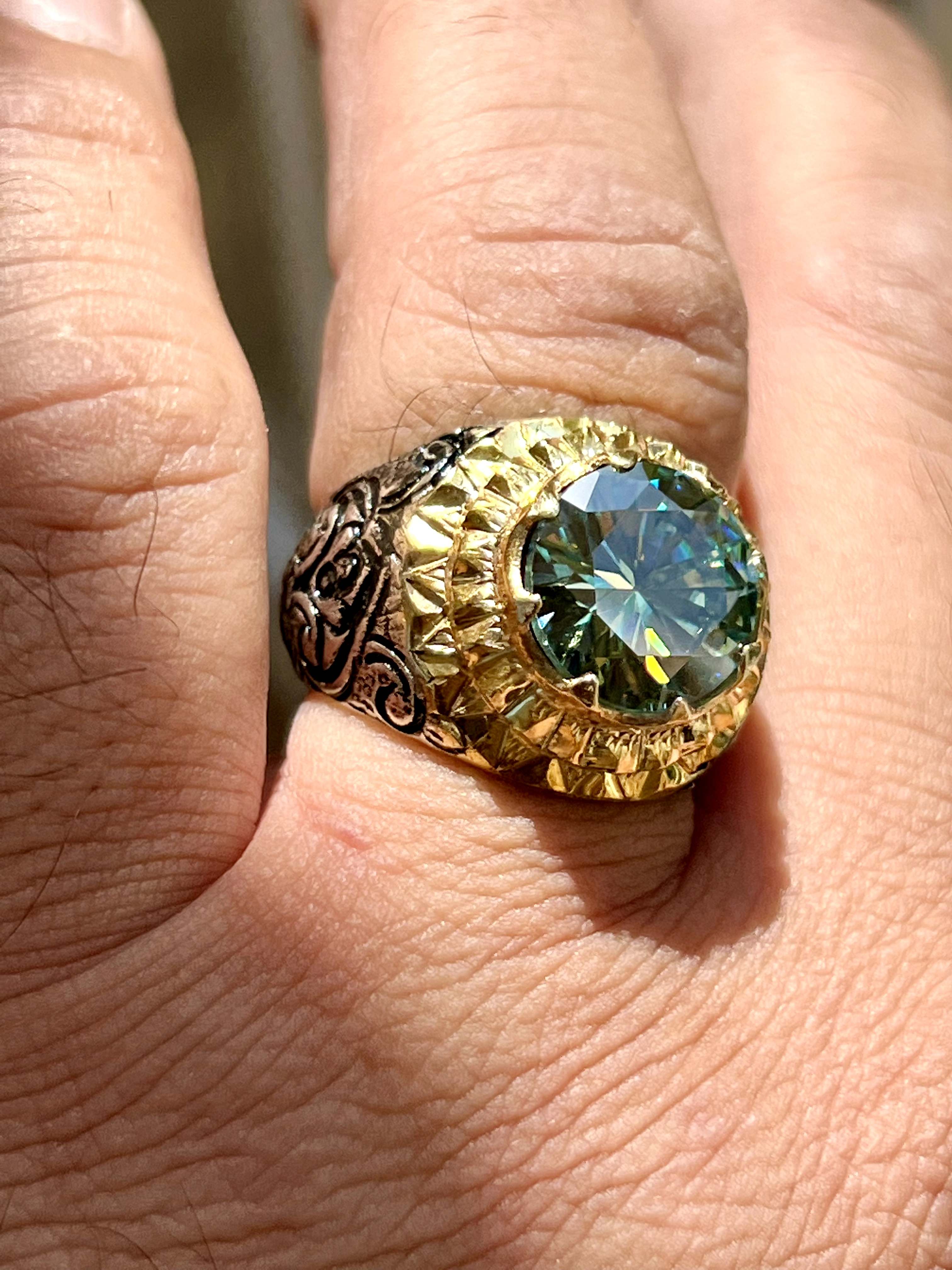 انگشتر موزونایت یا الماس روسی سبز اصل با تلالو بی نظیر رکاب دستی قلم زنی اینه کاری کد ۳۴۹