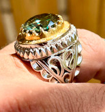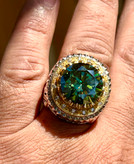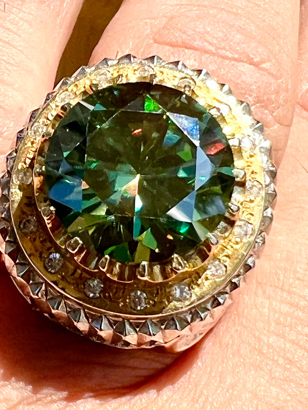 انگشتر موزونایت یا الماس روسی سبز اصل قواره درشت ،رکاب تماما دستساز با مهر سازنده و مخراج ۱۶ عدد برلیان سفید کد ۳۵۳