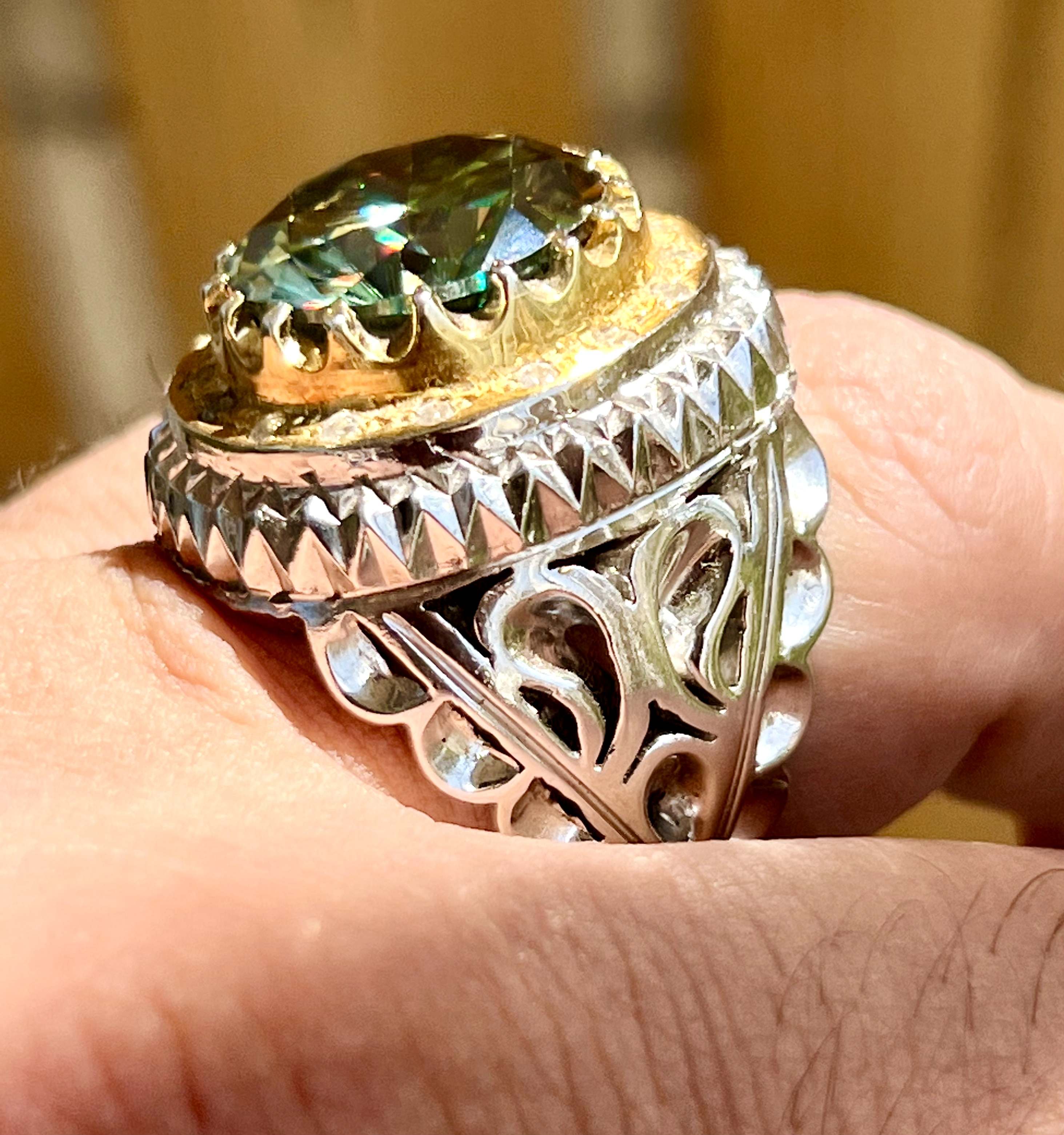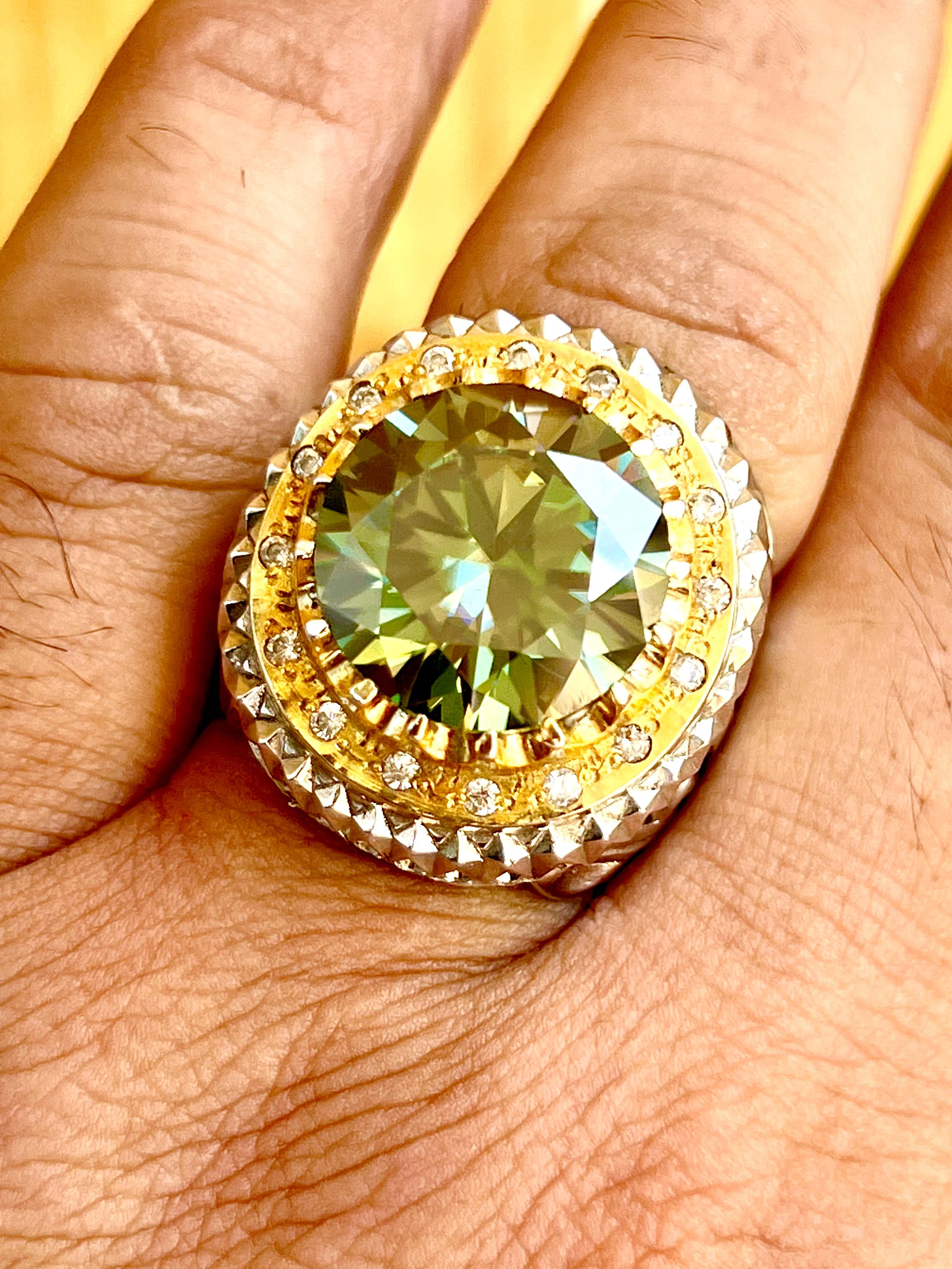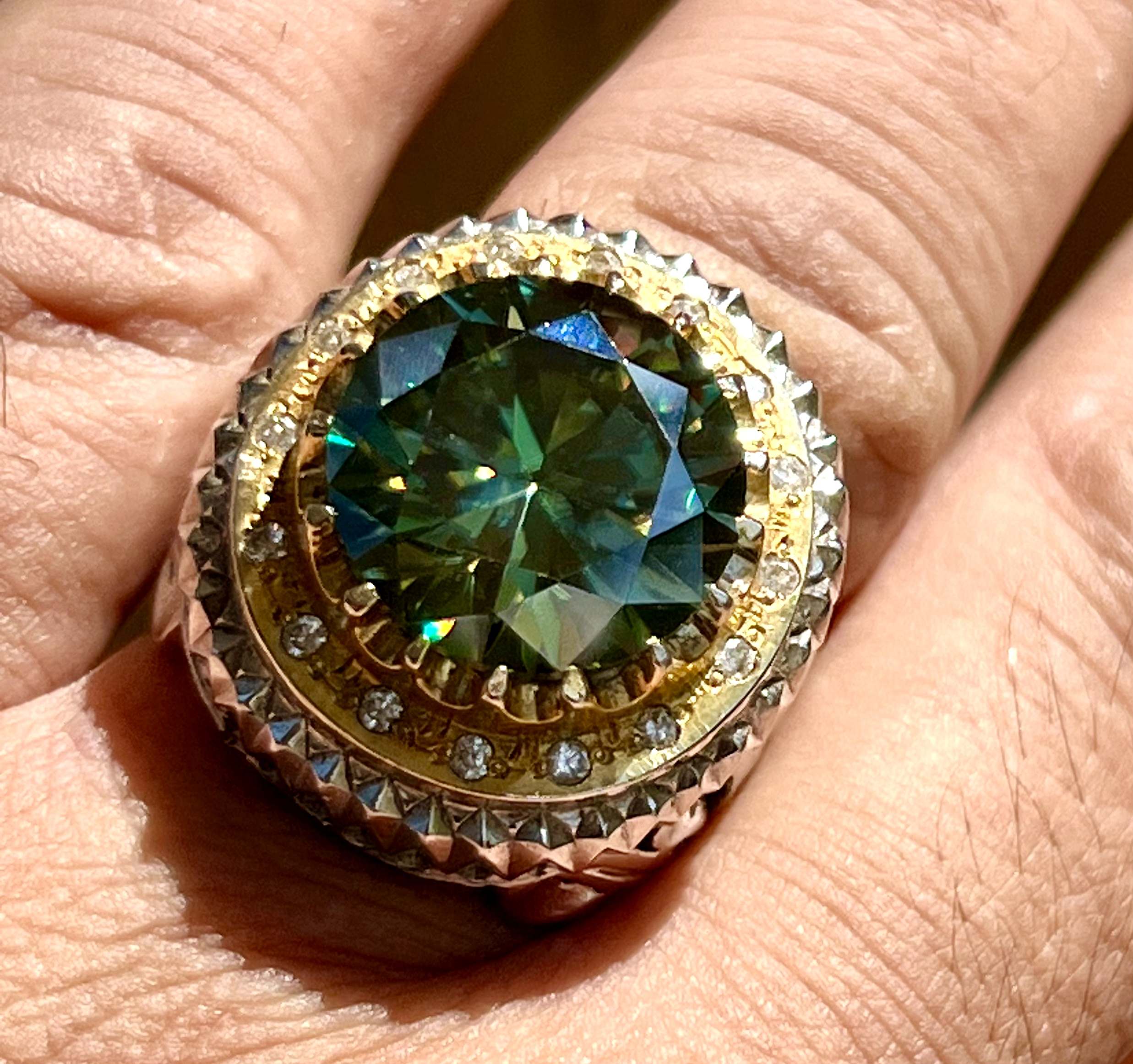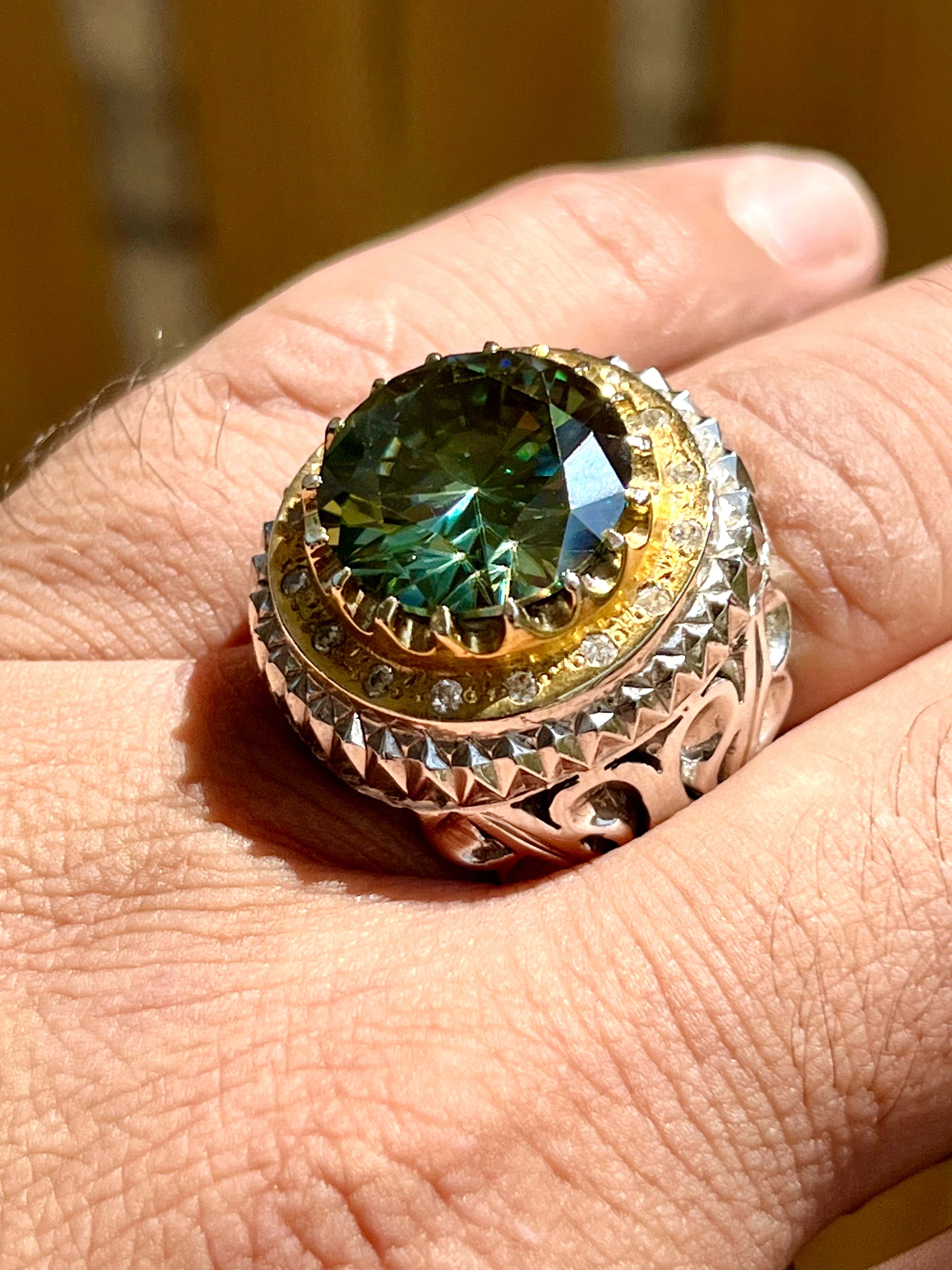 انگشتر موزونایت یا الماس روسی سبز اصل قواره درشت ،رکاب تماما دستساز با مهر سازنده و مخراج ۱۶ عدد برلیان سفید کد ۳۵۳