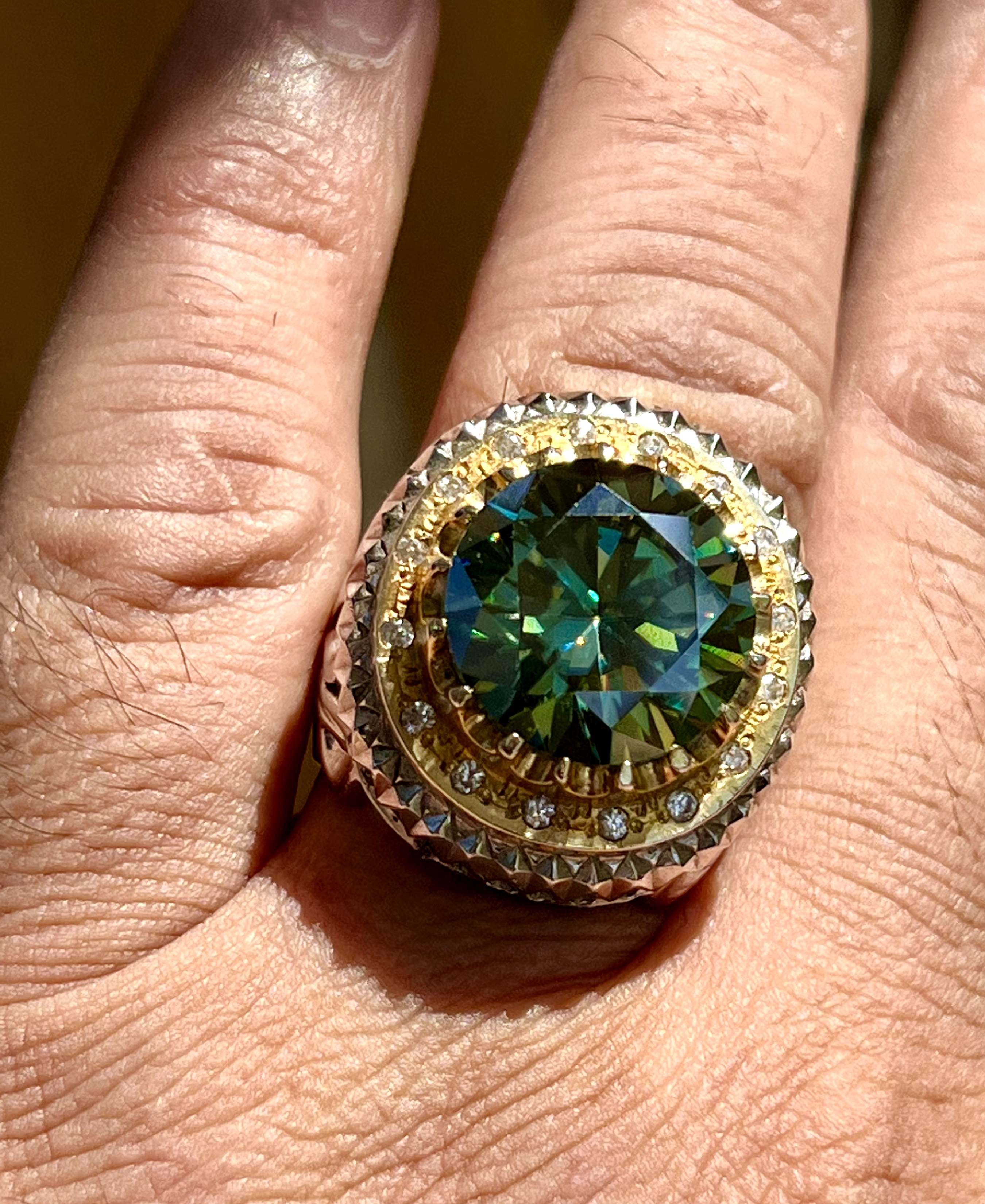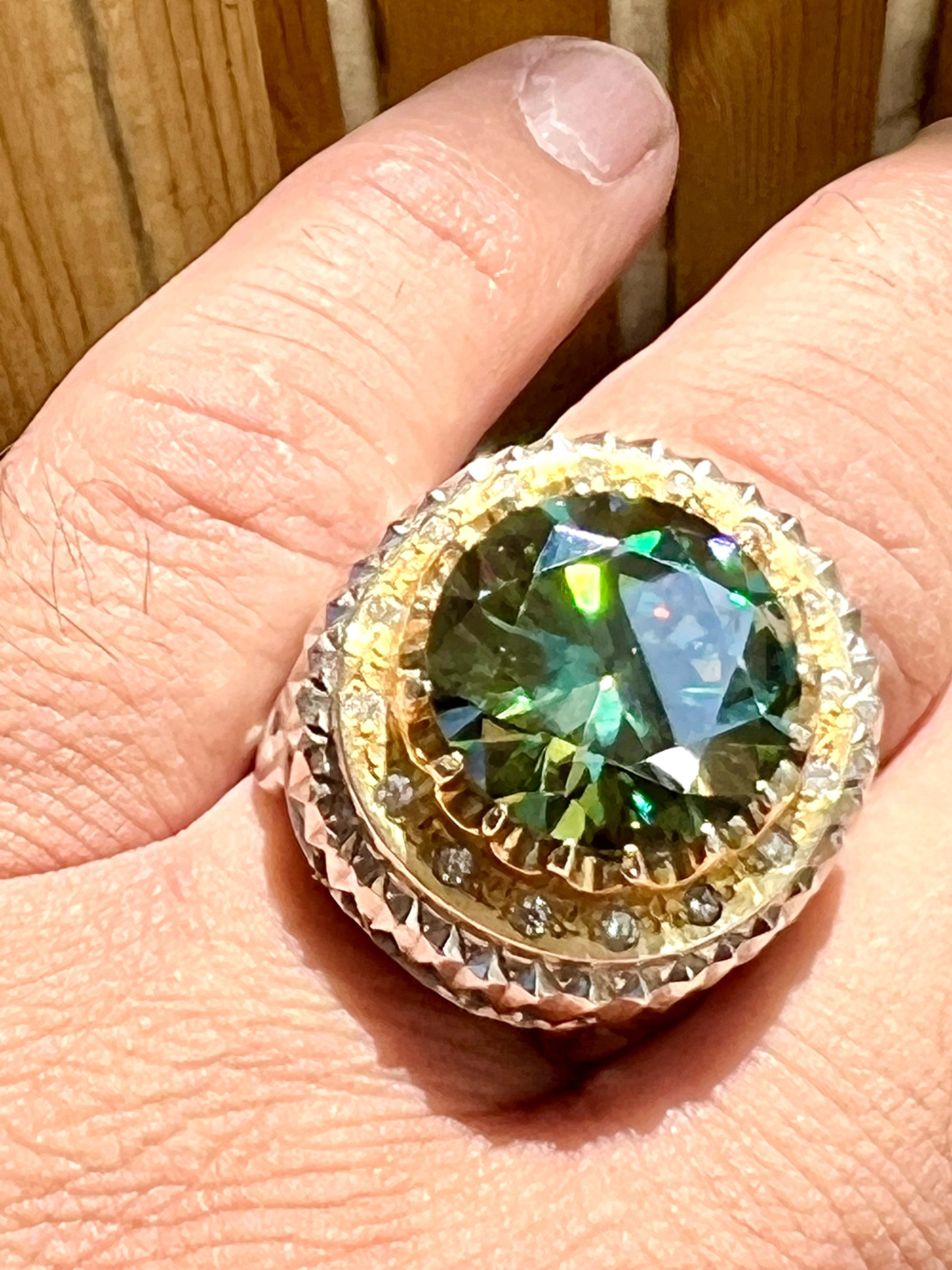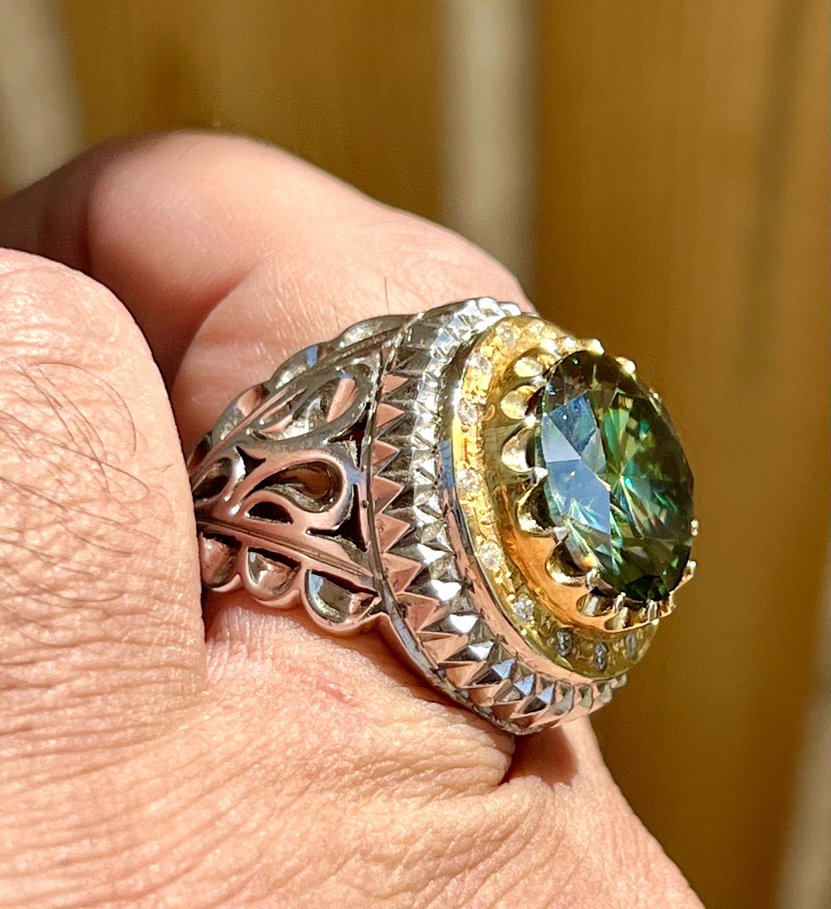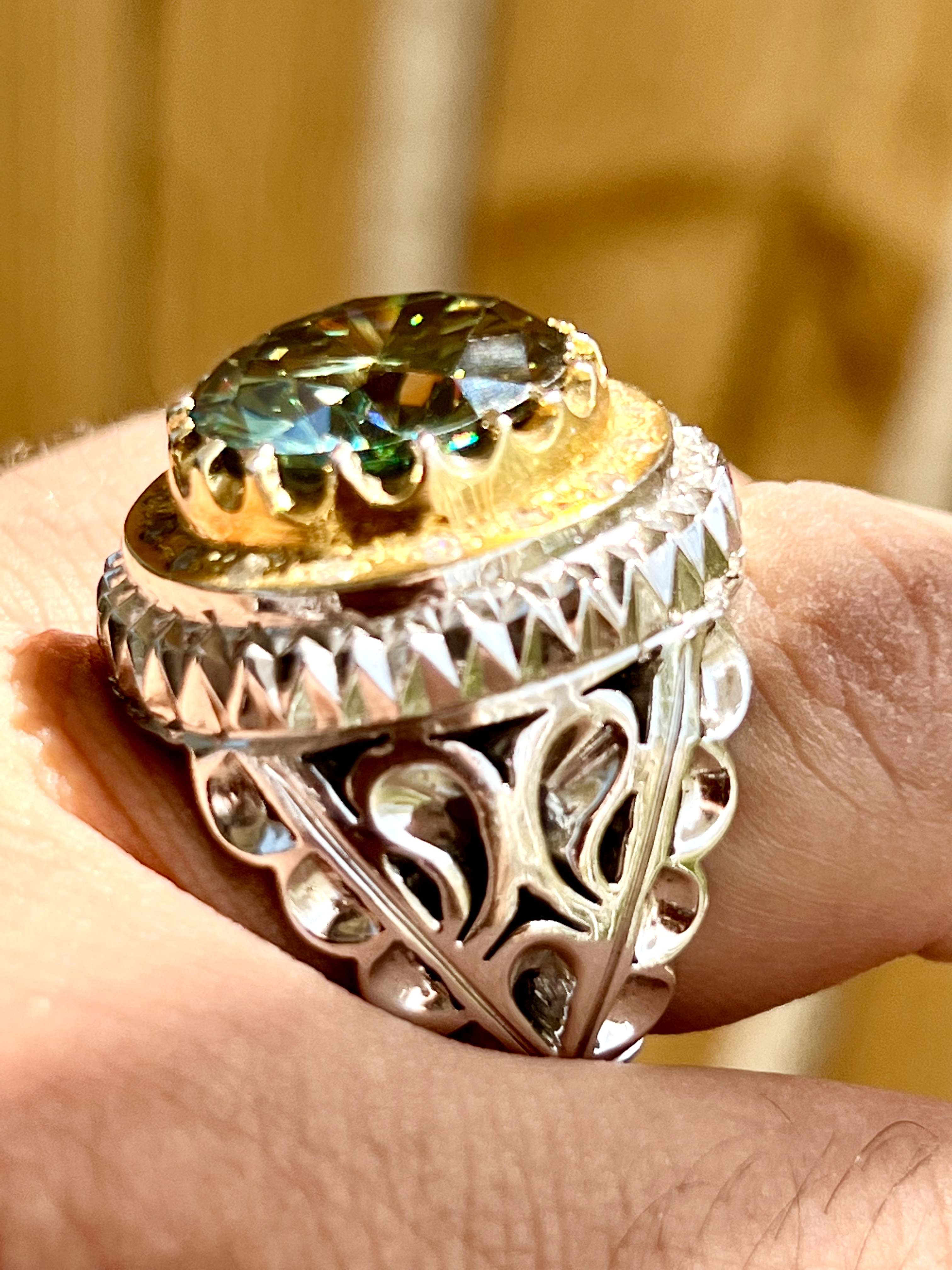 انگشتر موزونایت یا الماس روسی سبز اصل قواره درشت ،رکاب تماما دستساز با مهر سازنده و مخراج ۱۶ عدد برلیان سفید کد ۳۵۳
