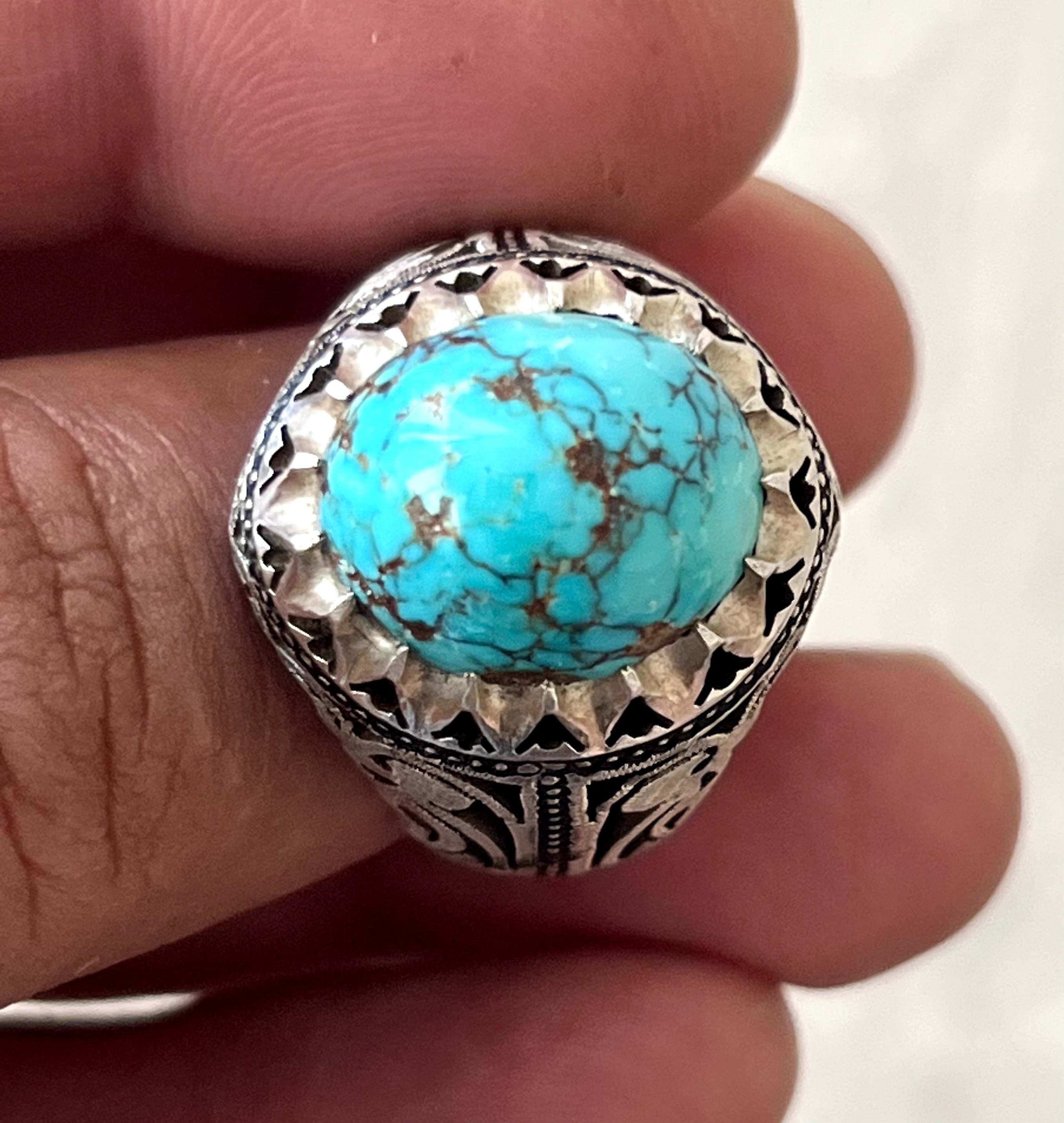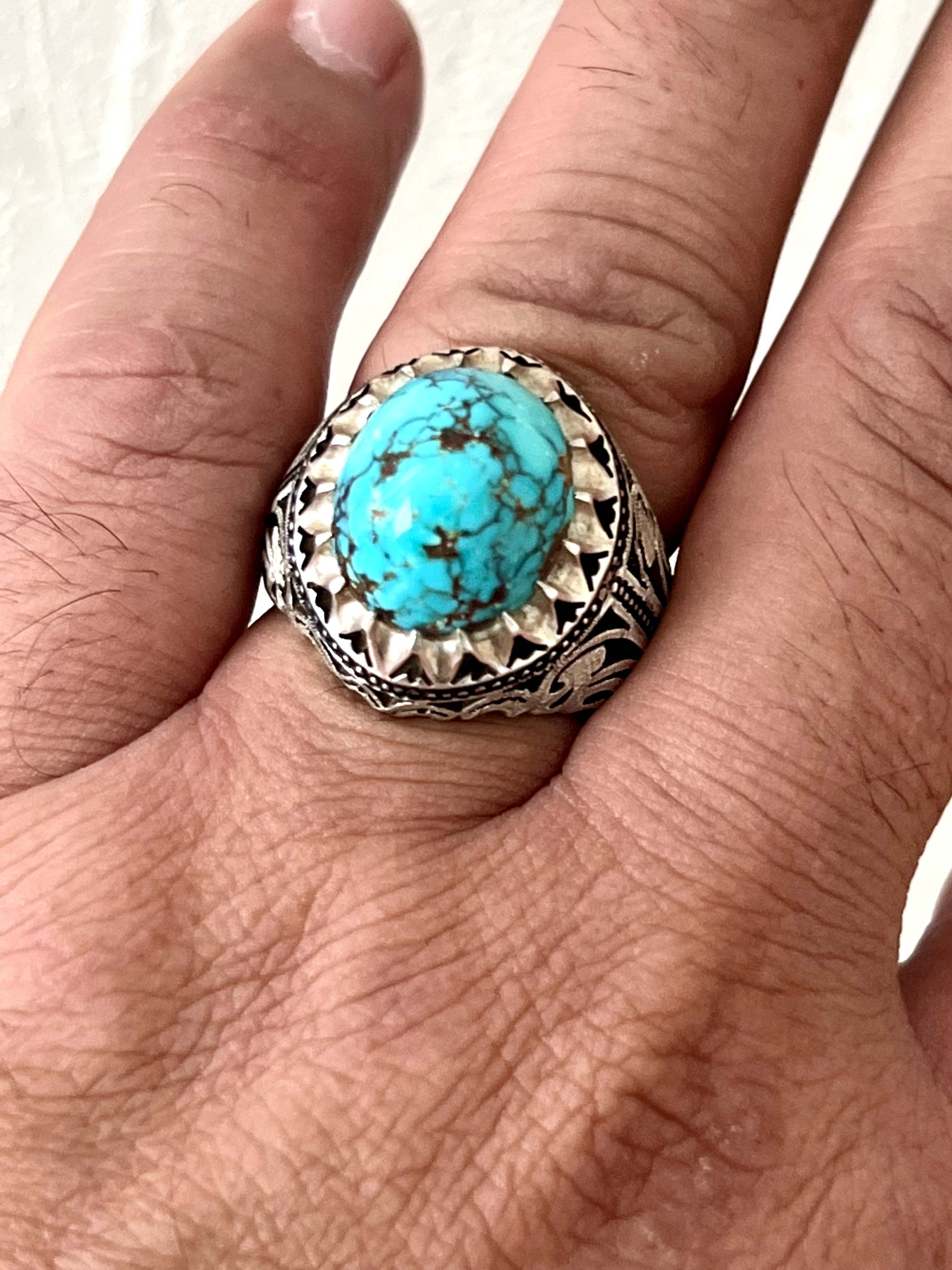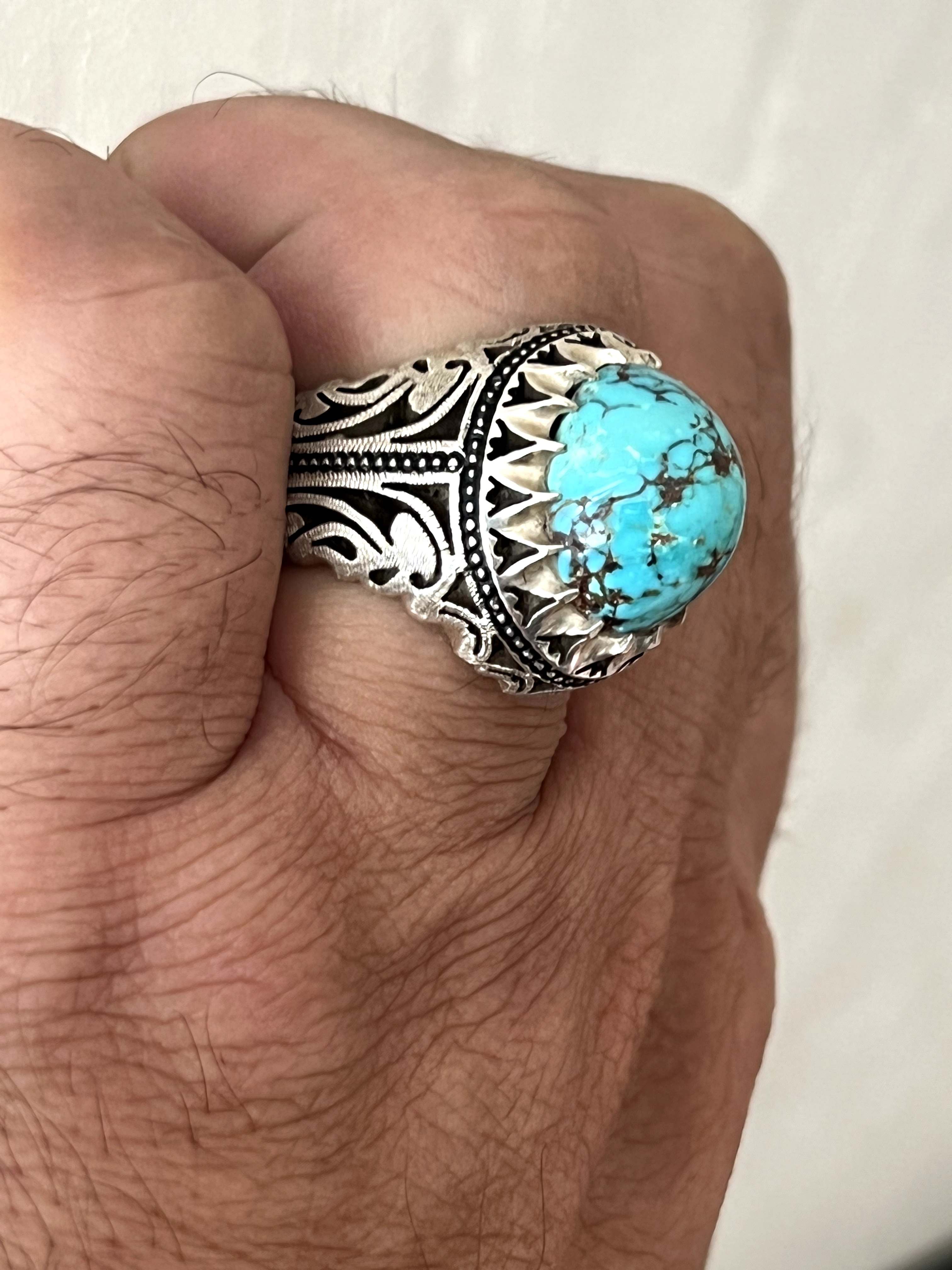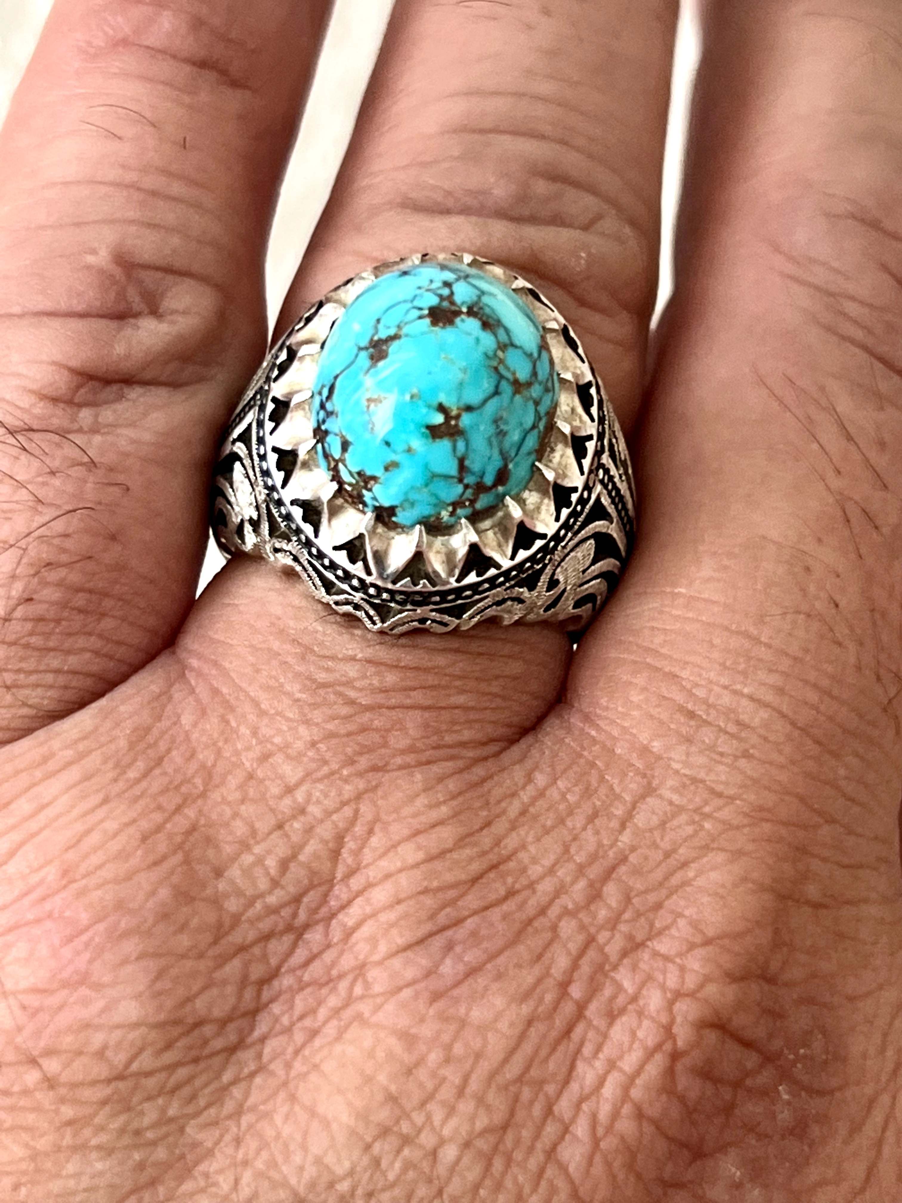 انگشتر فیروزه شجری معدنی و طبیعی بدون احیا رکاب دستساز استاد حداد کد ۳۵۷