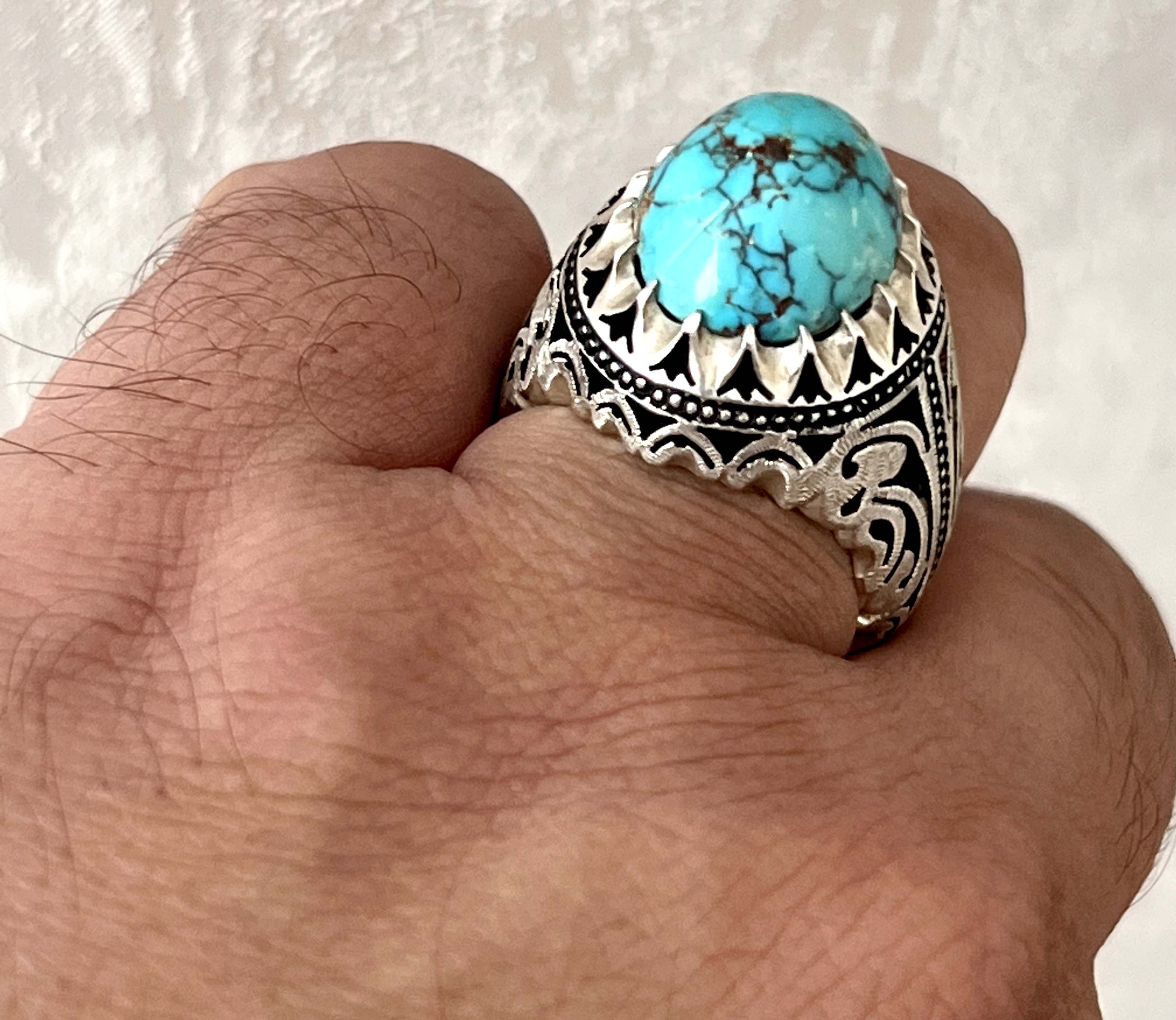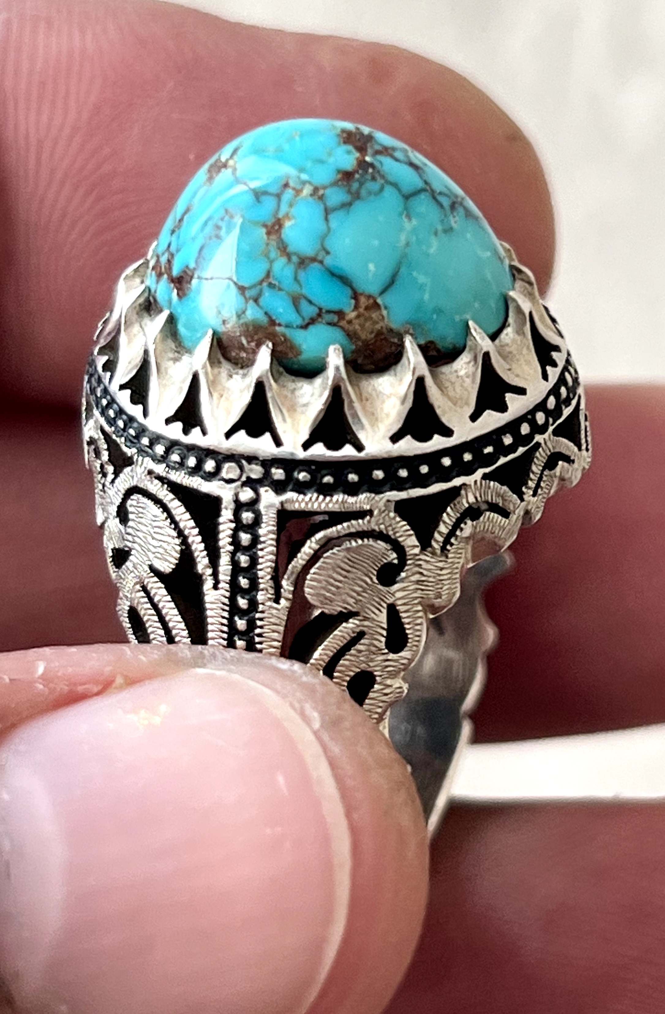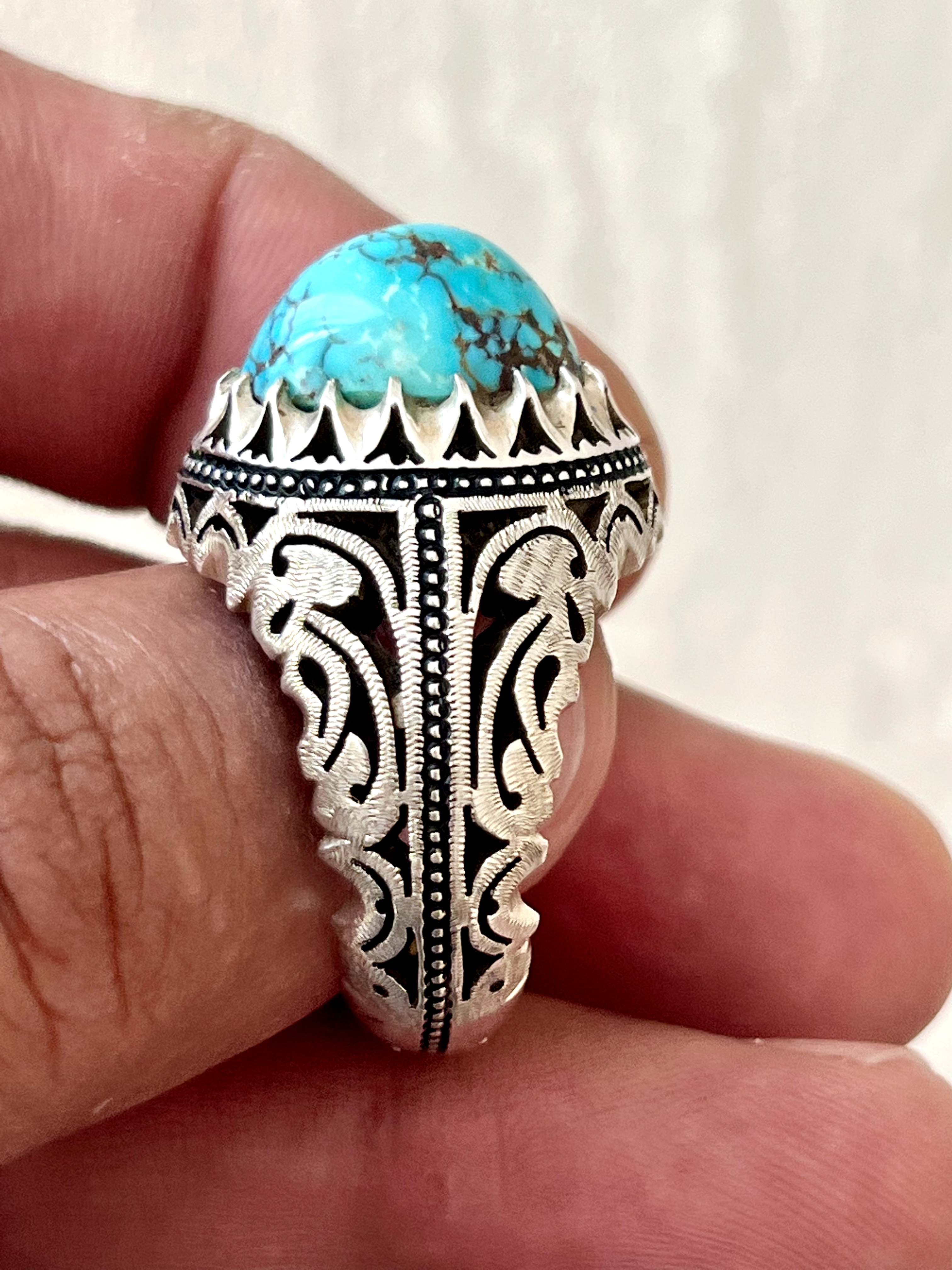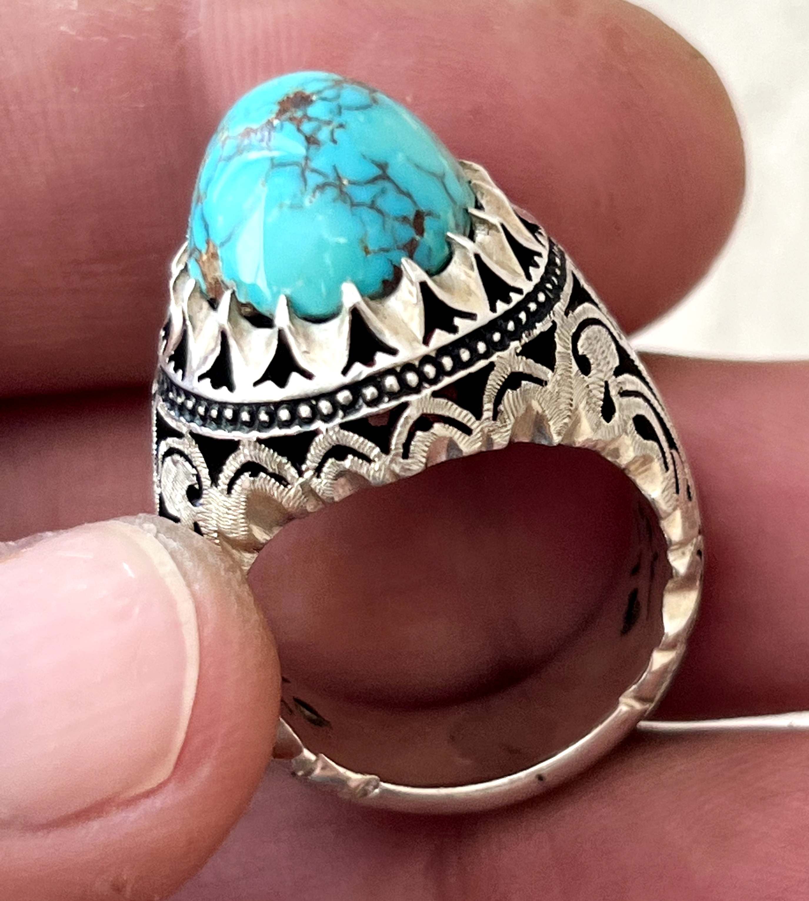 انگشتر فیروزه شجری معدنی و طبیعی بدون احیا رکاب دستساز استاد حداد کد ۳۵۷