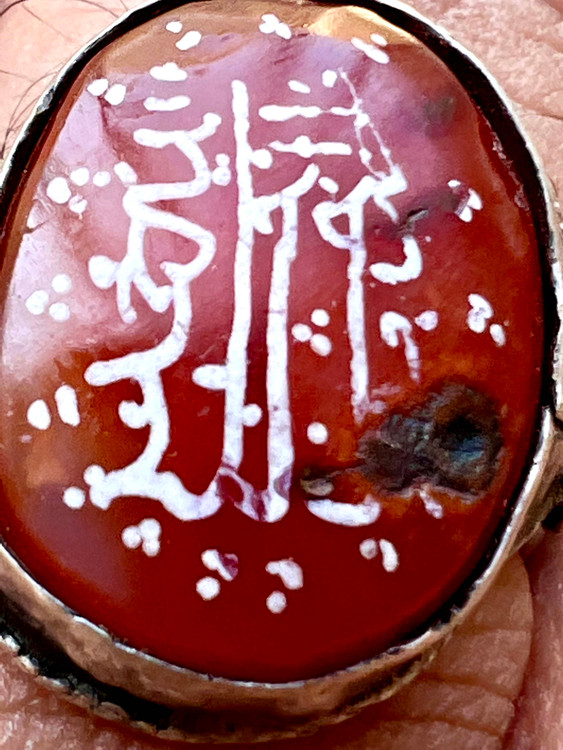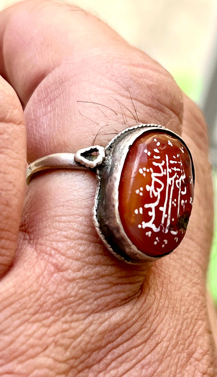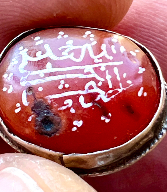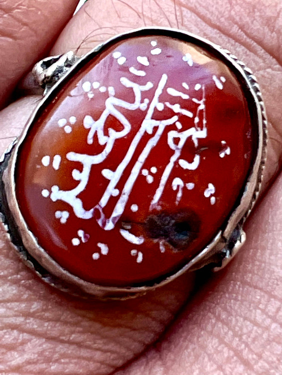 عقیق سرخ کهنه یمنی بینهایت اصیل با قدمت دوران صفوی به ابعاد ۲ در ۱ سانتیمتر و ضخامت ۶ / . سانتیمتر و خط بیاضی کهنه اسامی پنج تن مربوط به دوران صفوی