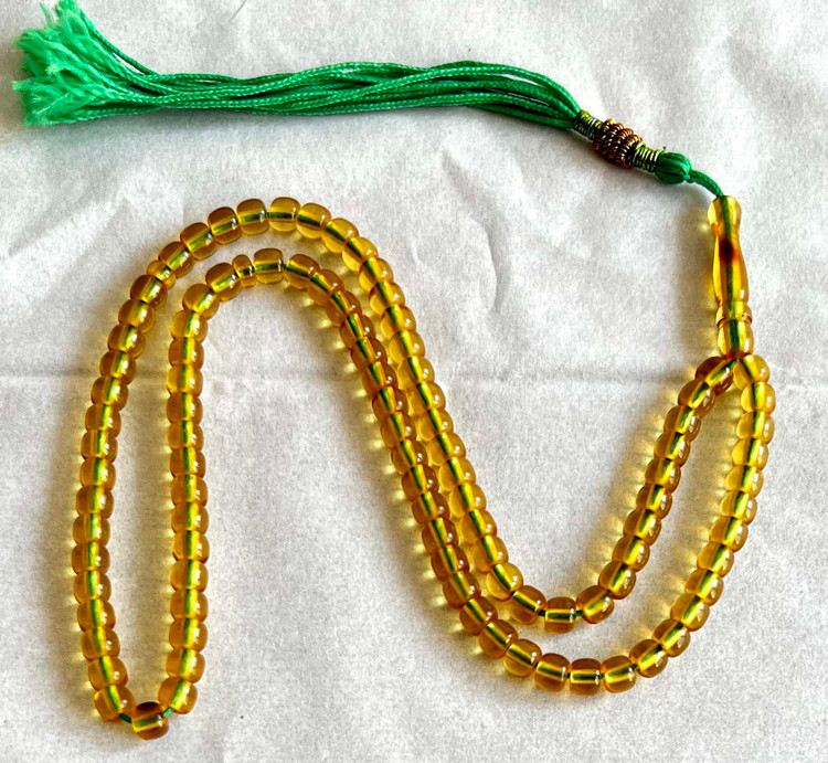 تسبیح سندلوس کهنه آلمان اصل رنگ زرد نباتی دانه ریز ۱۰۱ عددی کد ۳۸۷