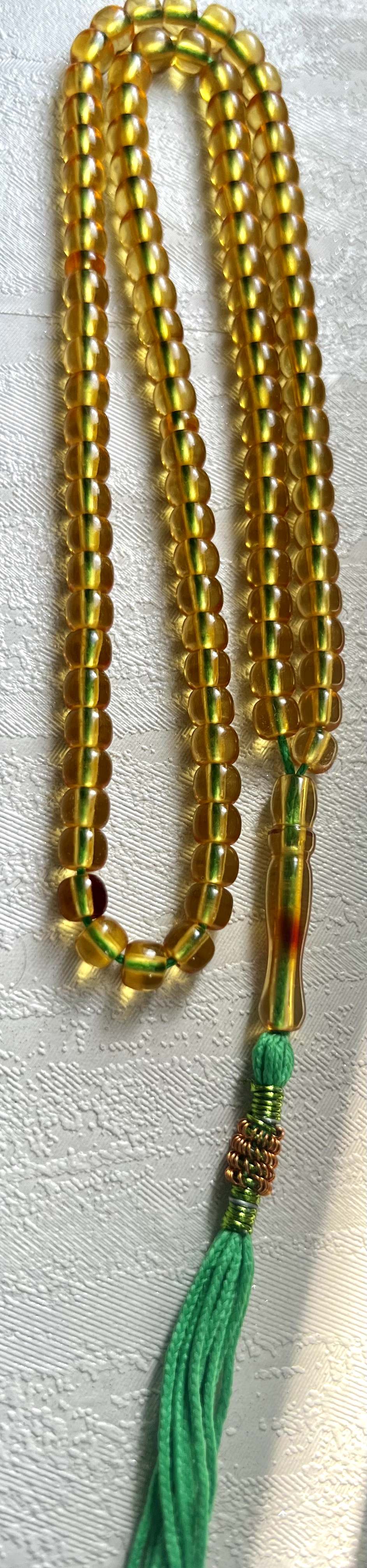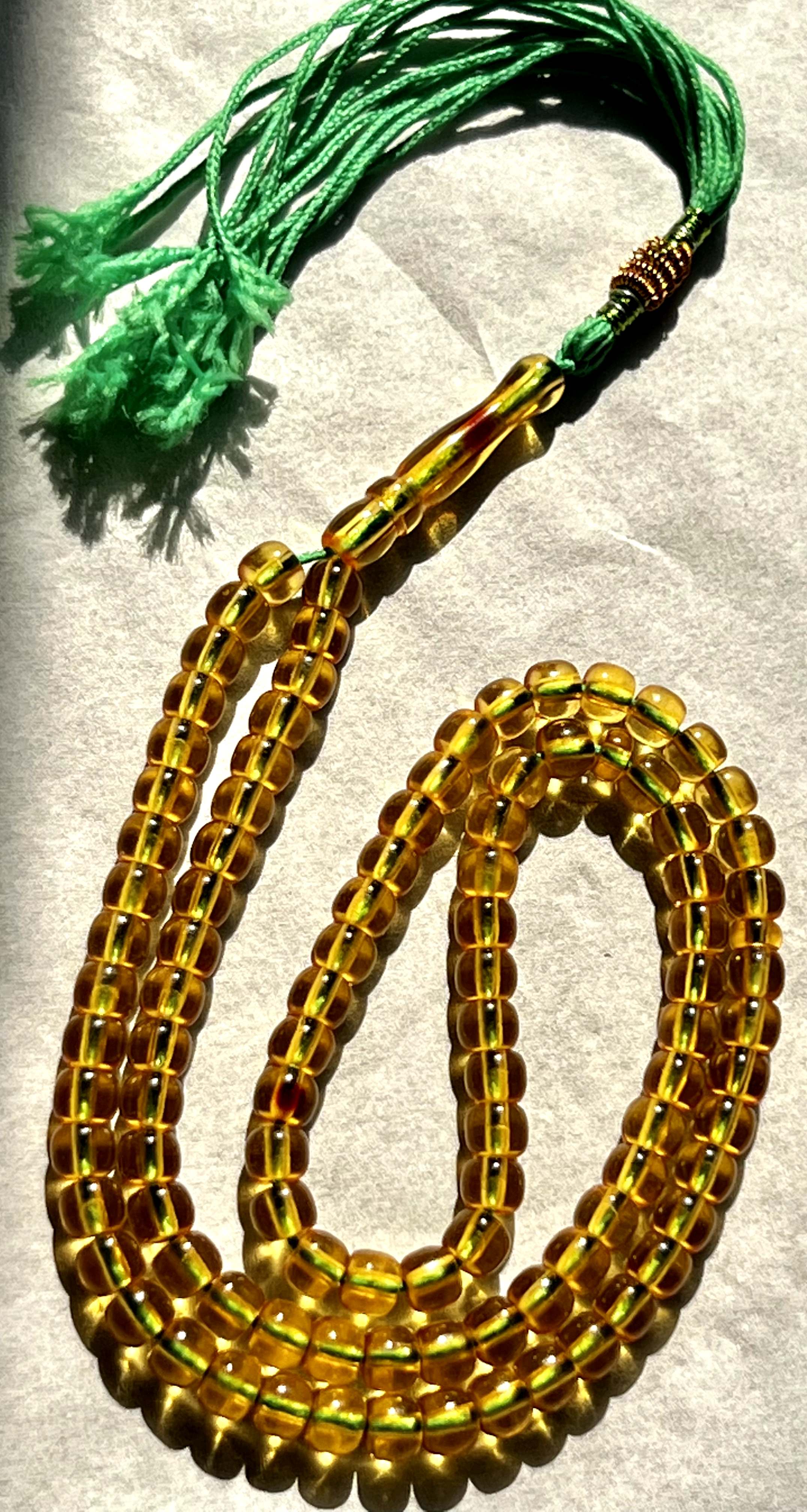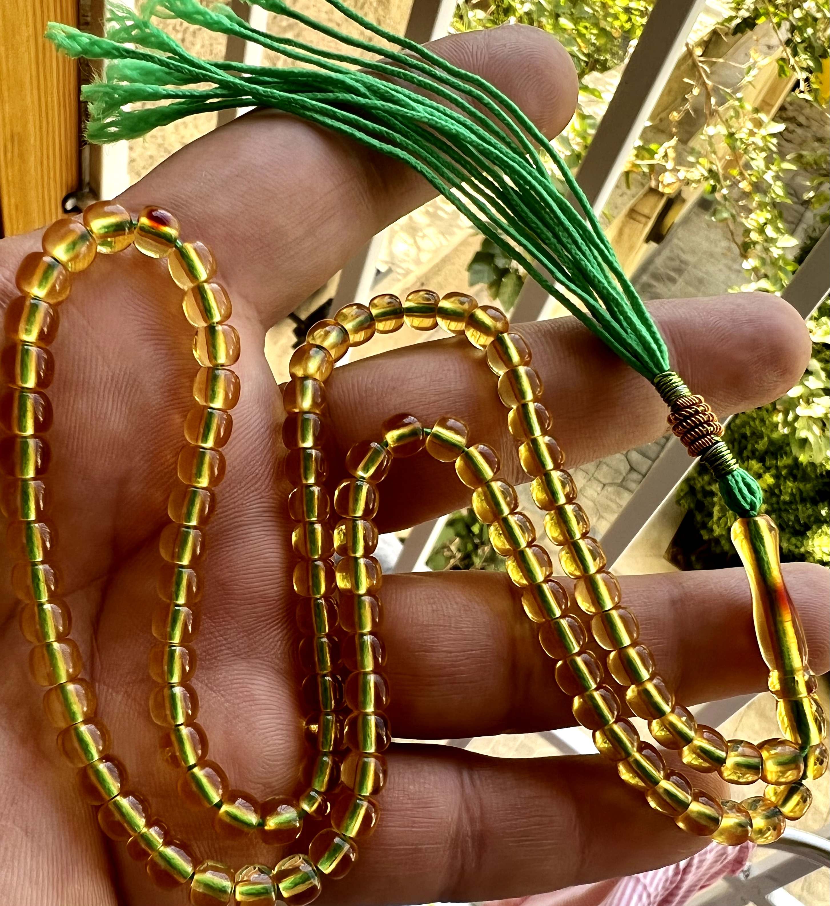 تسبیح سندلوس کهنه آلمان اصل رنگ زرد نباتی دانه ریز ۱۰۱ عددی کد ۳۸۷
