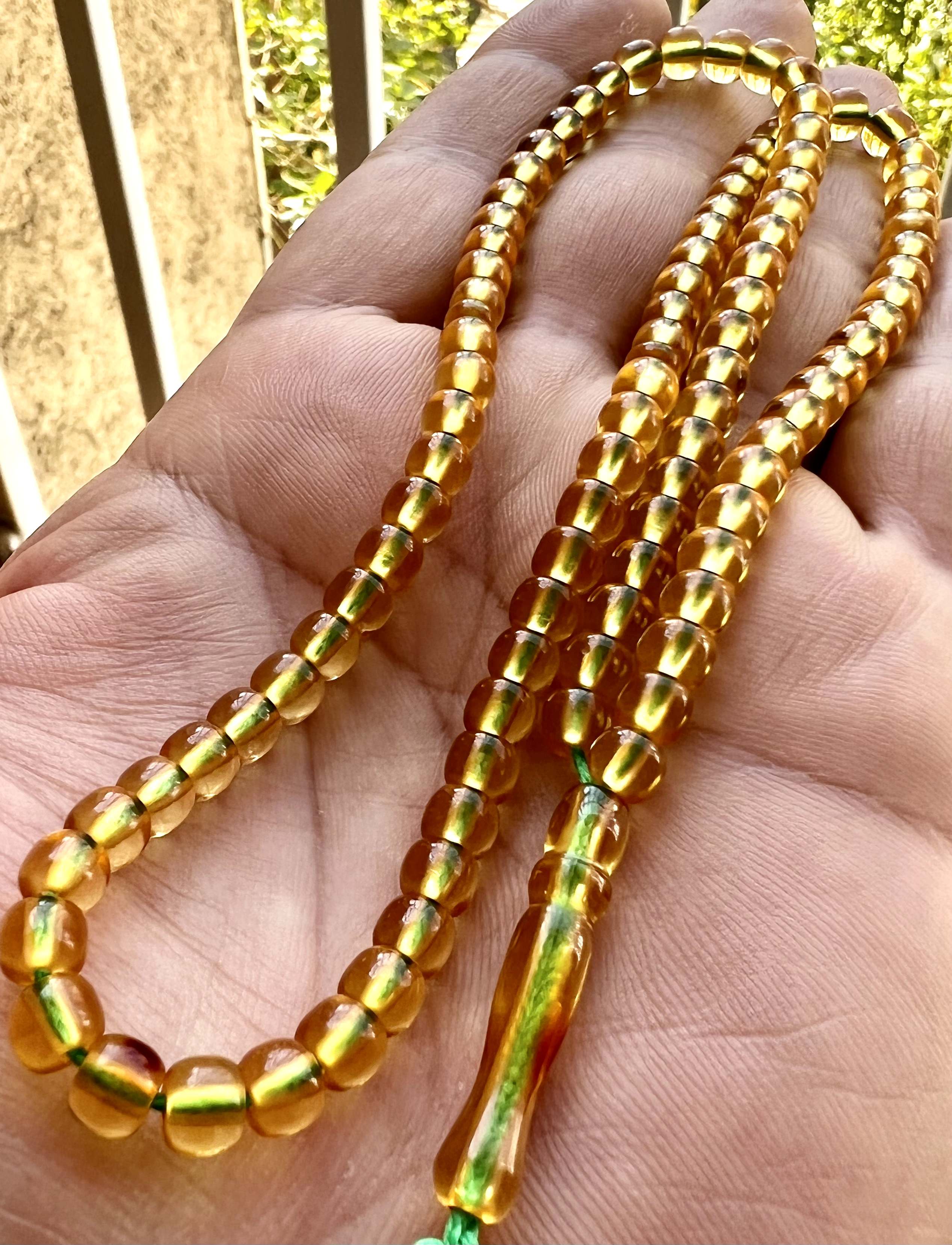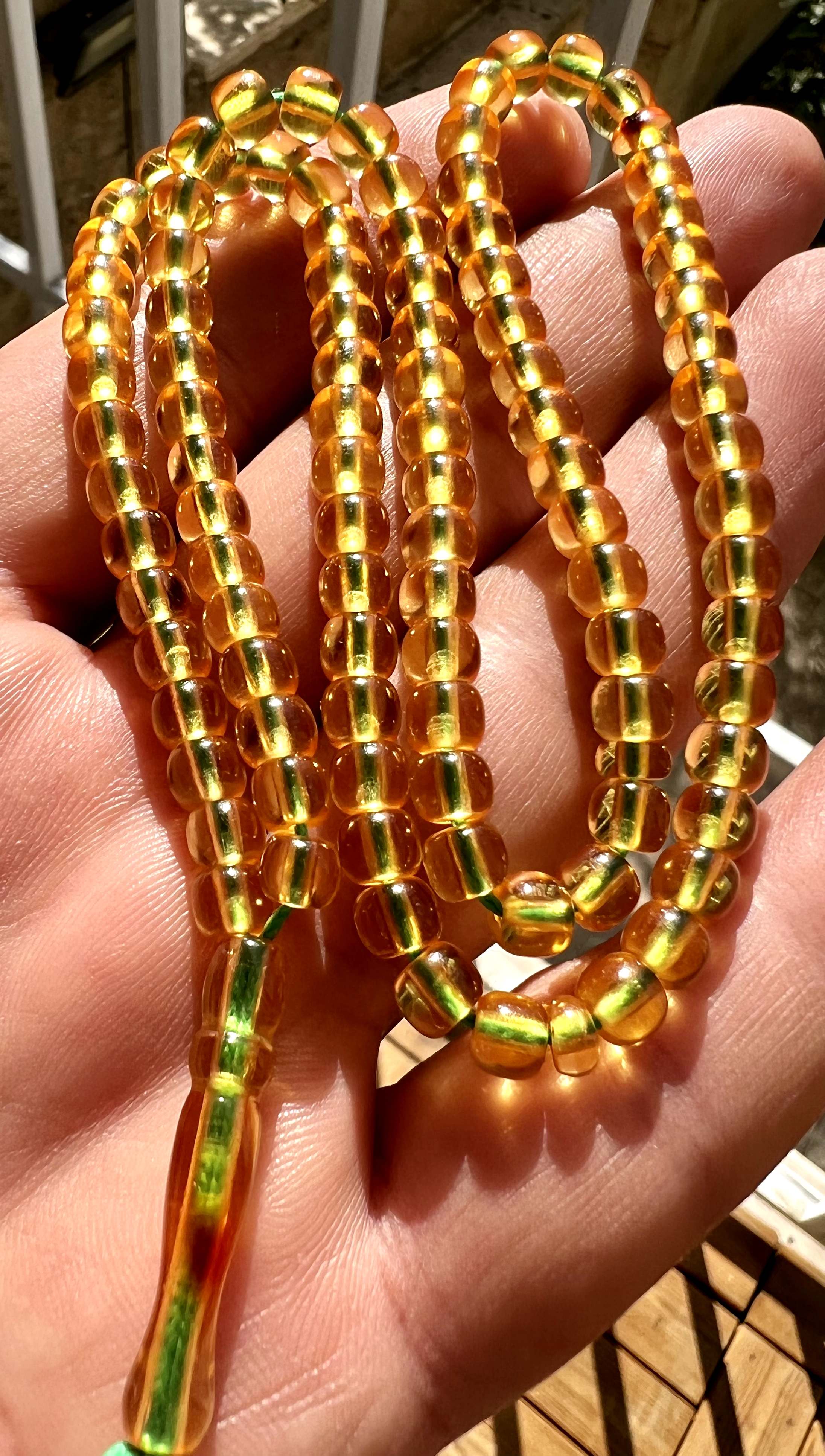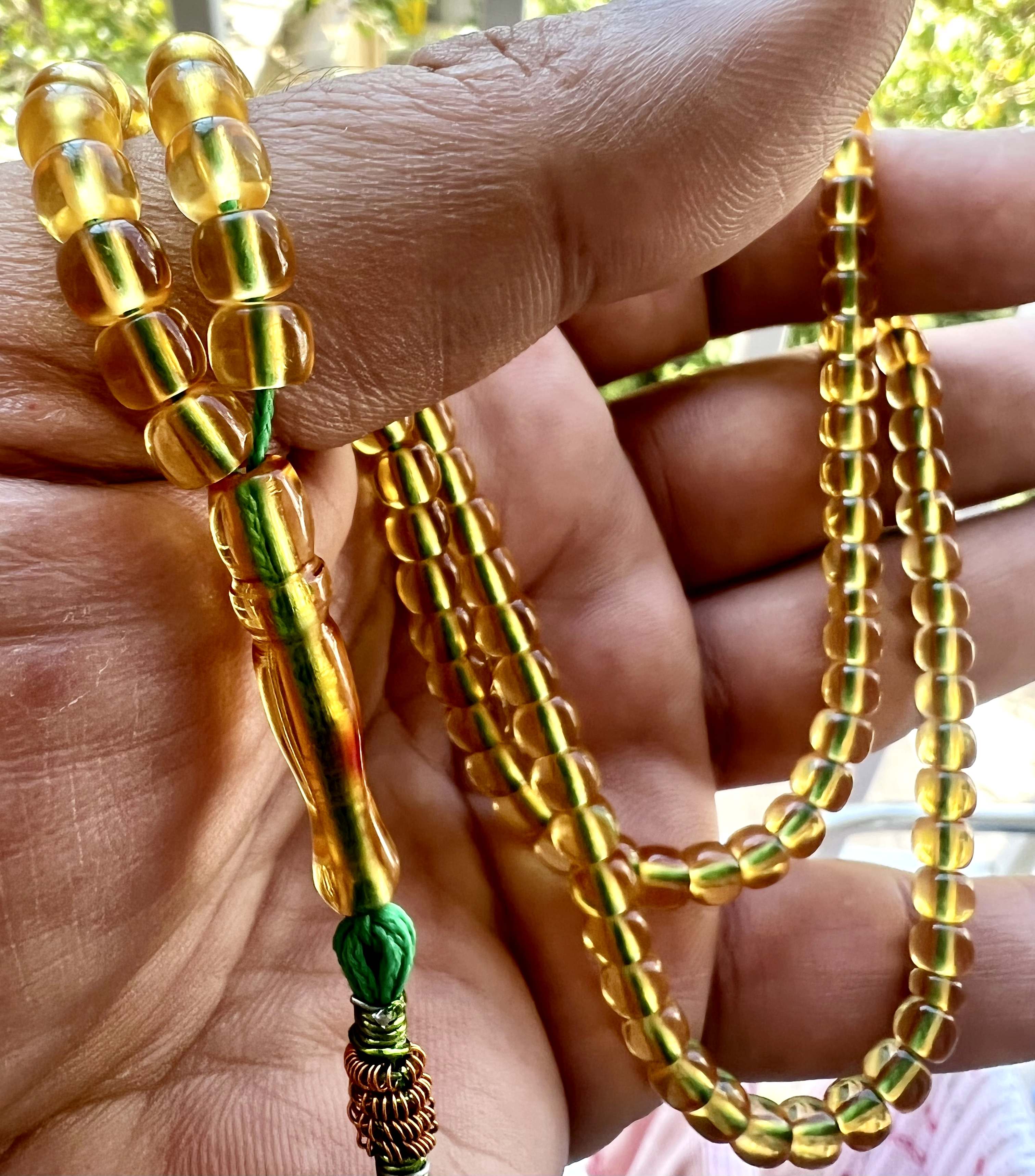 تسبیح سندلوس کهنه آلمان اصل رنگ زرد نباتی دانه ریز ۱۰۱ عددی کد ۳۸۷