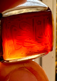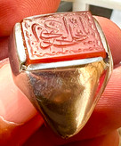 سنگ عقیق سرخ کهنه یمنی معدنی و طبیعی ، تراش مستطیلی به ابعاد ۱۷ در ۱۳ میلیمتر ، و خط زیبای قاجاری ذکر یا علی (ع) ادرکنی سبک ثلث ، تذهیب دار