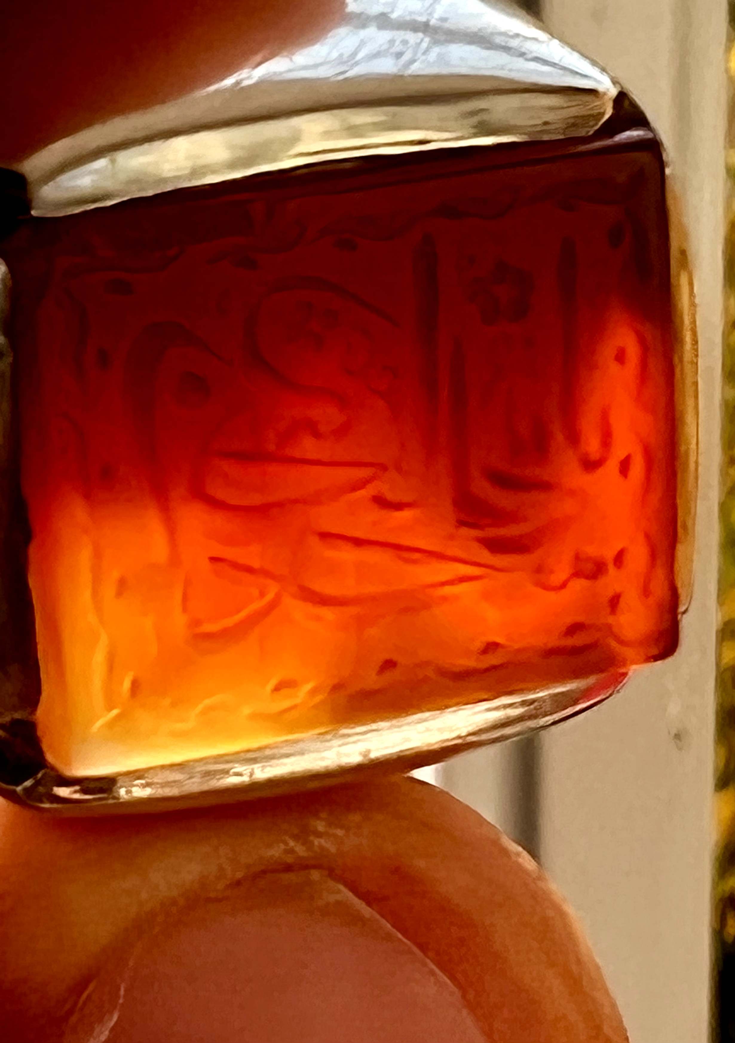 سنگ عقیق سرخ کهنه یمنی معدنی و طبیعی ، تراش مستطیلی به ابعاد ۱۷ در ۱۳ میلیمتر ، و خط زیبای قاجاری ذکر یا علی (ع) ادرکنی سبک ثلث ، تذهیب دار