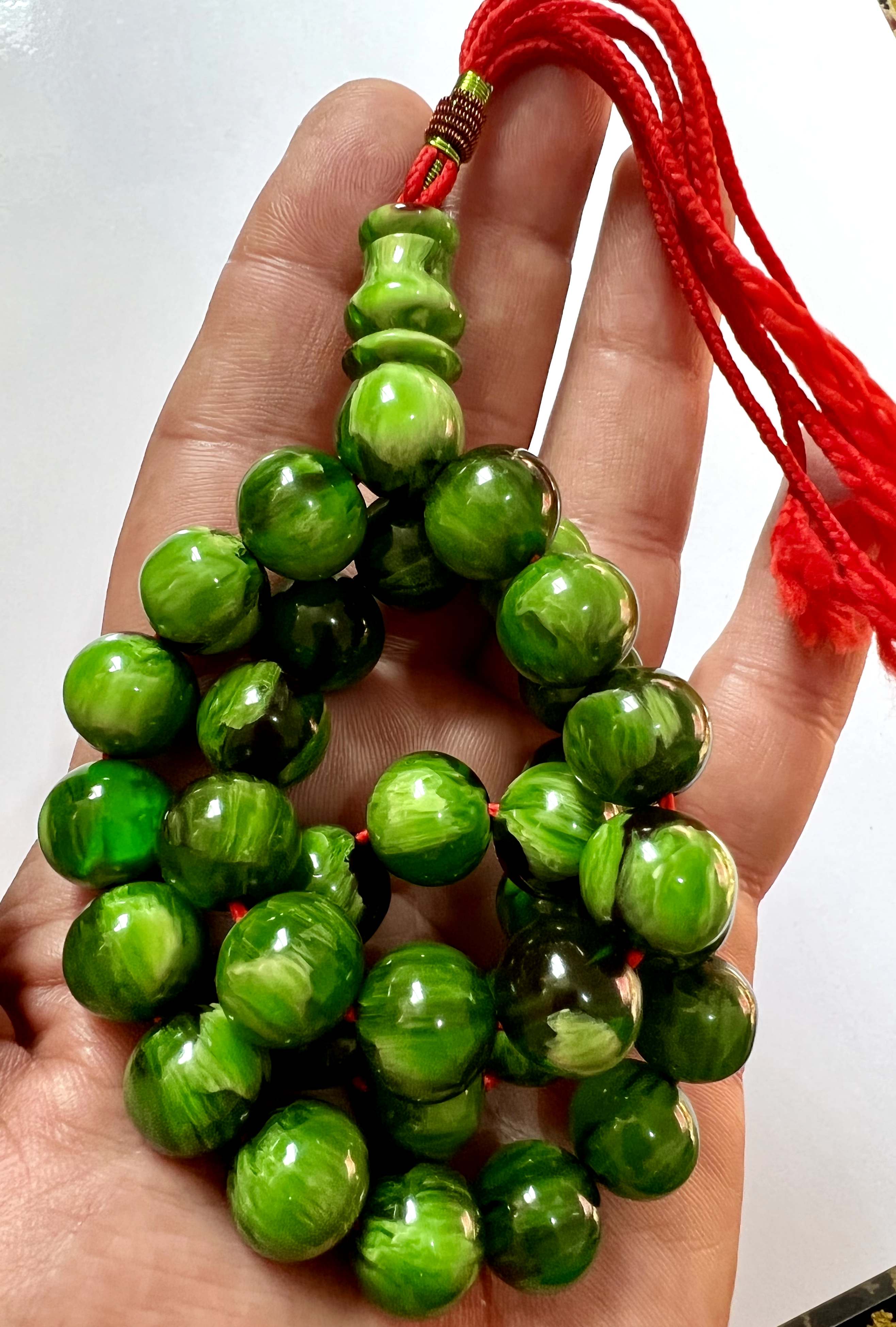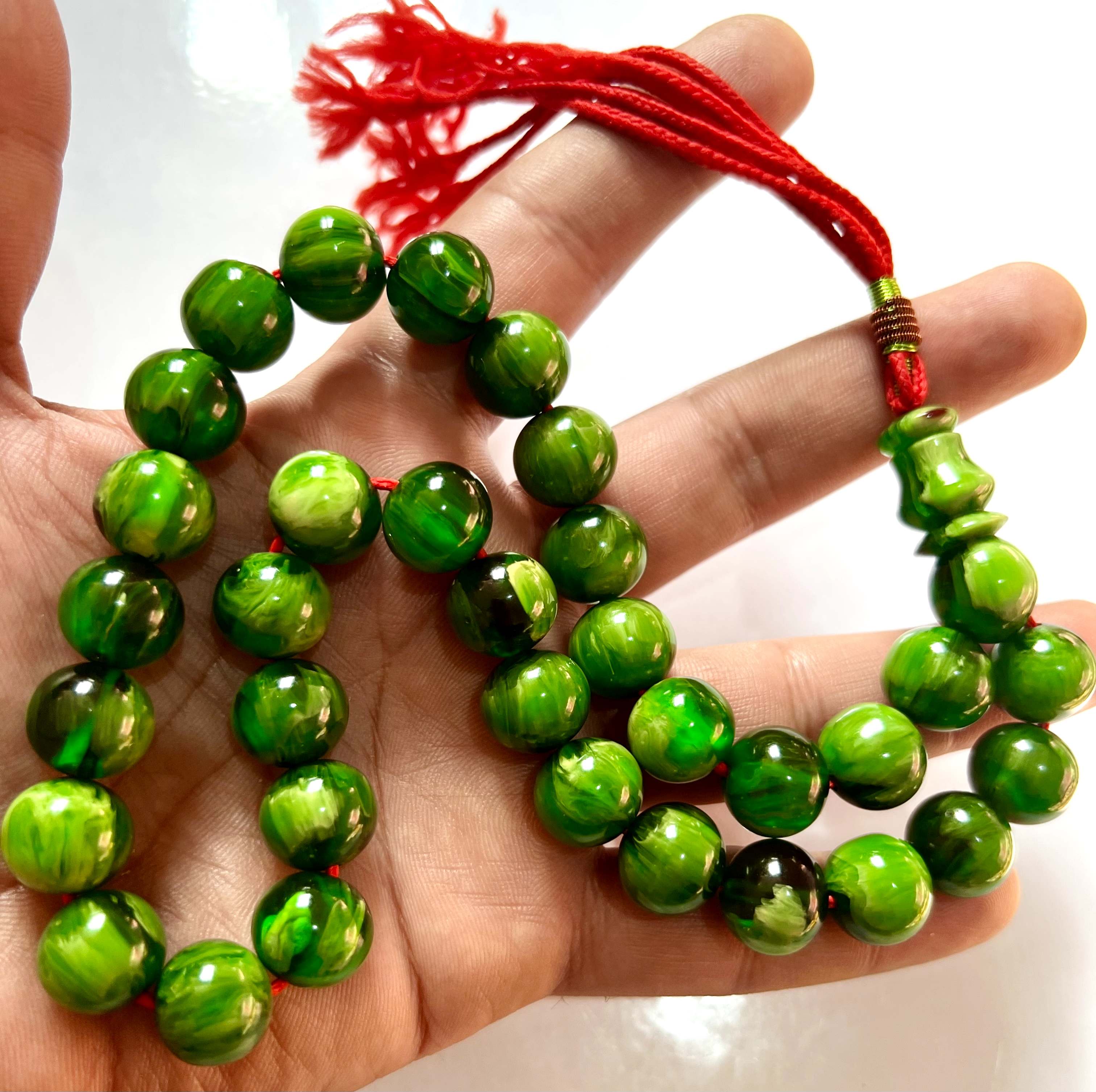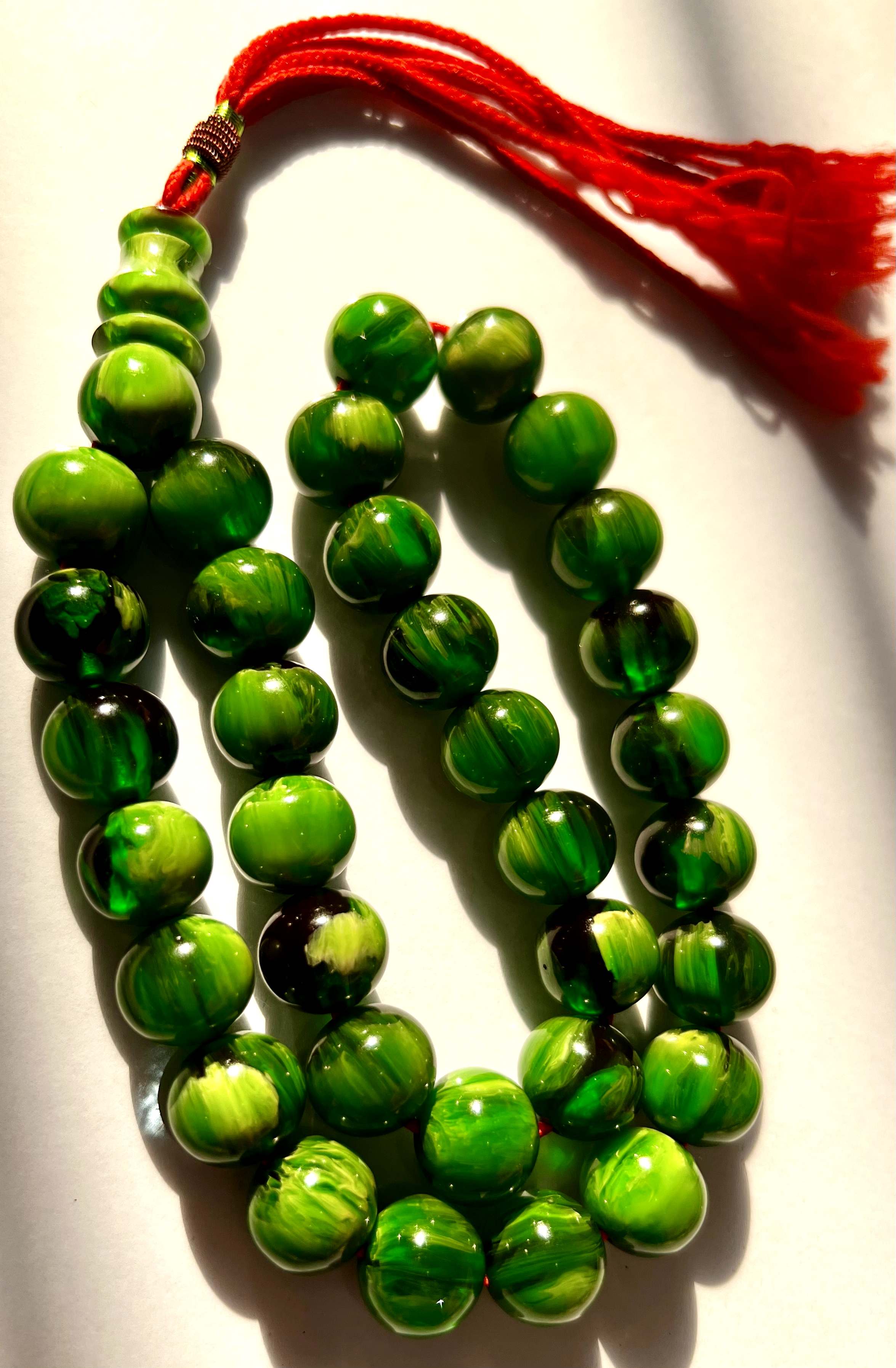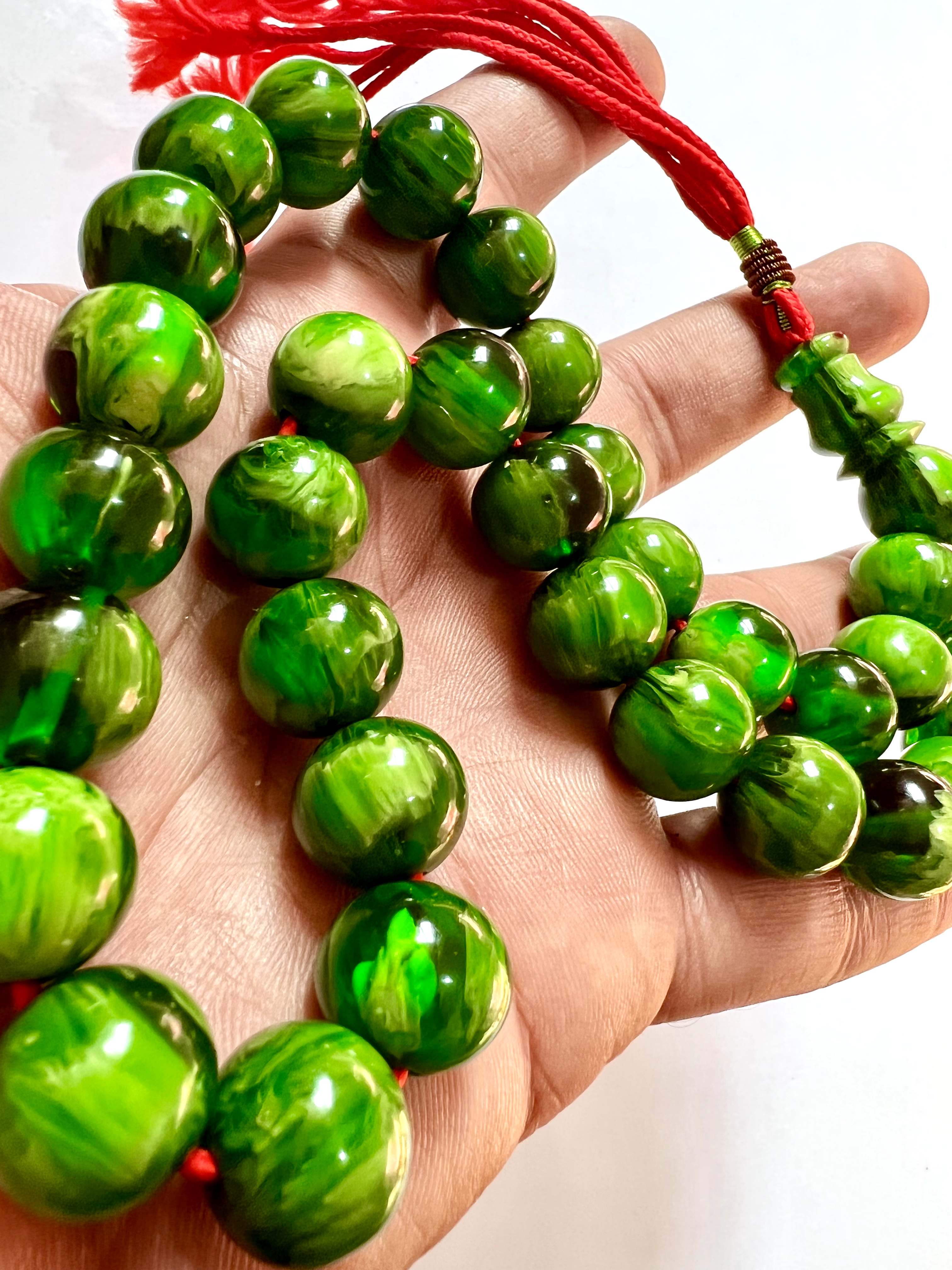 تسبیح کهربای کهکشانی سبز رگه دار با کیفیت تراش ۵ ساله کد ۴۱۴