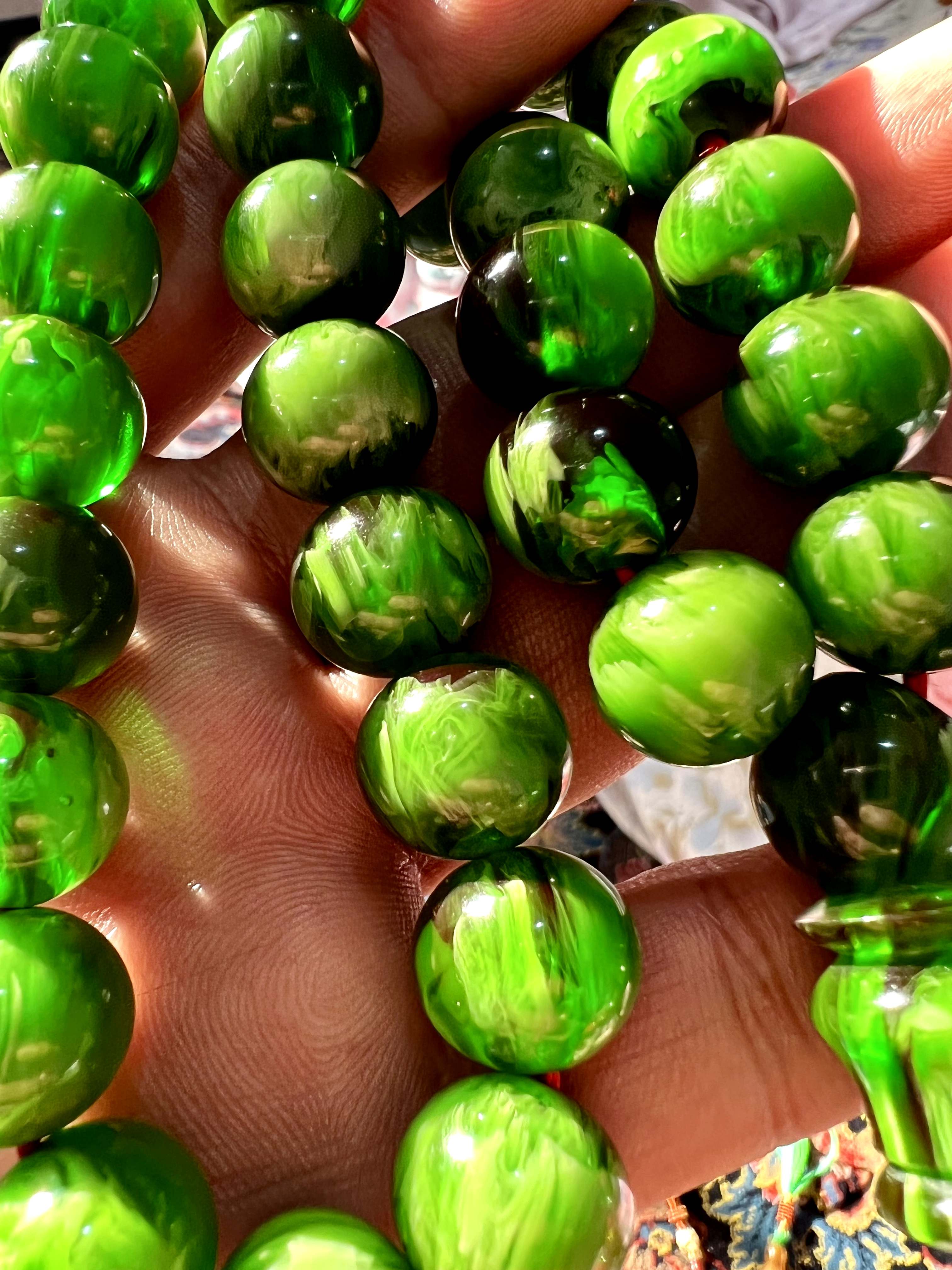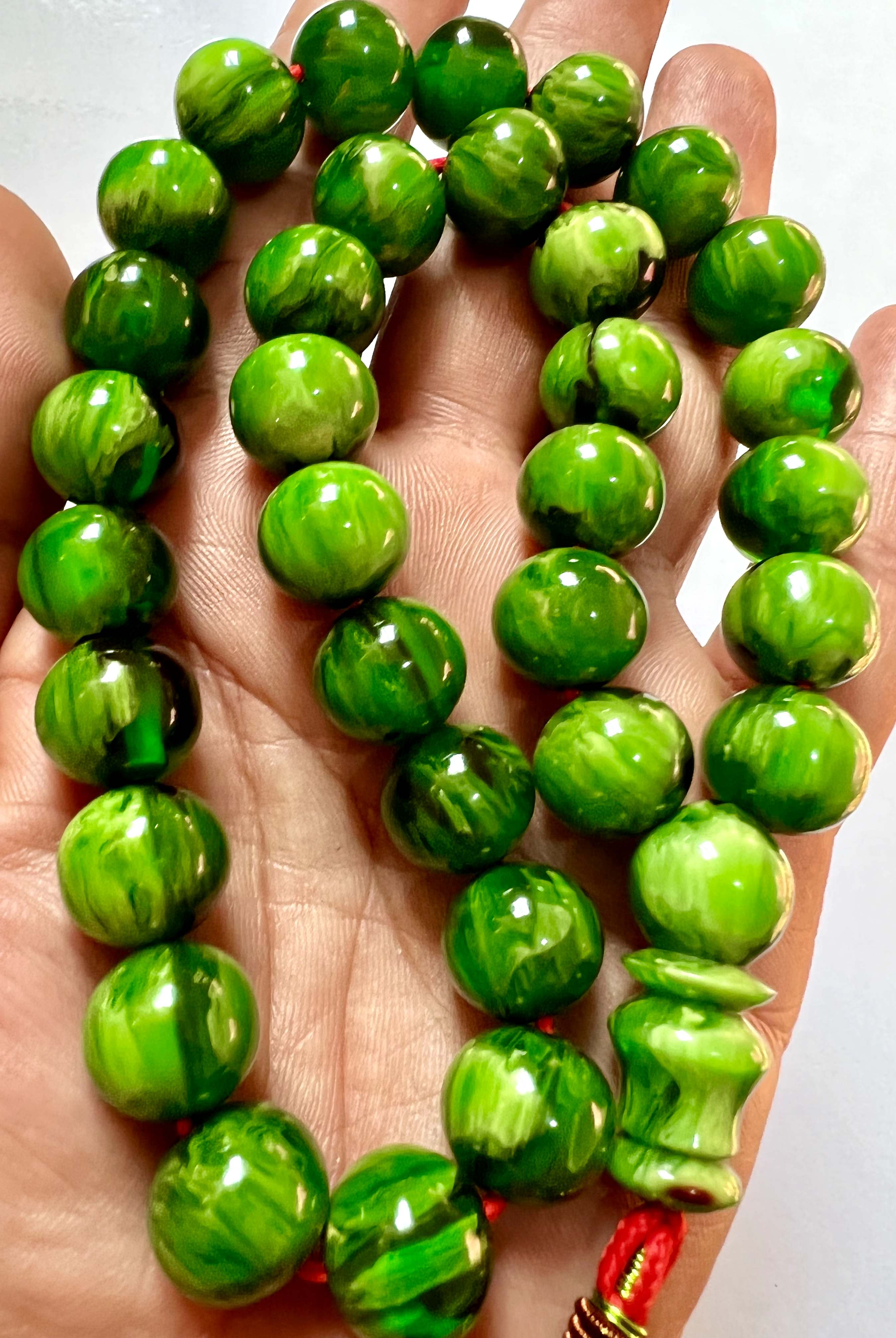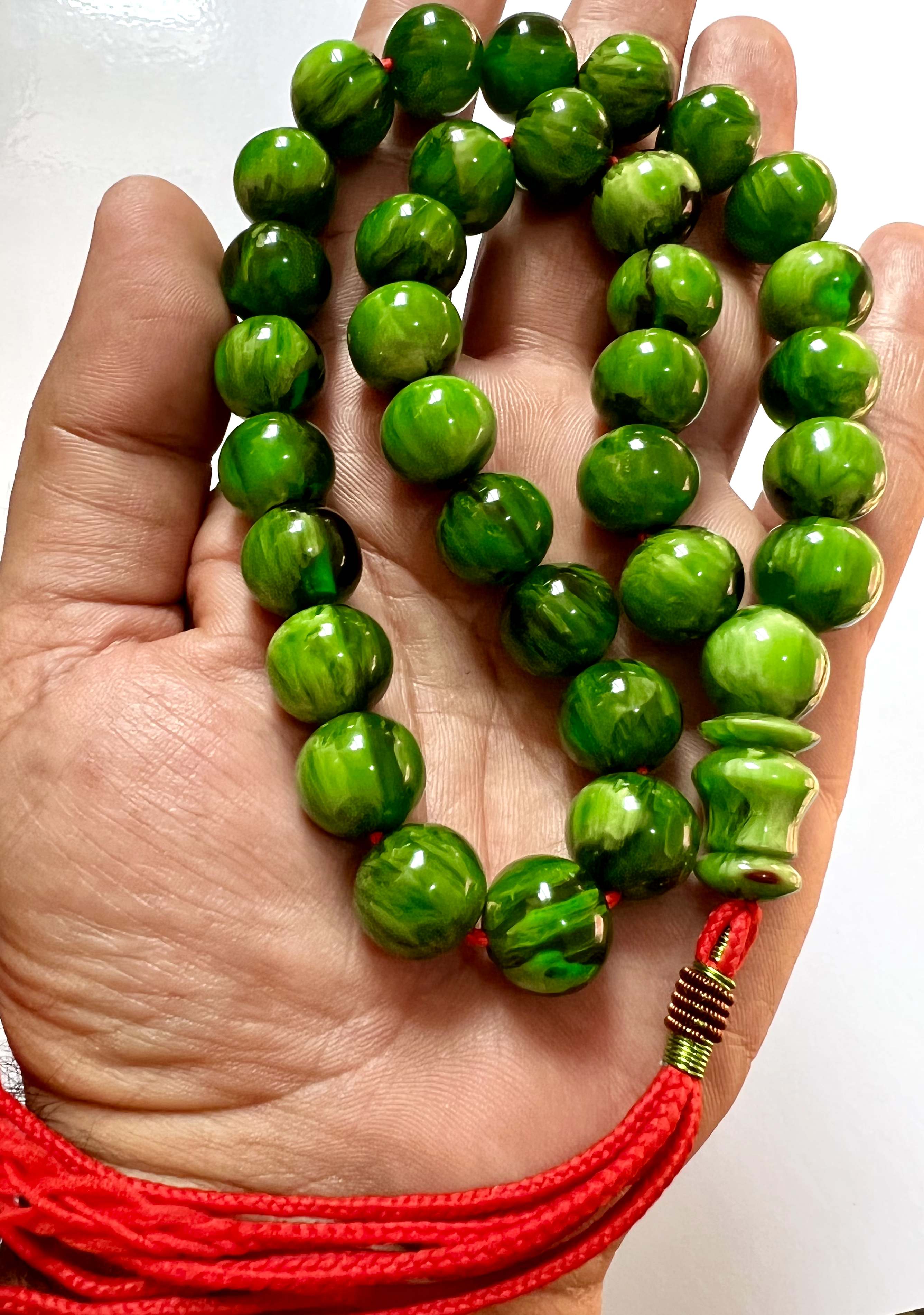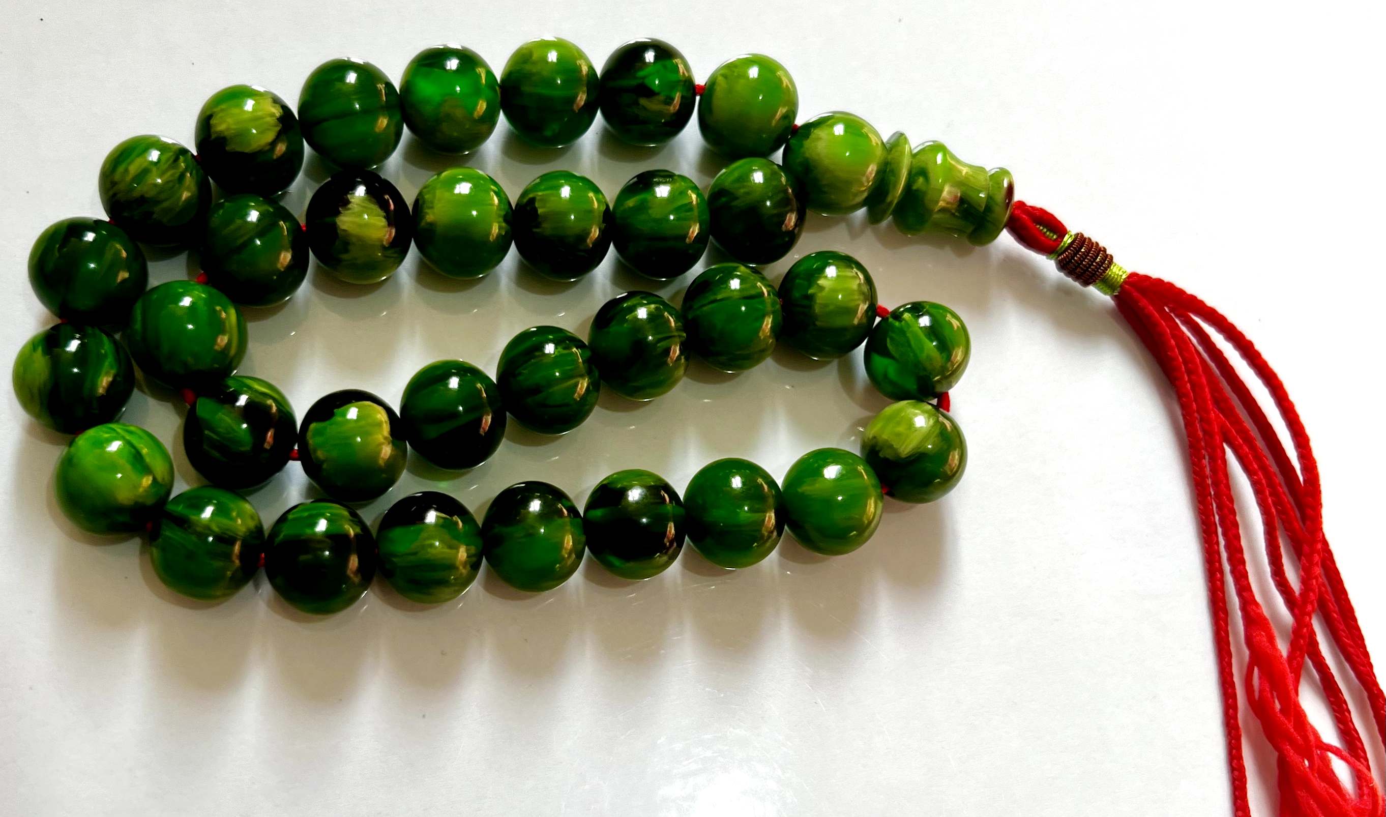 تسبیح کهربای کهکشانی سبز رگه دار با کیفیت تراش ۵ ساله کد ۴۱۴