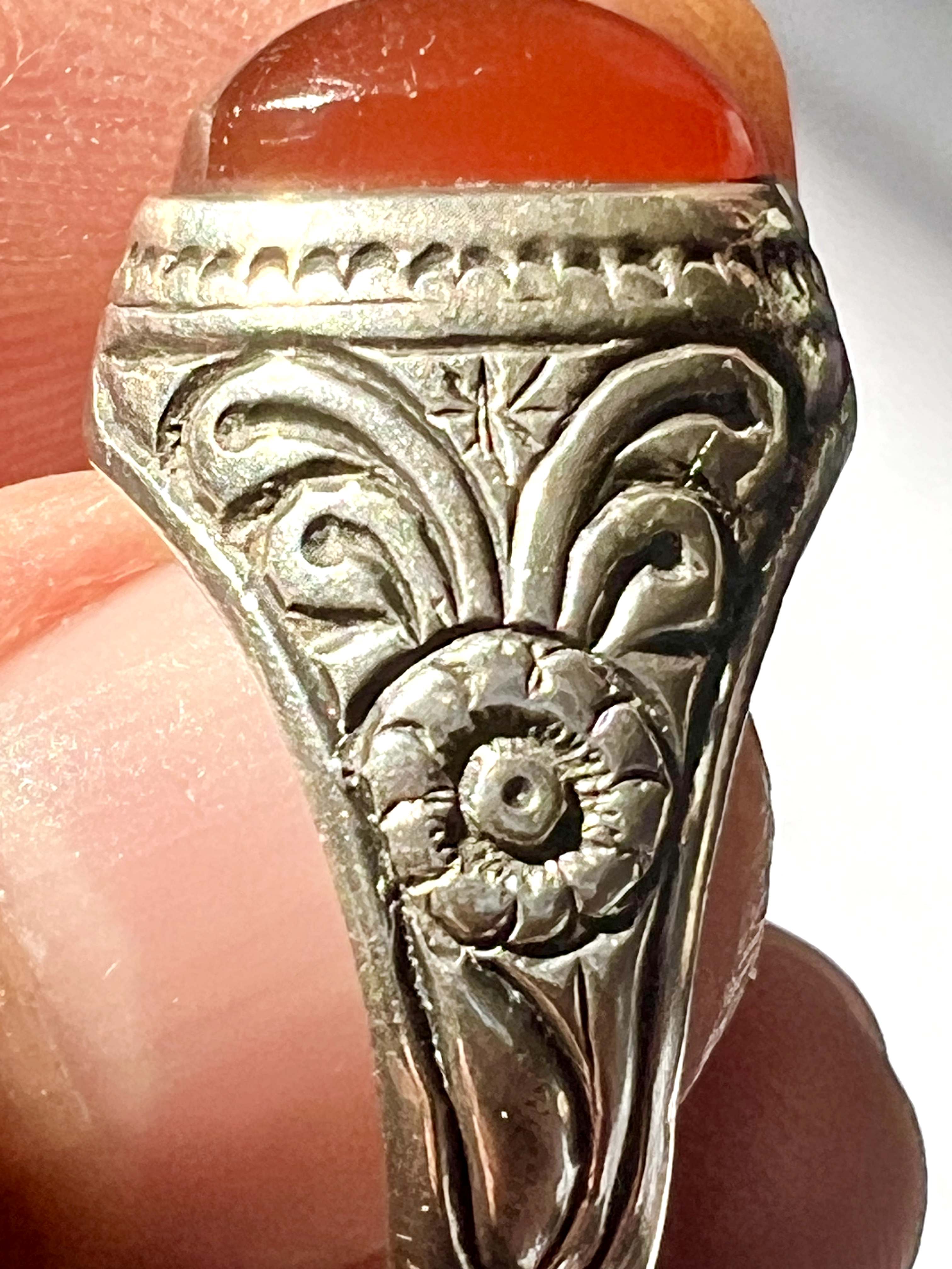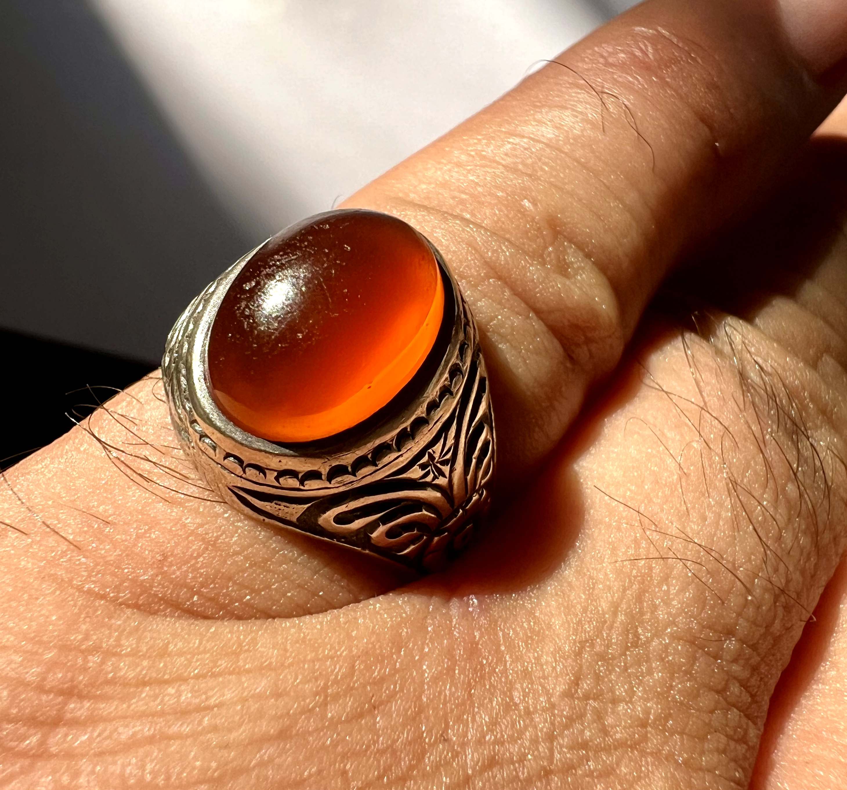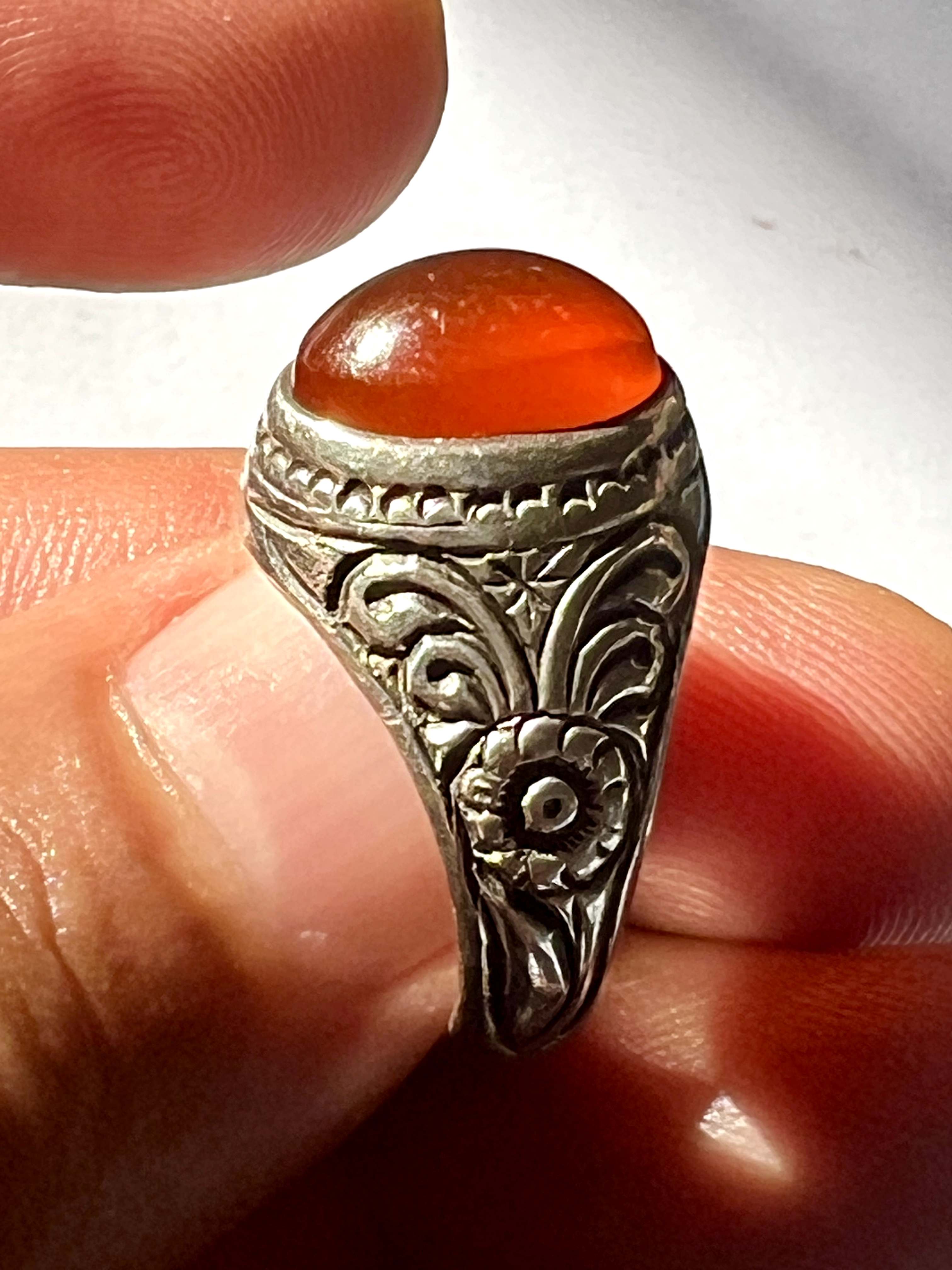 انگشتر عقیق کهنه یمن با رکاب قلمزنی کمیاب استاد میرزا جعفر قدیمیان ،کلکسیونی و بکر کد ۴۲۴