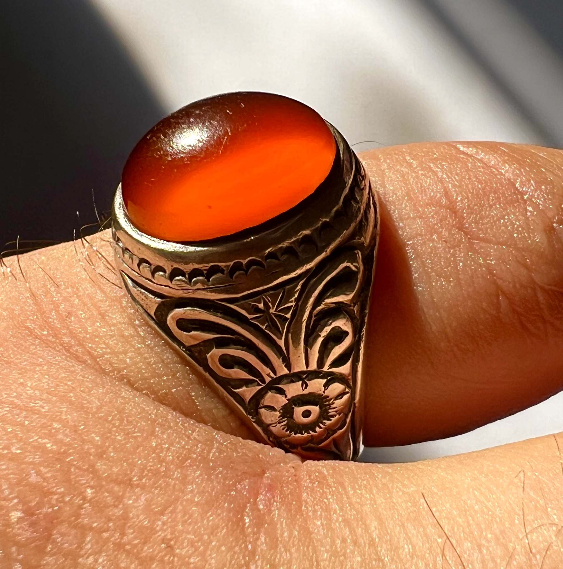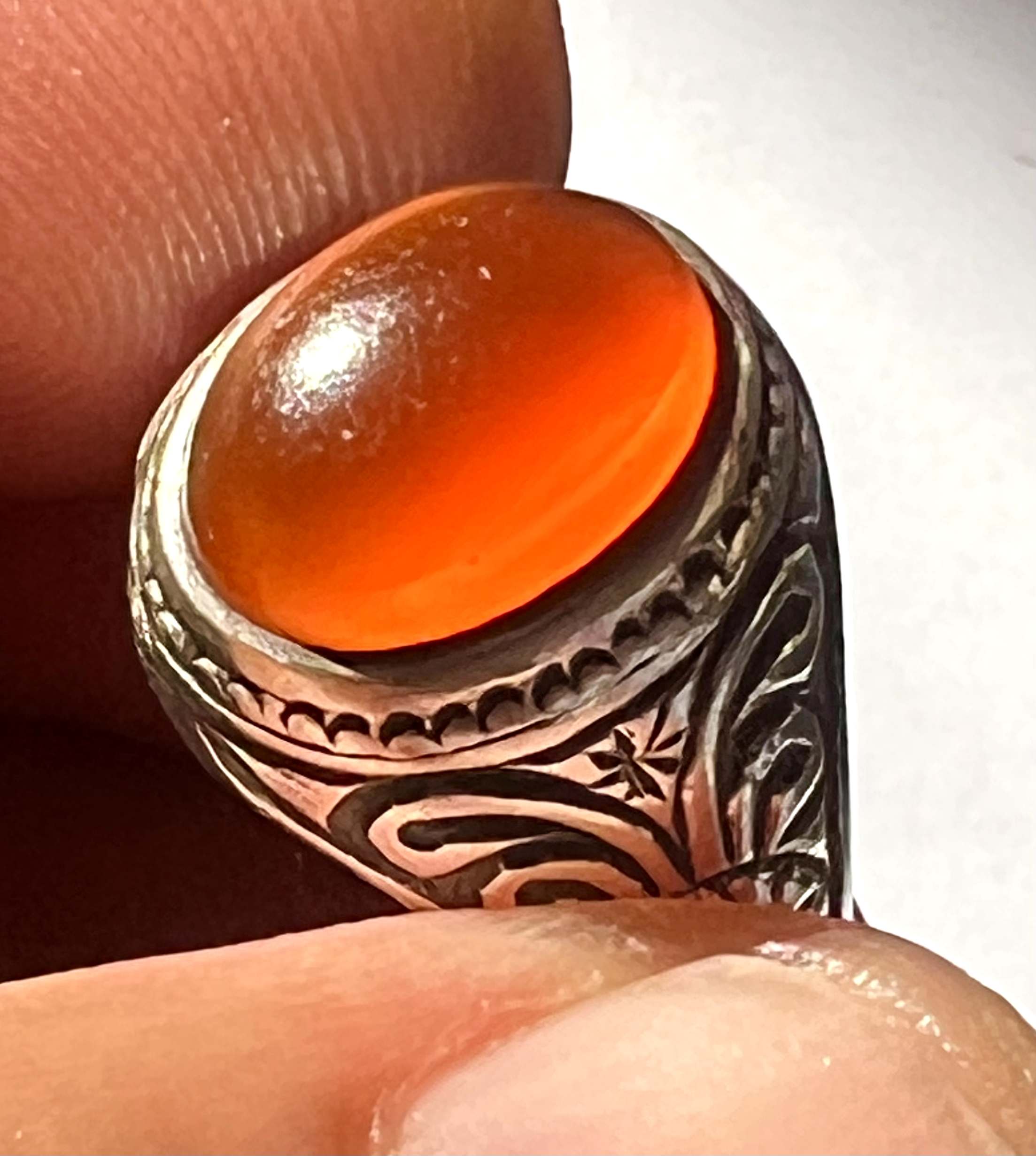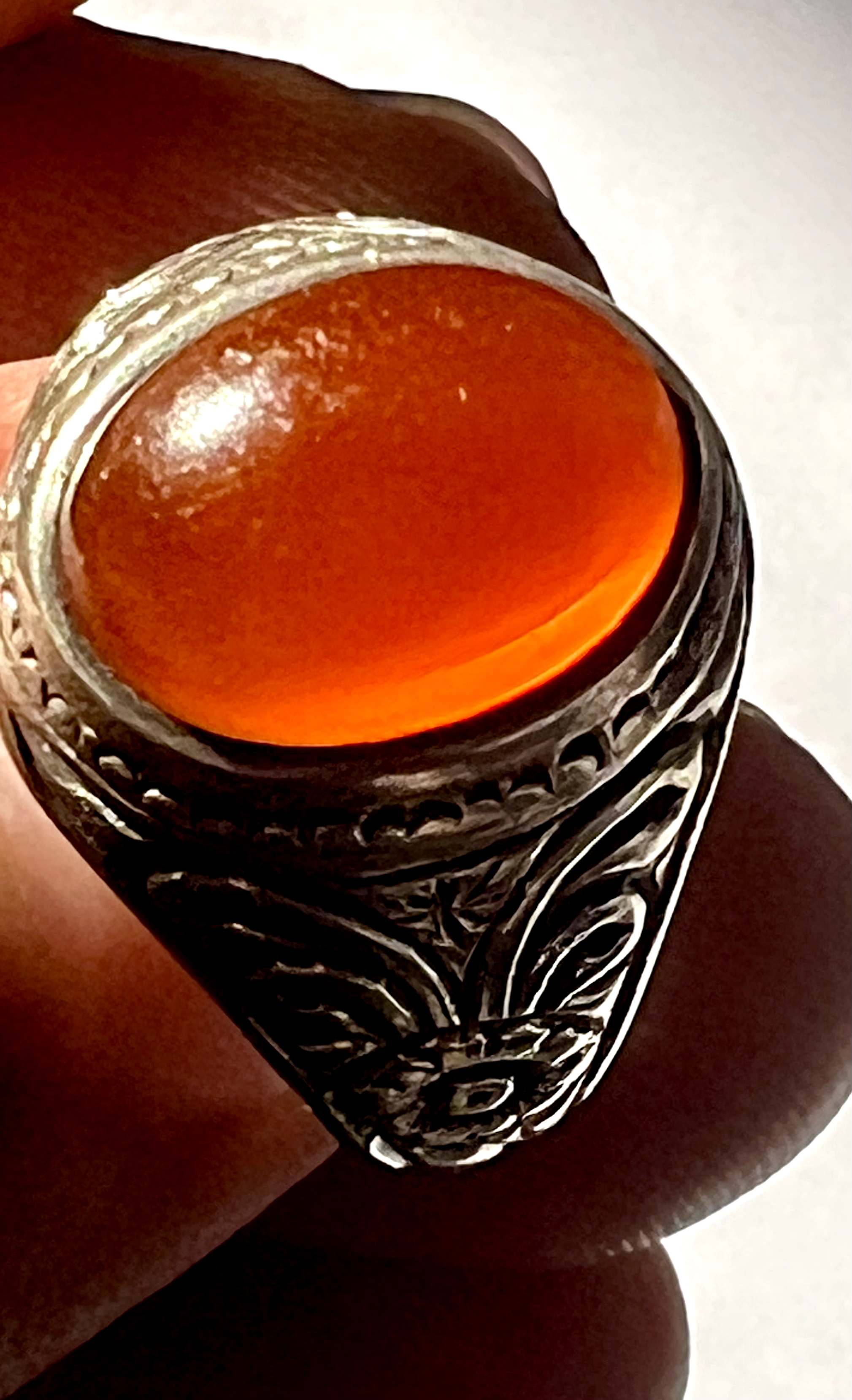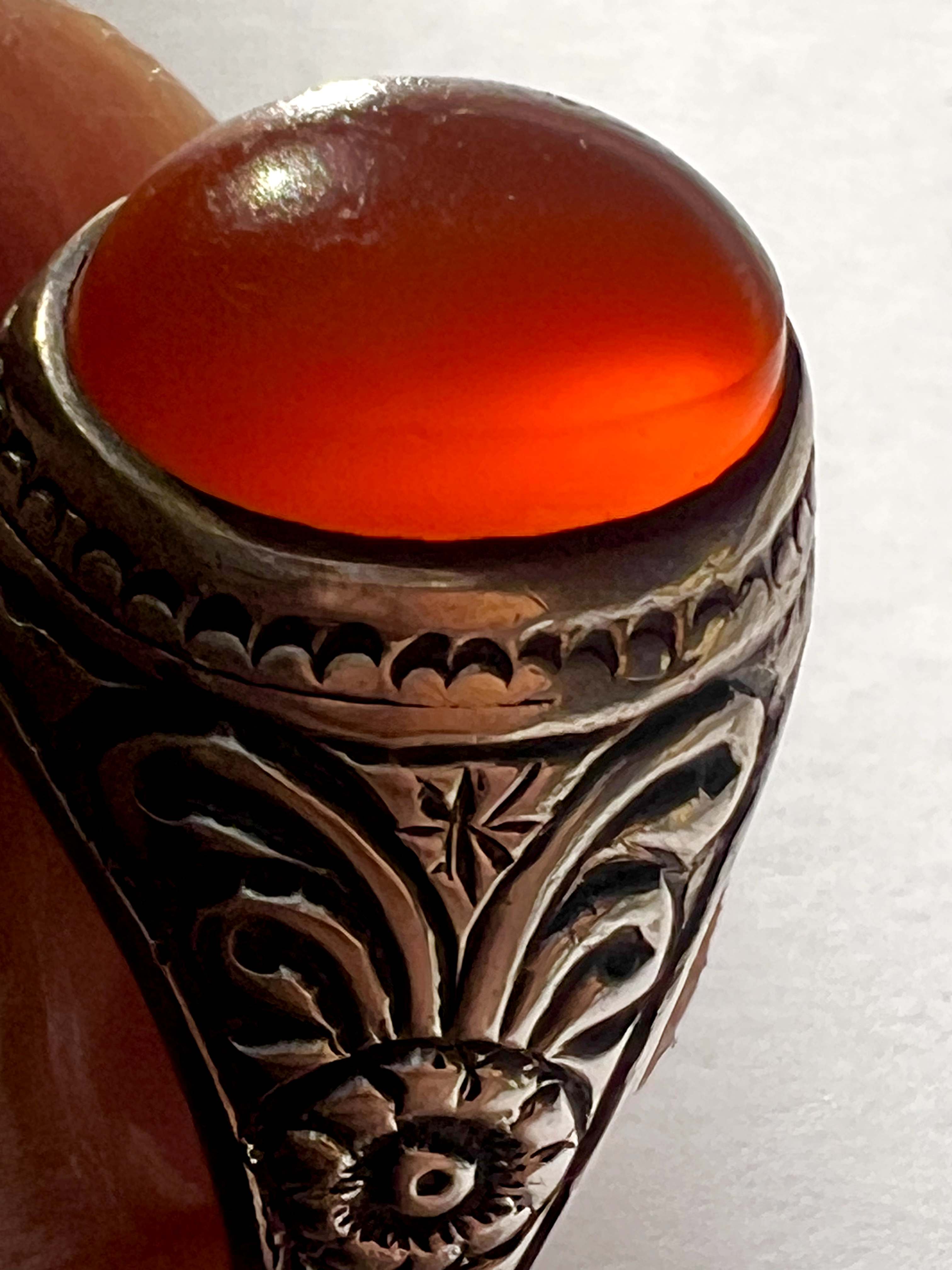 انگشتر عقیق کهنه یمن با رکاب قلمزنی کمیاب استاد میرزا جعفر قدیمیان ،کلکسیونی و بکر کد ۴۲۴