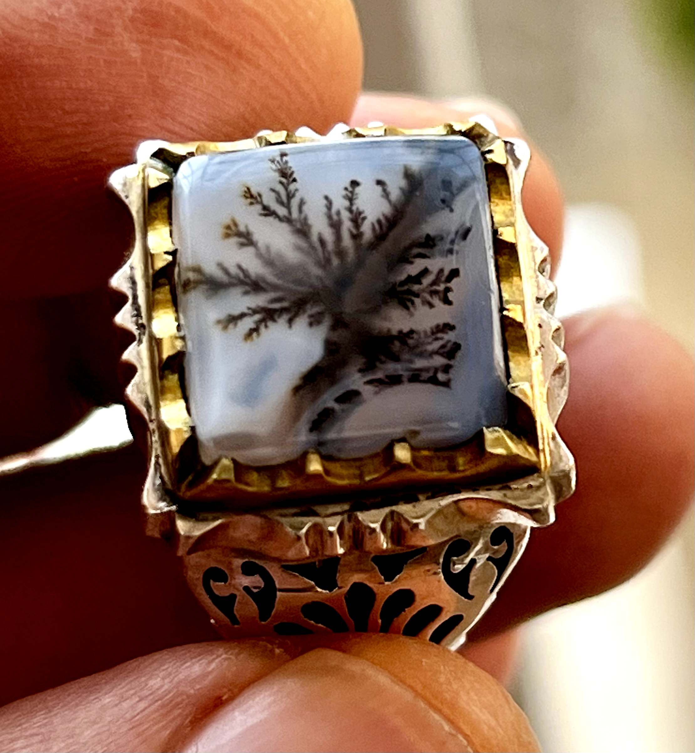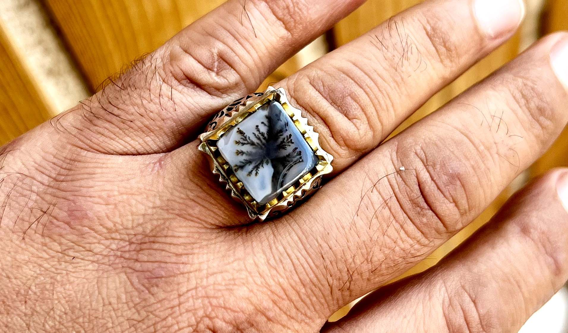 انگشتر سنگ عقیق معدنی و طبیعی شجر تک درخت قاین اصل رکاب استاد مجردیان کد ۴۳۲