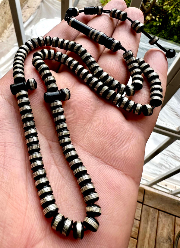 تسبیح چوب آبنوس کهنه کلکسیونی تمام نقره کوبی شده ۱۰۱ دانه کد ۴۳۳