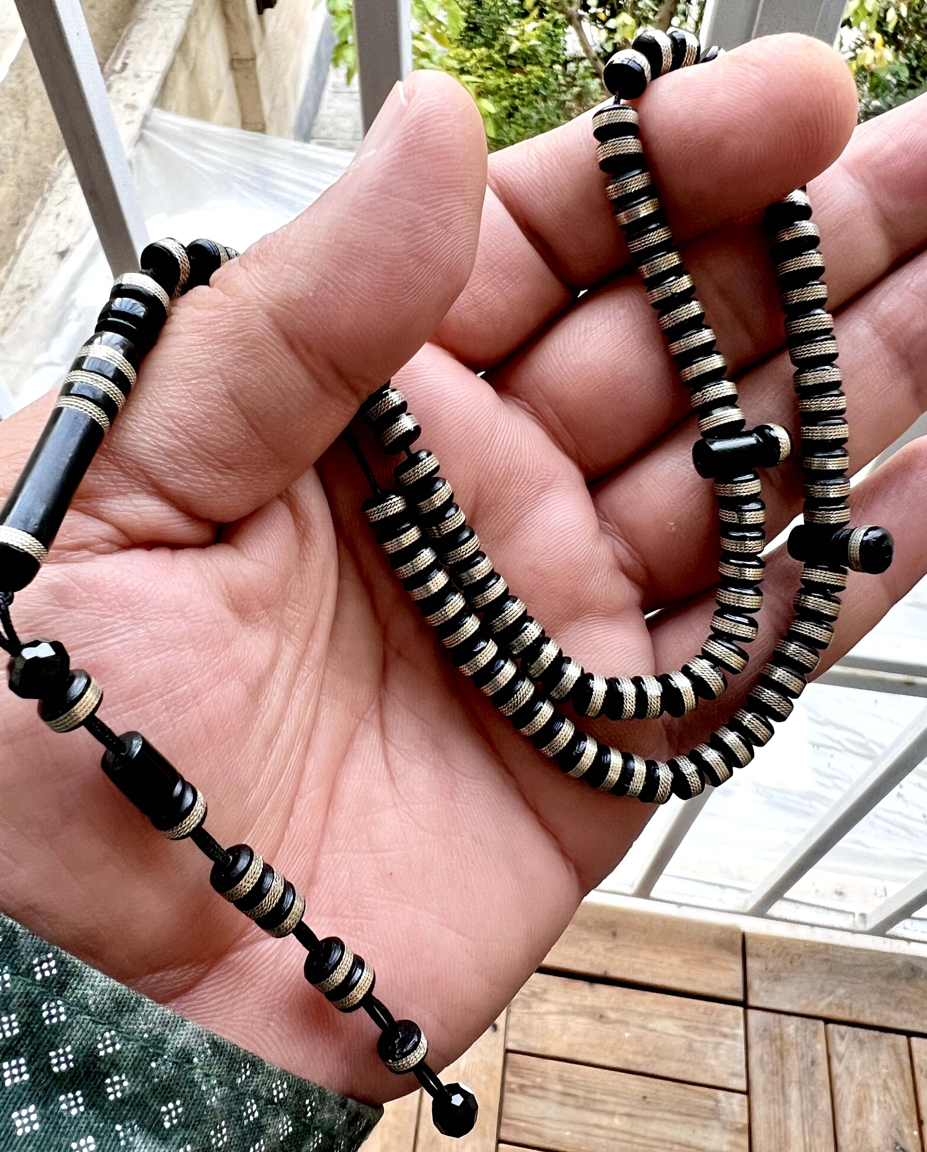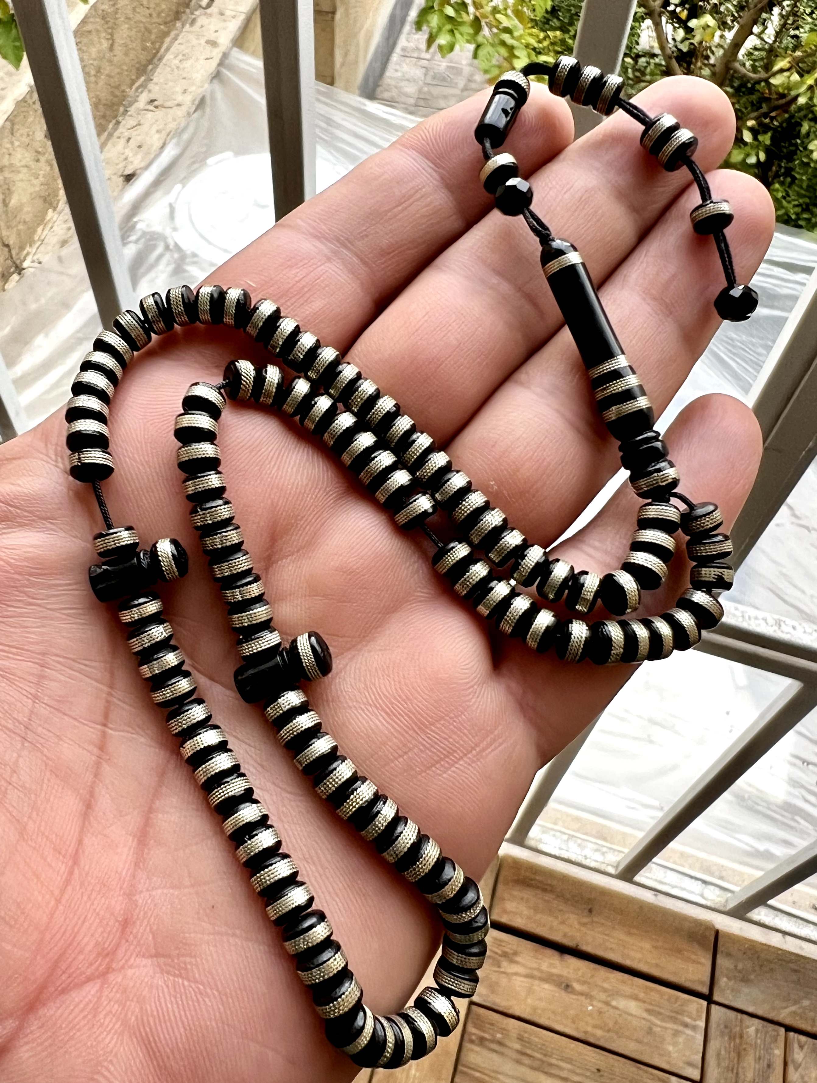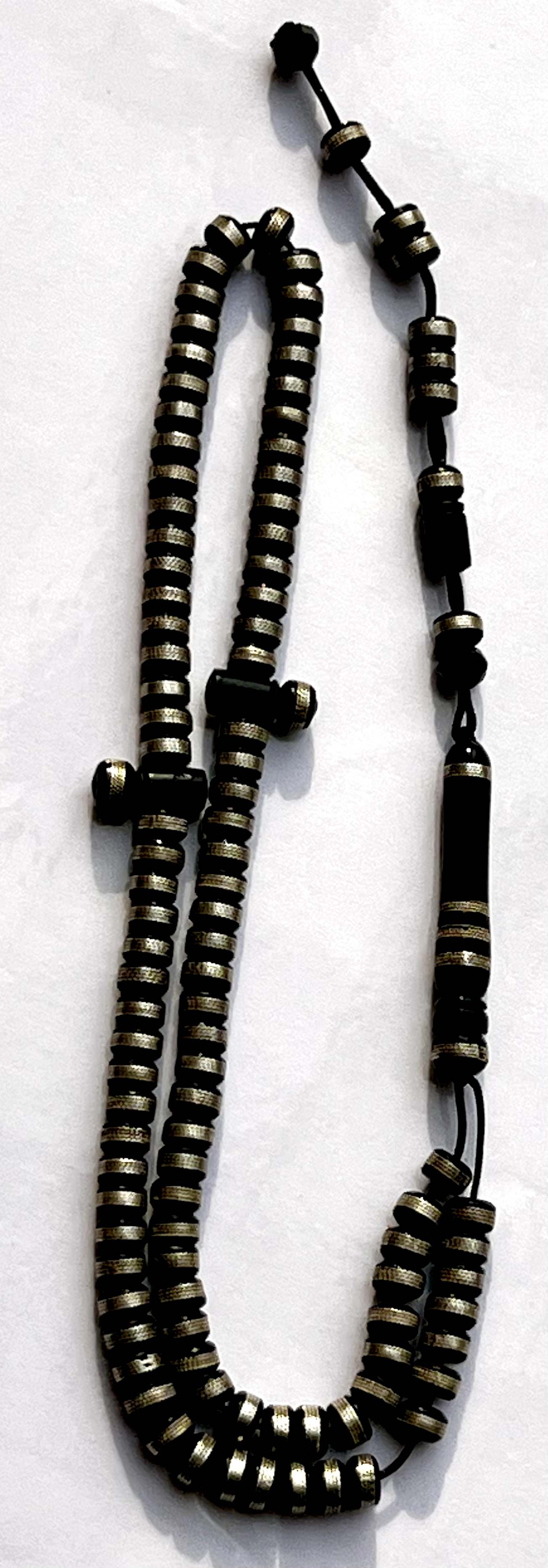 تسبیح چوب آبنوس کهنه کلکسیونی تمام نقره کوبی شده ۱۰۱ دانه کد ۴۳۳