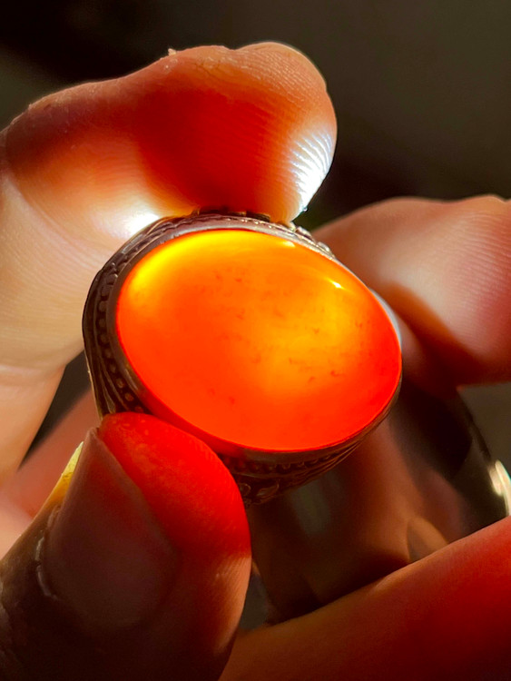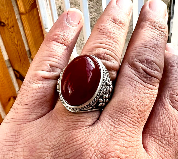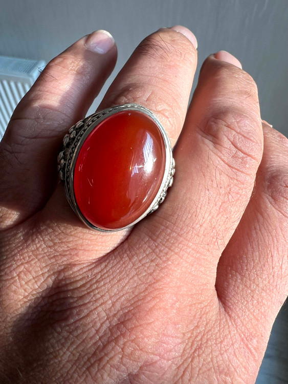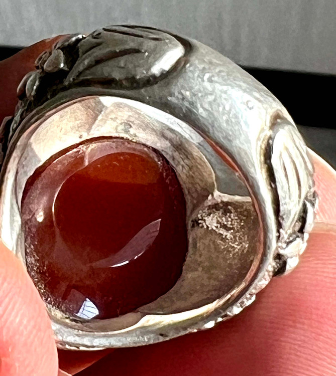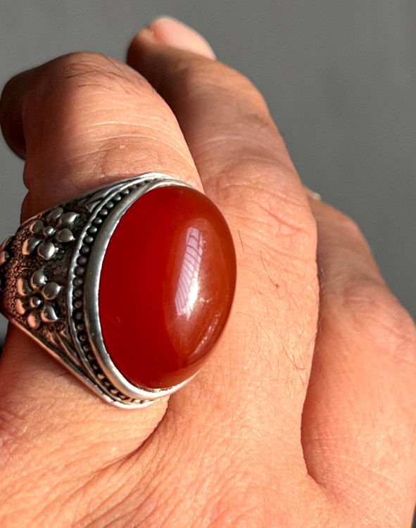 انگشتر نقره قدیمی قواره دار ، قلمزنی برجسته با عقیق کهنه کبدی یمنی