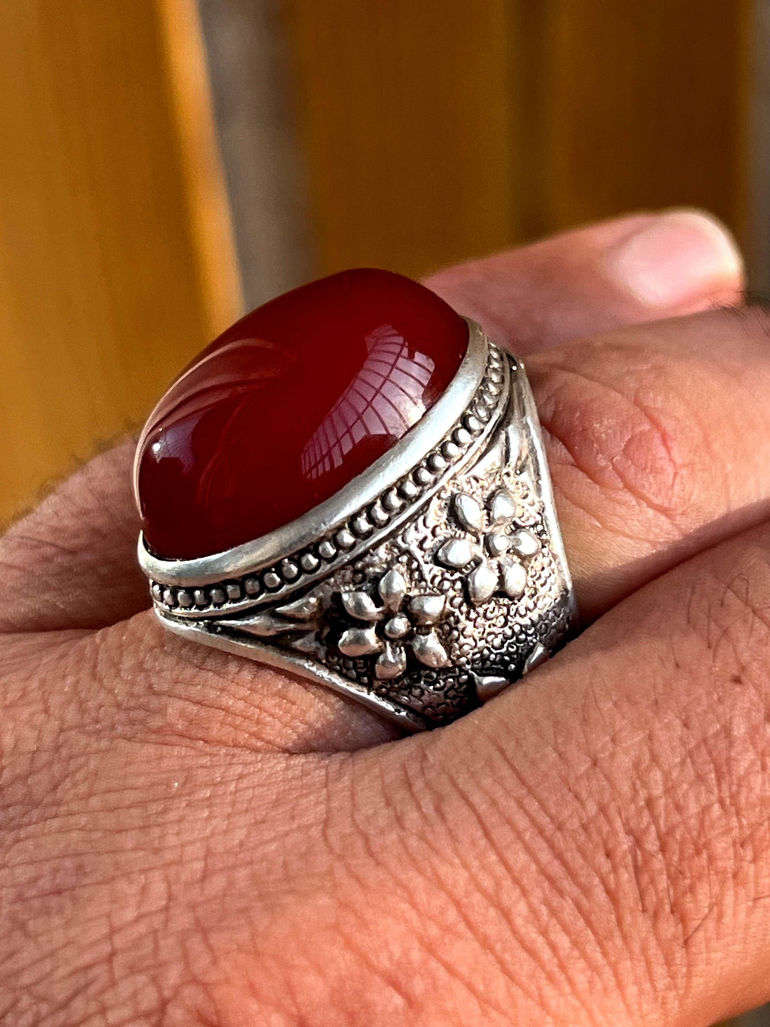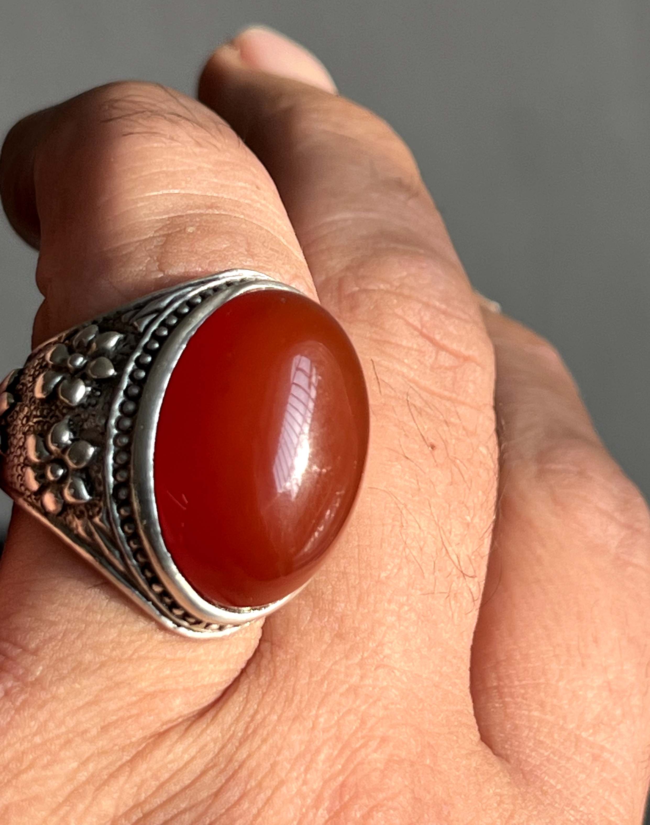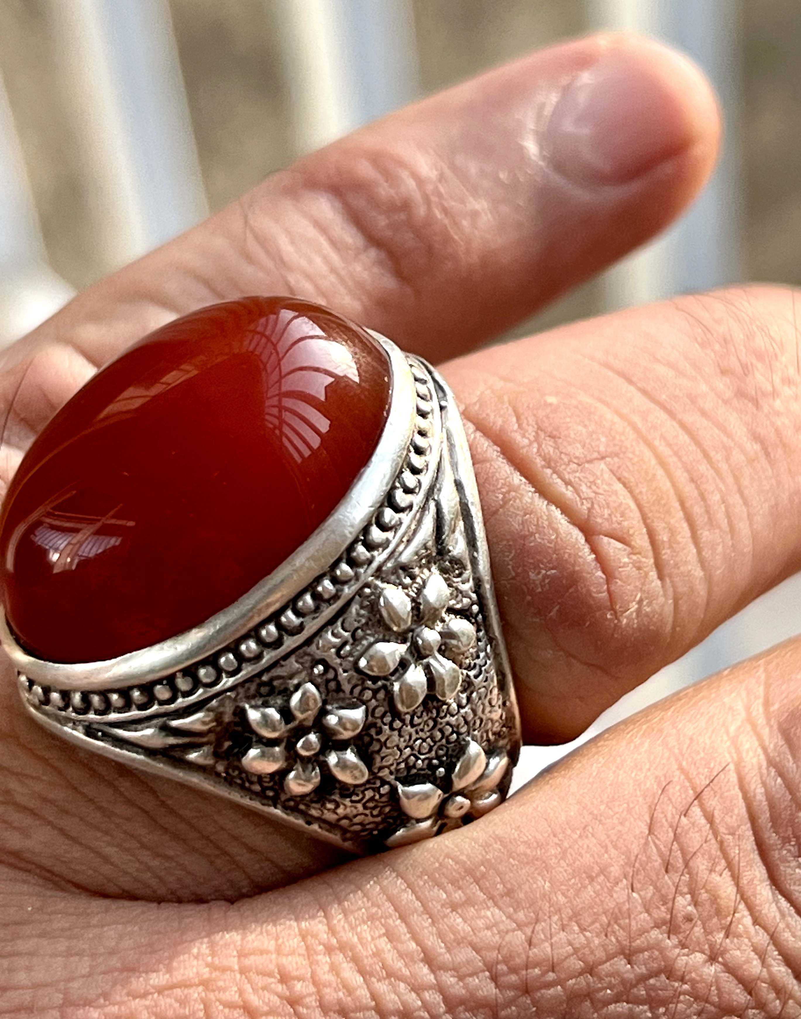 انگشتر نقره قدیمی قواره دار ، قلمزنی برجسته با عقیق کهنه کبدی یمنی