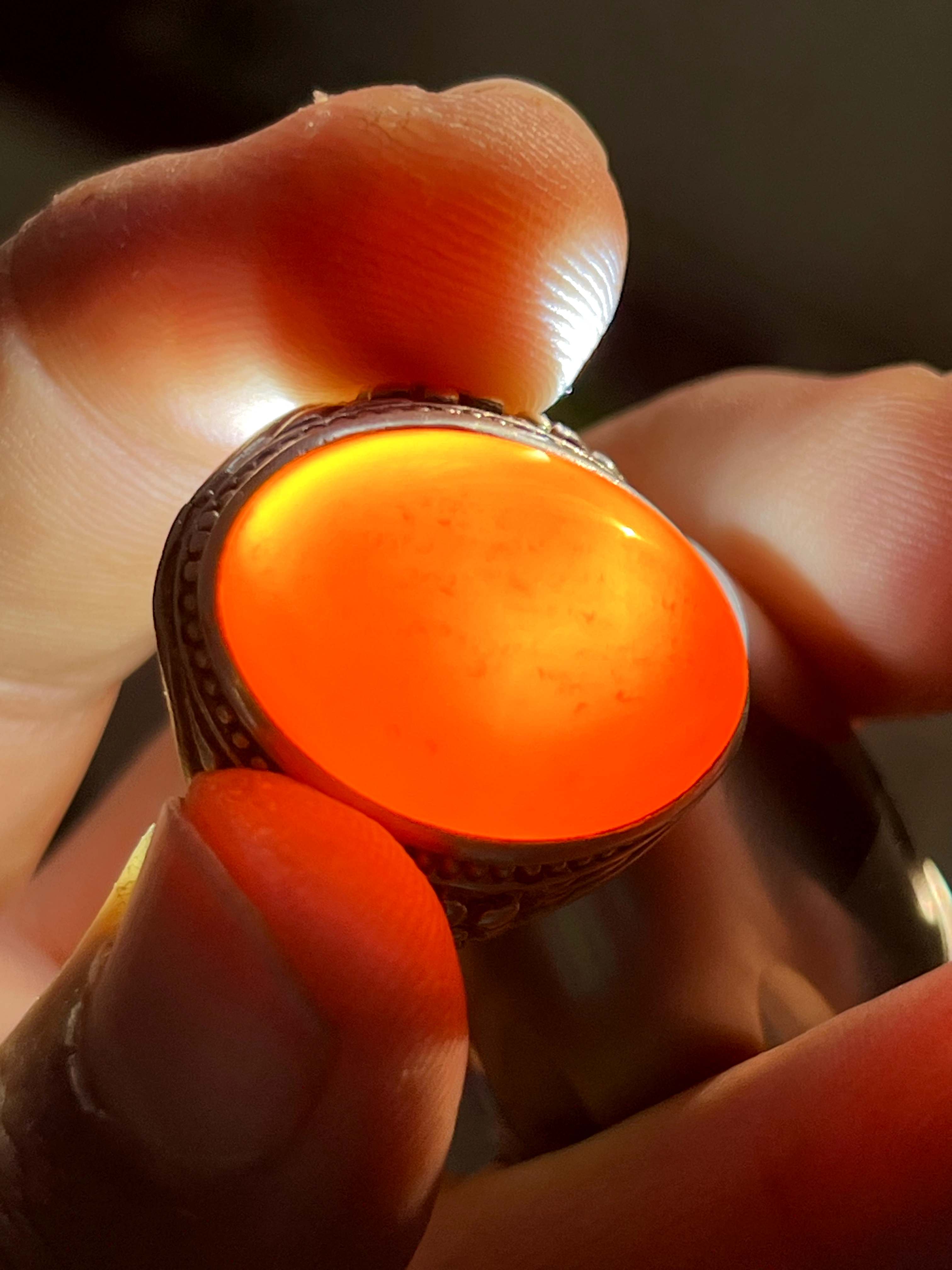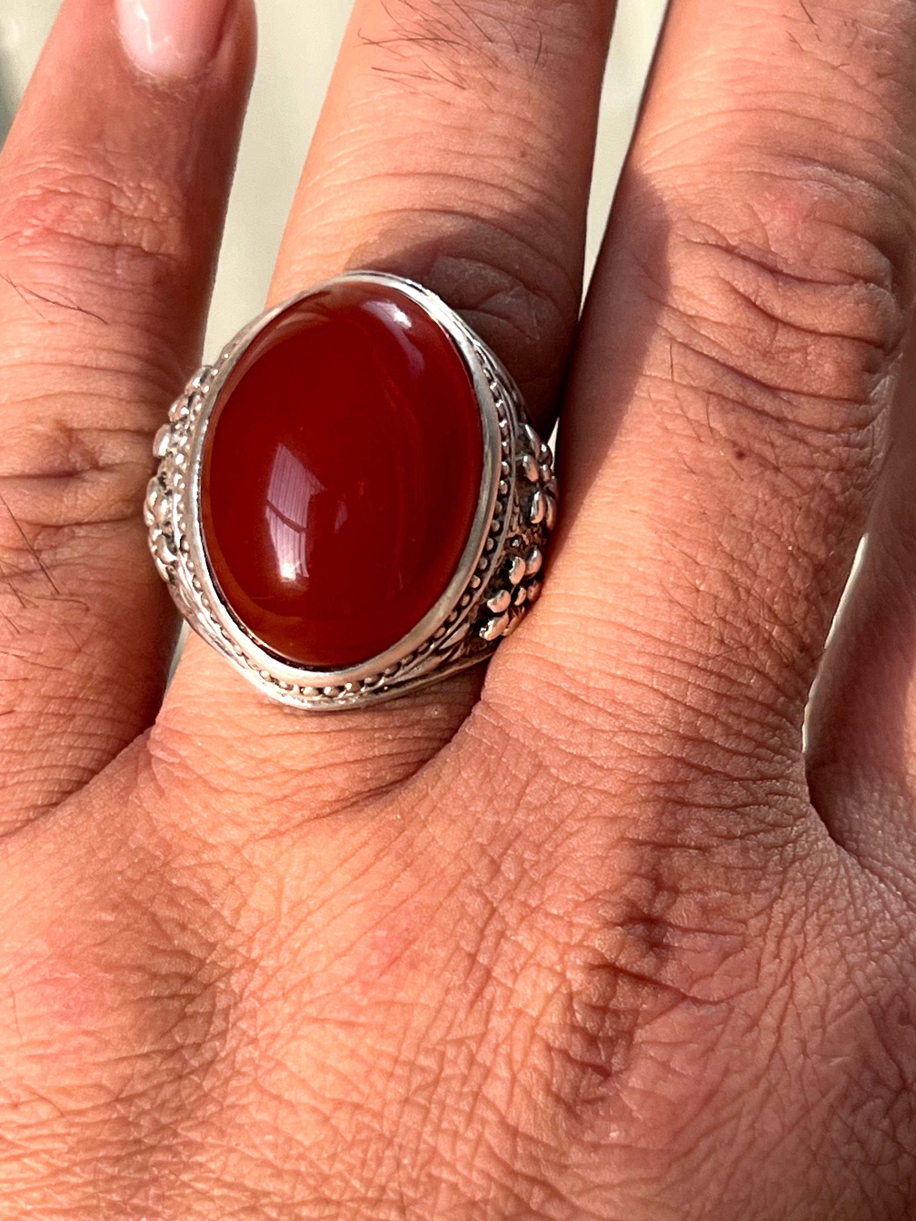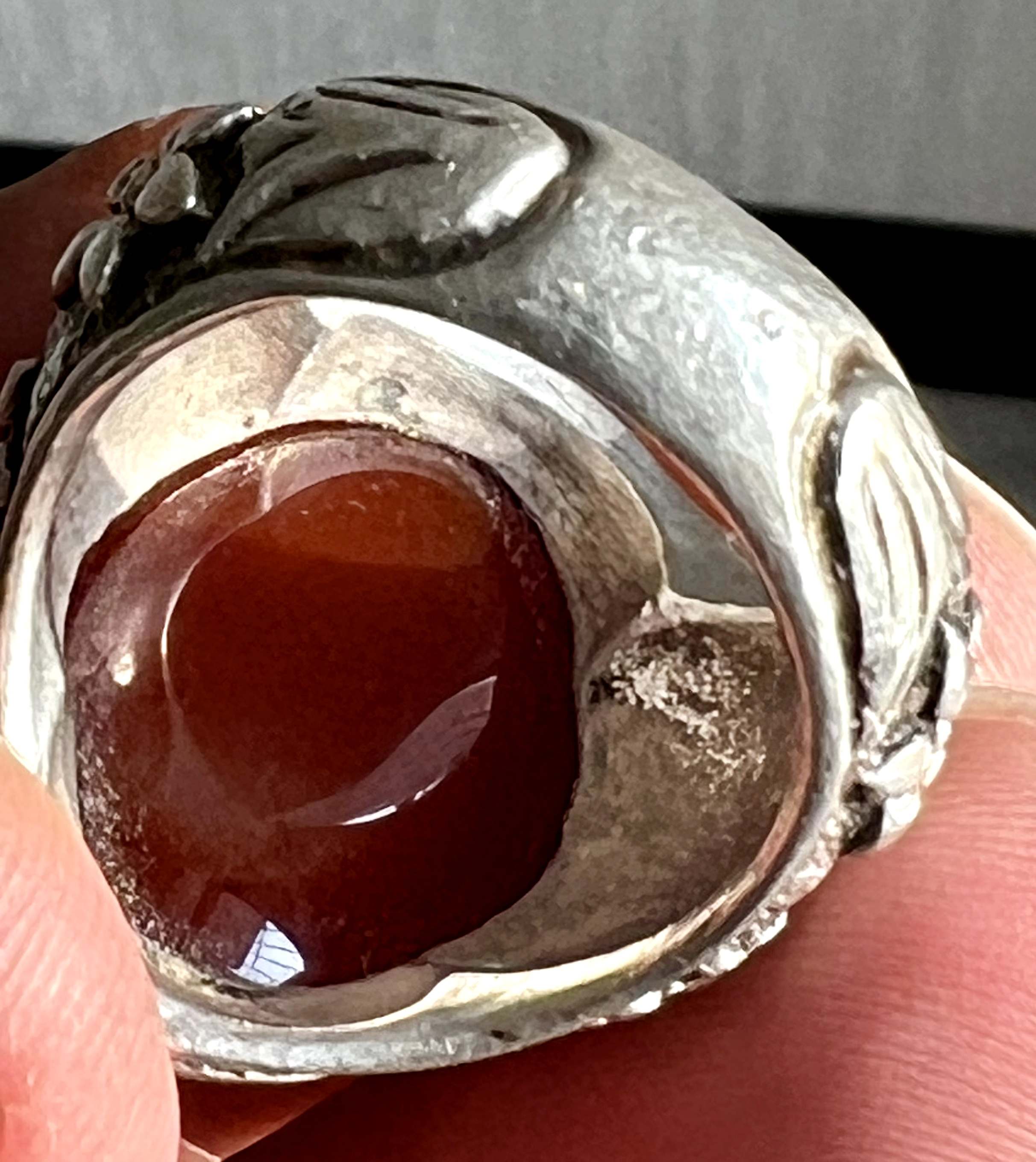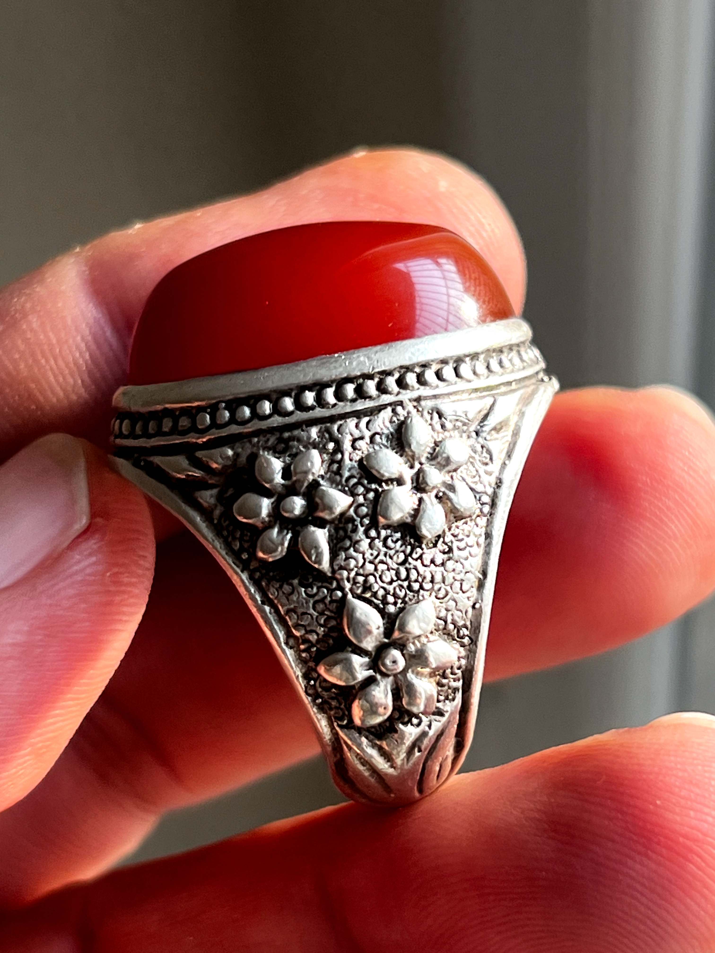 انگشتر نقره قدیمی قواره دار ، قلمزنی برجسته با عقیق کهنه کبدی یمنی
