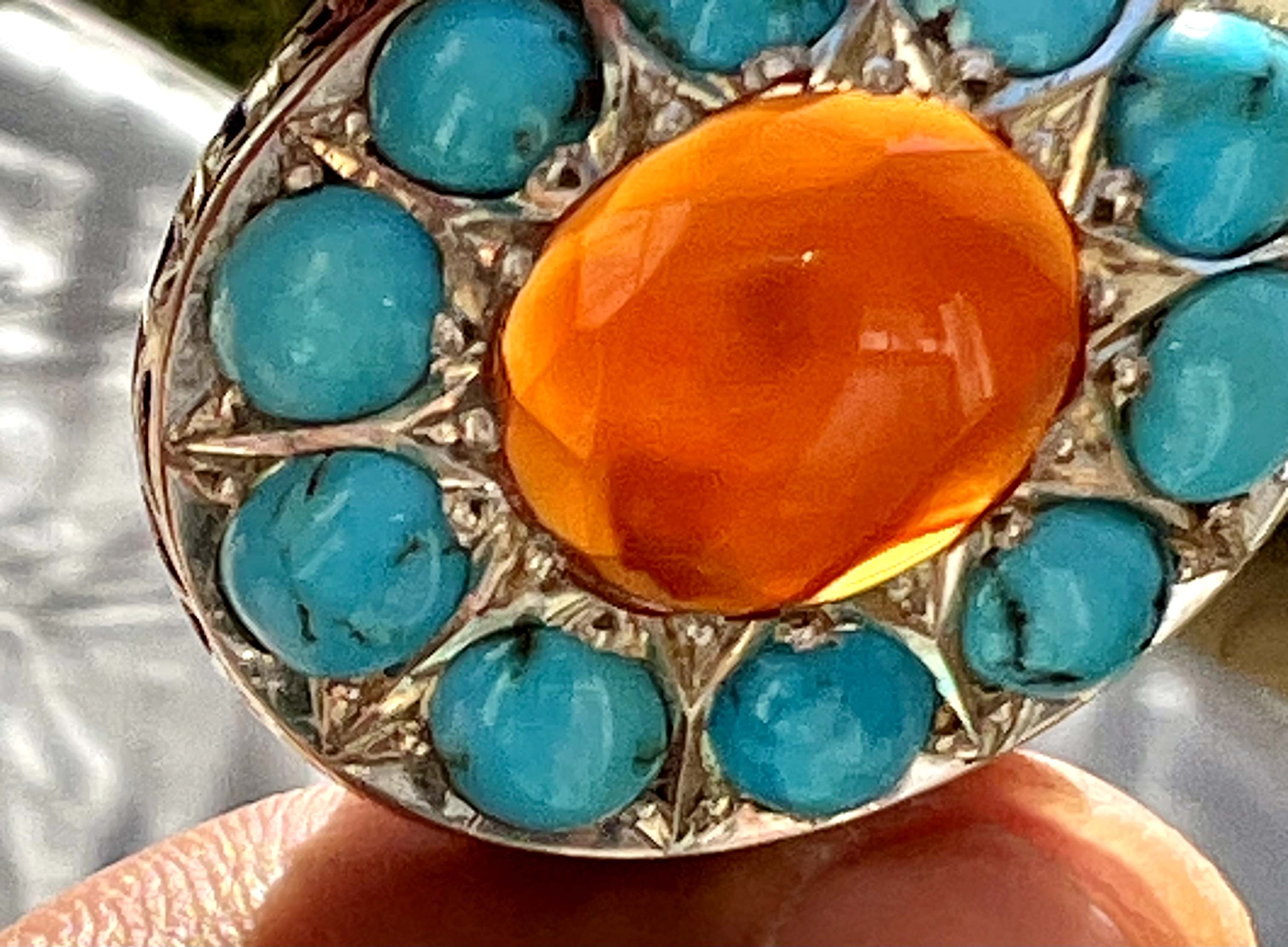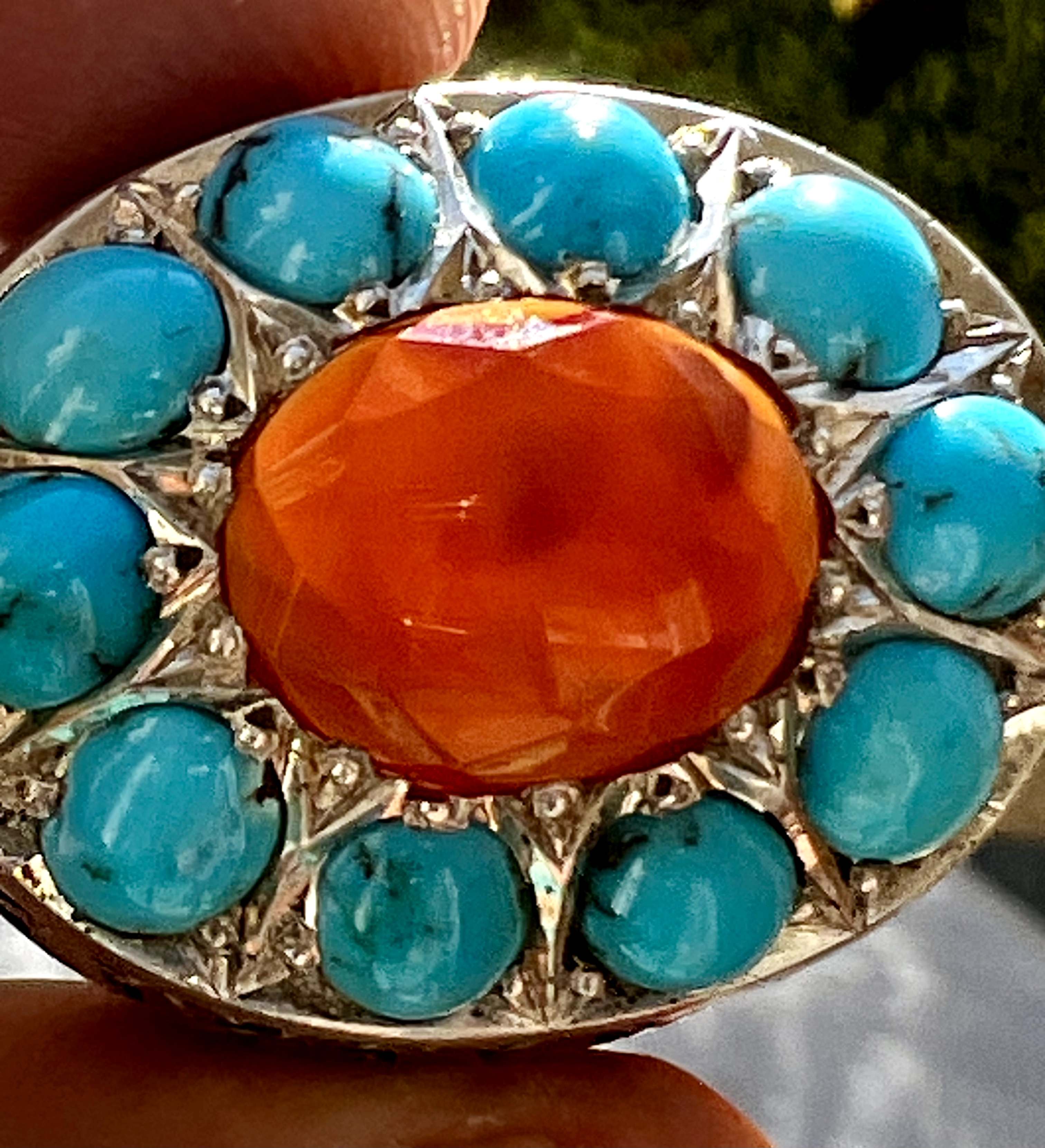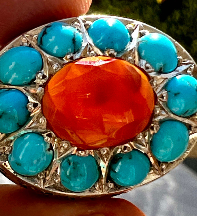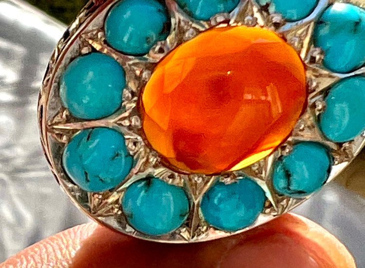 نگینهای اطراف ۱۰ عدد فیروزه ناب نیشابوری معدنی رنگ کاملا طبیعی و احیا نشده رنگ آبی آسمانی شاد اندازه متوسط ابعاد همه ۶ در ۵ میلیمتر