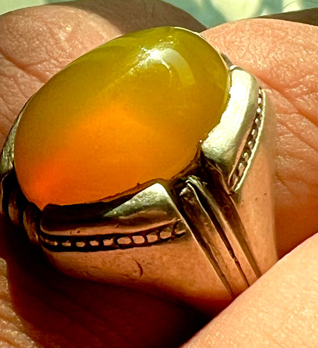 انگشتر عقیق زرد یمنی کهنه اصل رکاب اثر استاد محمد غفاری(ممی تبریز)،کلکسیونی کد ۱۴۰۶٬۵۰۰٬۰۰۰ تومان