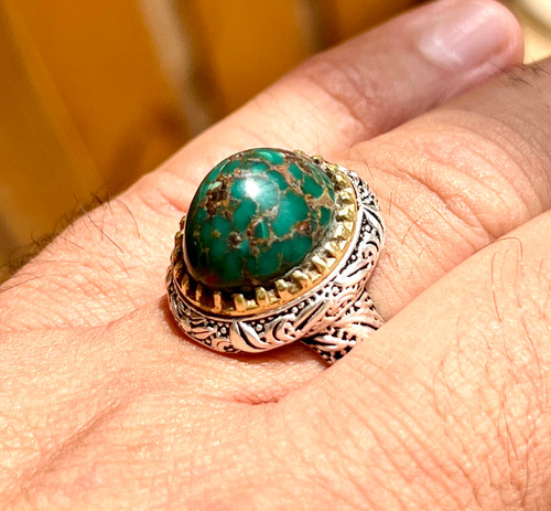 انگشتر فیروزه نیشابوری سبز رگه طلایی معدنی و کاملا اصل با رکاب قلم برجسته خاص کد ۲۷۶۳٬۴۰۰٬۰۰۰ 13%