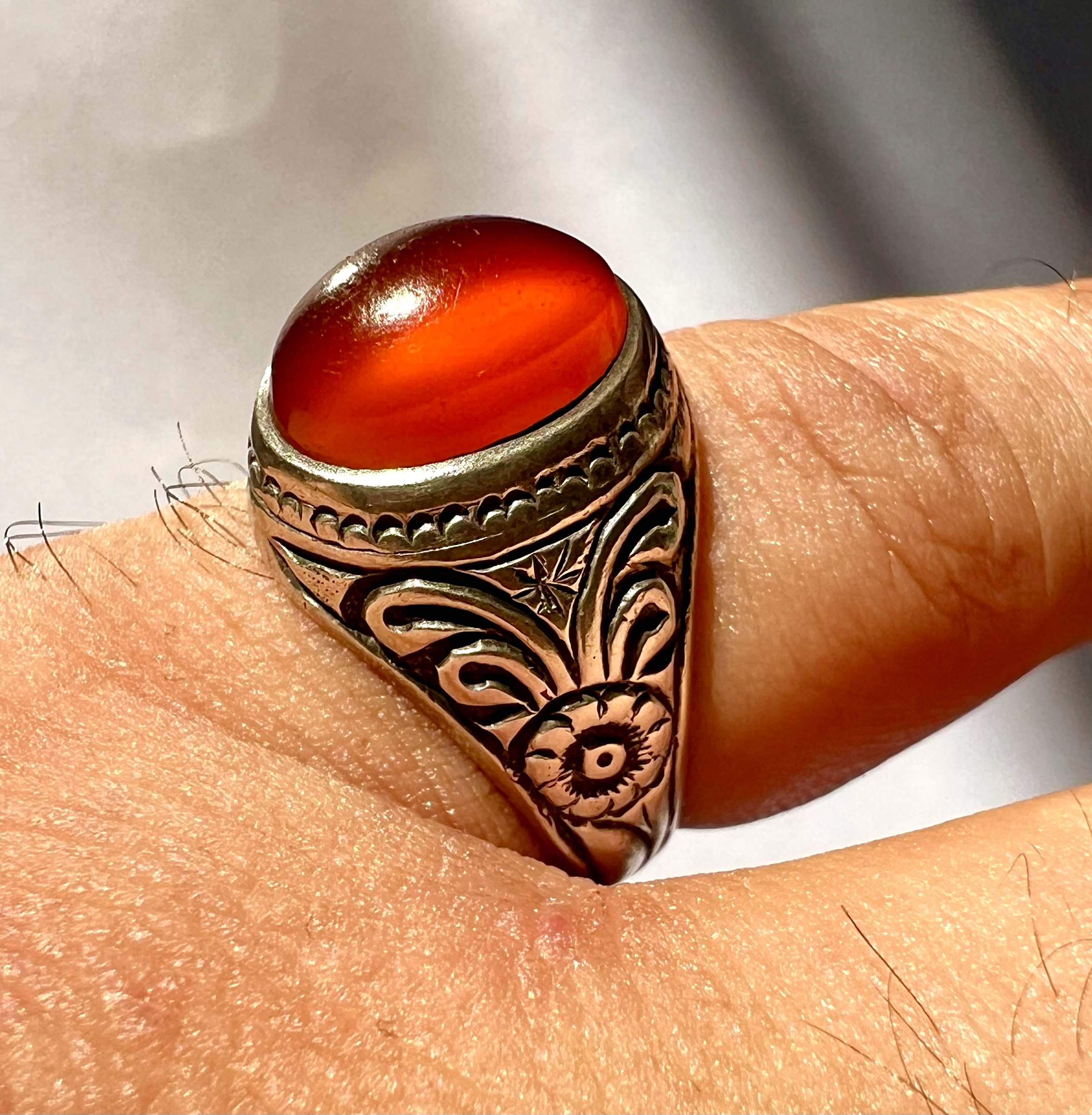 انگشتر عقیق سرخ کهنه یمن معدنی و اصیل رکاب دستی و قلمزنی اثر استاد طهماسبی کد ۱۴۶